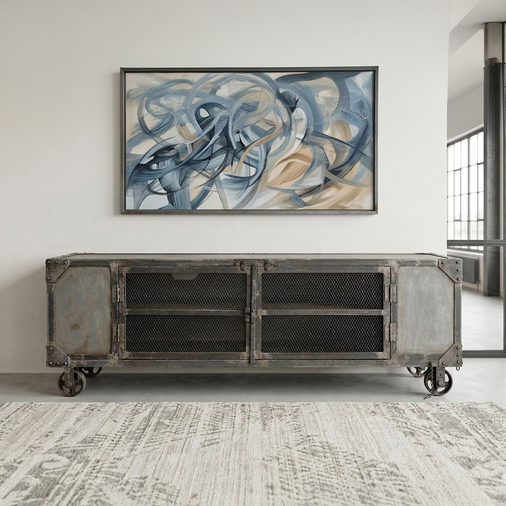 Doté d'un long plateau pour votre écran, ce meuble TV de 180 cm est percé à l’arrière sur toute la longueur pour permettre le passage des câbles de vos appareils high-tech. Installé sur quatre roulettes vintage, ce meuble de salon est très facile à déplacer. L’étagère centrale est ouverte sur toute la longueur du meuble, ce qui donne une grande flexibilité dans le choix des objets ou appareils à ranger à l’intérieur du meuble. La hauteur utile au-dessus et en dessous de l’étagère centrale est de 19cm. La structure métallique robuste confère à ce meuble TV industriel une durabilité exceptionnelle. Son aspect industriel et moderne s'intègre parfaitement dans les intérieurs contemporains ou loft, ajoutant une touche de caractère distincte.