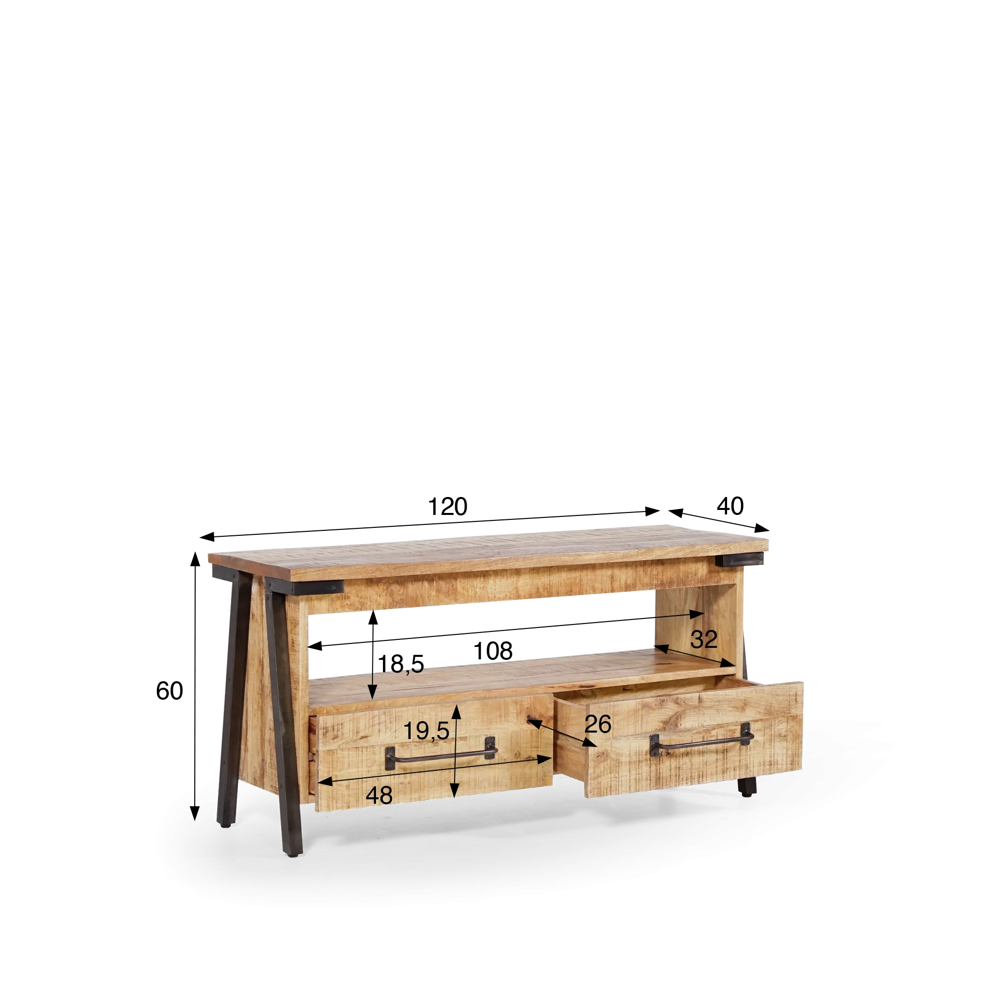 Ce meuble TV fort de son caractère brut et naturel apportera un souffle industriel à votre décoration. Son âme de meuble massif en bois naturel, noble et robuste, ravira les amoureux de meubles à la fois design et authentiques.