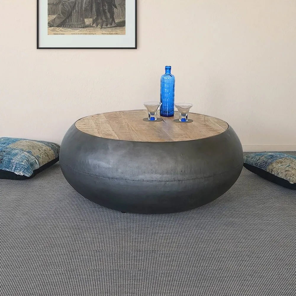 Le large volume métallique de cette table basse ronde en bois massif et métal style industriel, façonné entièrement à la main, est le premier élément que l’on remarque : une base pleine de nuances, où chaque soudure arrondie témoigne du travail minutieux de nos artisans. Nous tenions à conserver ces détails, car ils racontent la fabrication du meuble et lui donnent son authenticité. Avec ses 36 cm de hauteur, cette structure crée un socle stable et rassurant, pensé pour durer.