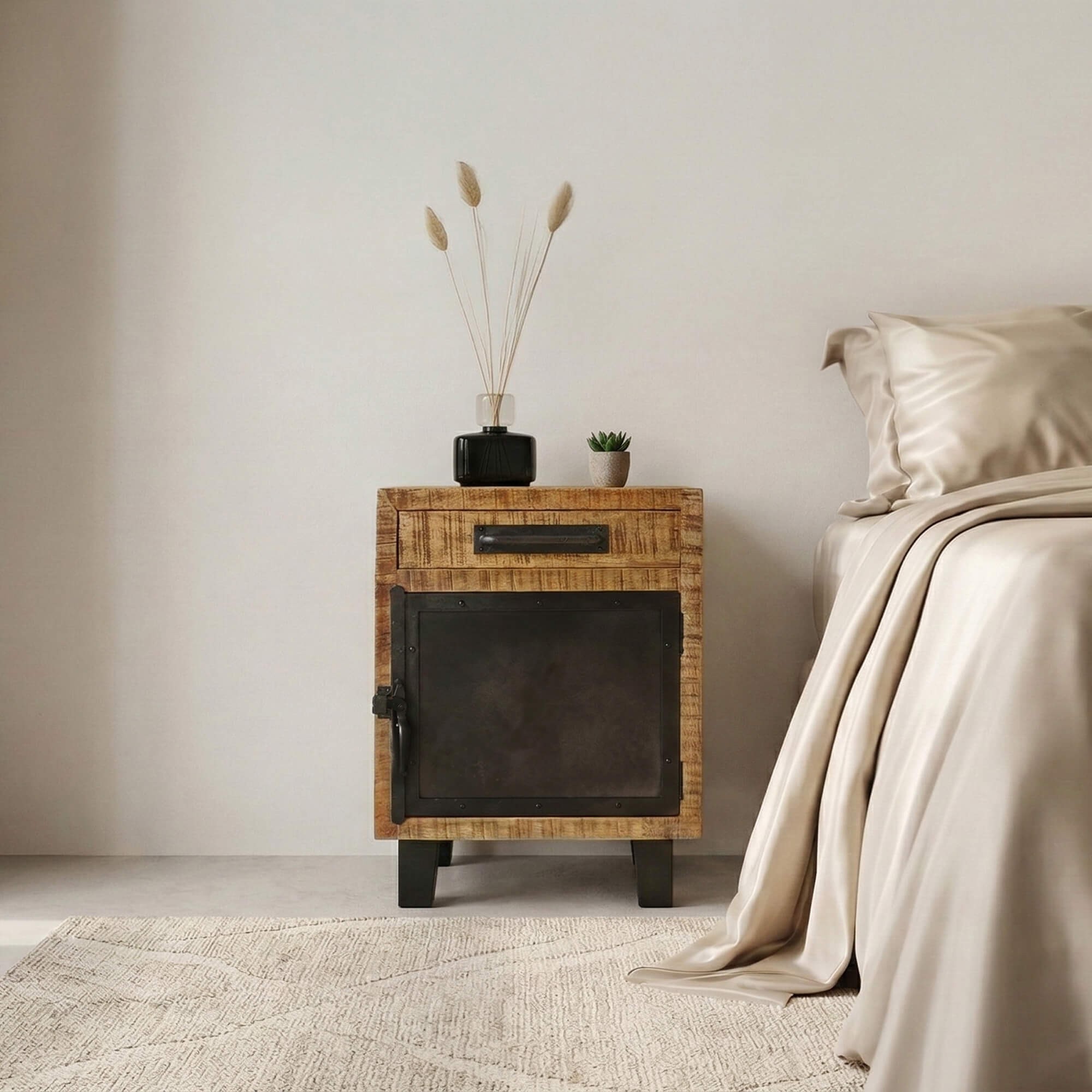 La table de nuit Brooklyn allie subtilement le bois et le métal noir, pour former un superbe meuble au design industriel qui donnera beaucoup de caractère à votre chambre.