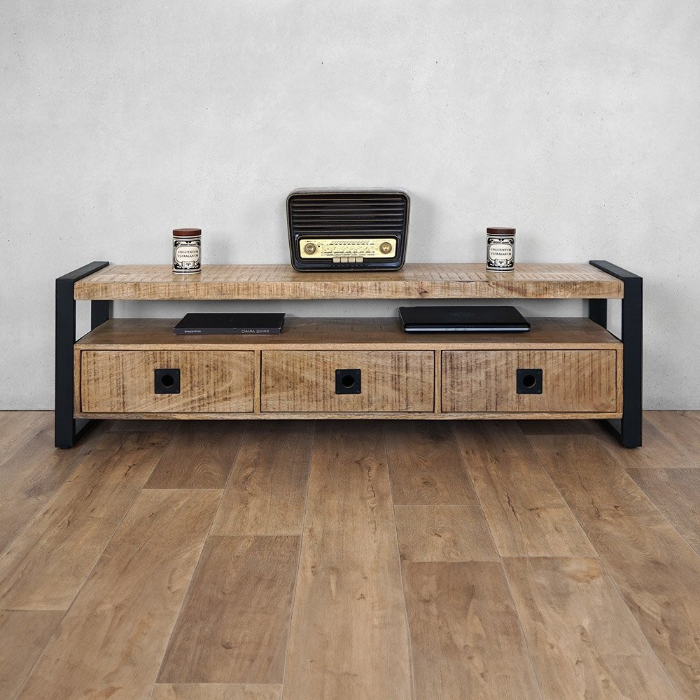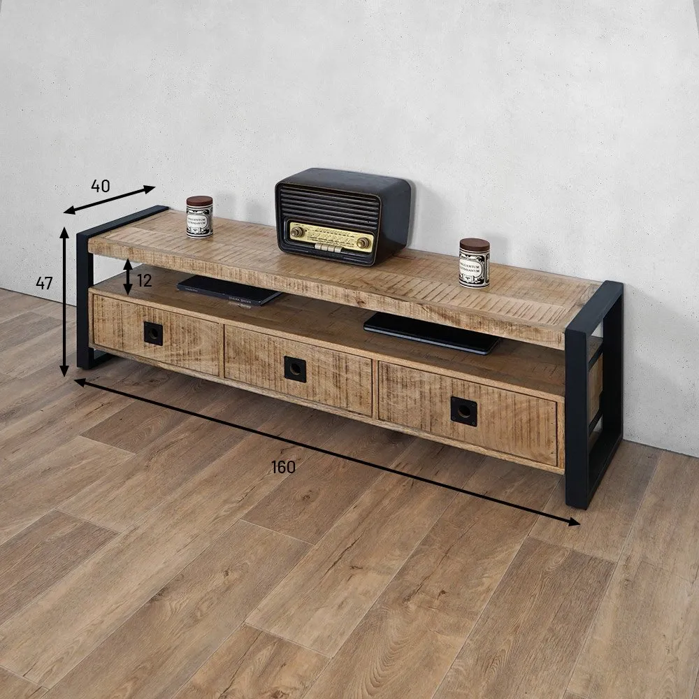 Ce magnifique meuble tv de 160 cm de long en bois de manguier est à la fois tendance et pratique et constituera un véritable point central de votre pièce.