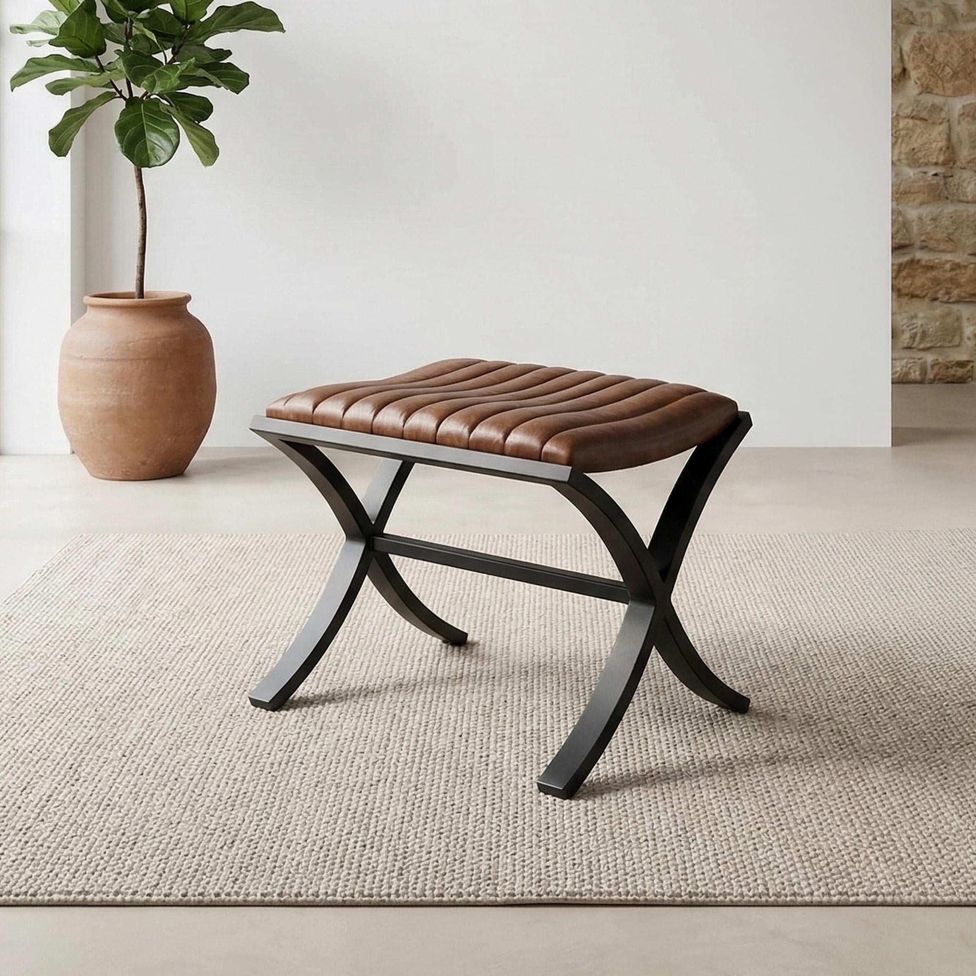 Deuxièmement, son design risque de faire pâlir d’envie les passionnés de déco. Le cuir d’un beau marron est joliment strié et le piètement en fonte arbore une belle forme croisée.