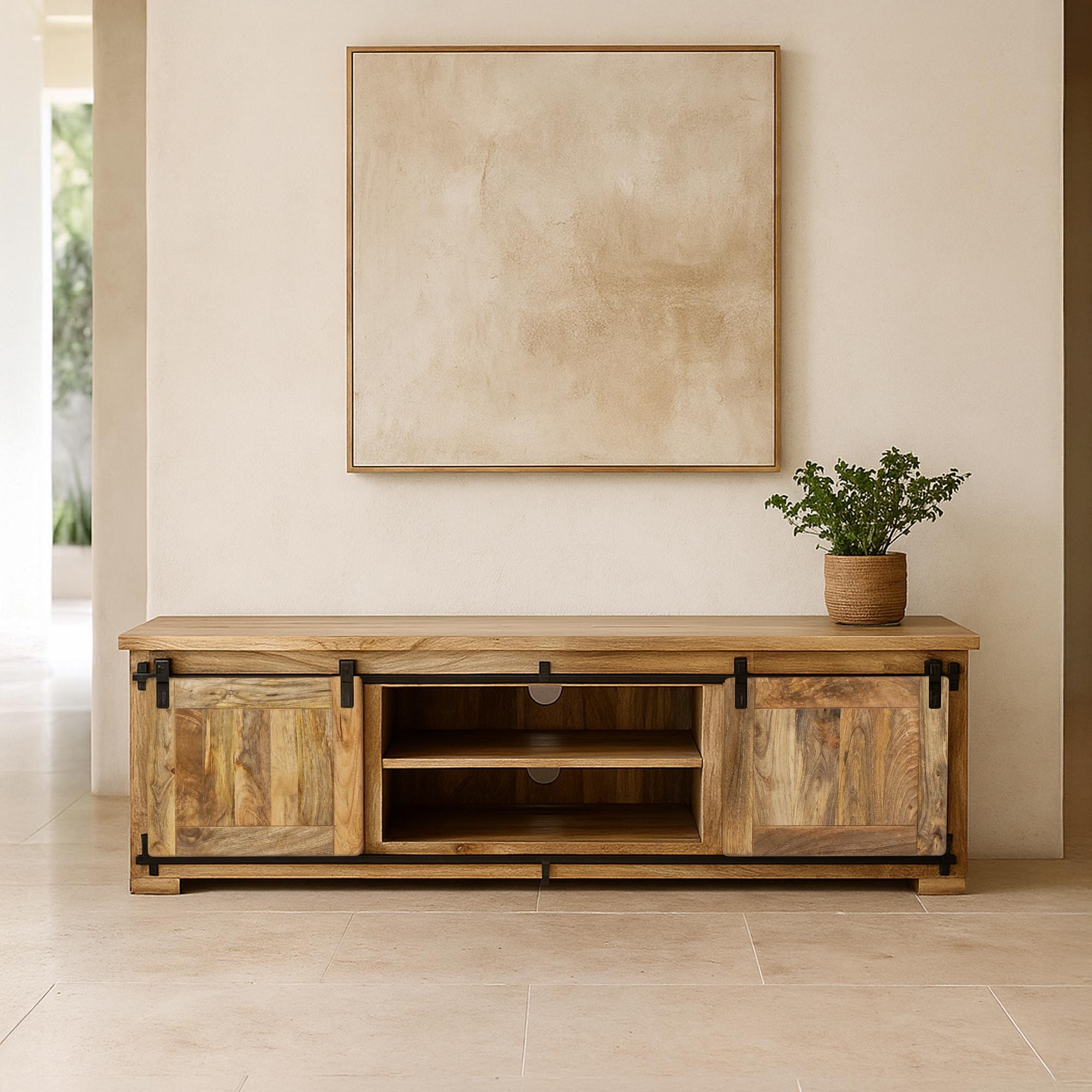 Fabriqué avec soin en bois de manguier massif et en métal de haute qualité, ce meuble TV incarne l'élégance brute du style industriel. Le bois de manguier massif garantit une durabilité exceptionnelle et une beauté naturelle incomparable, tandis que les accents en métal noir ajoutent une touche authentique et moderne à l'ensemble.