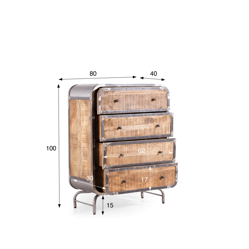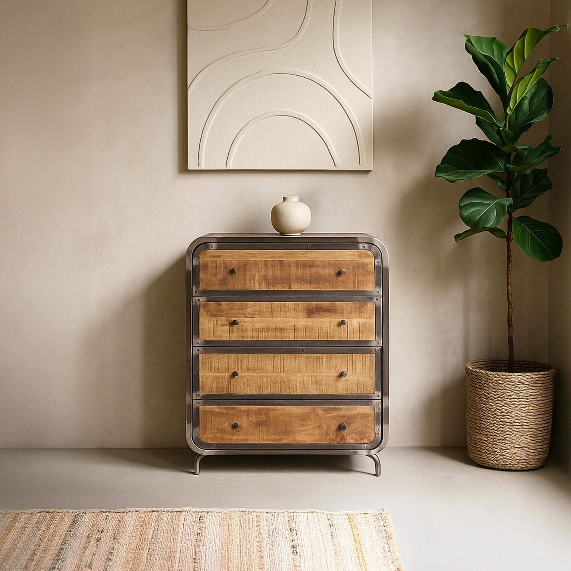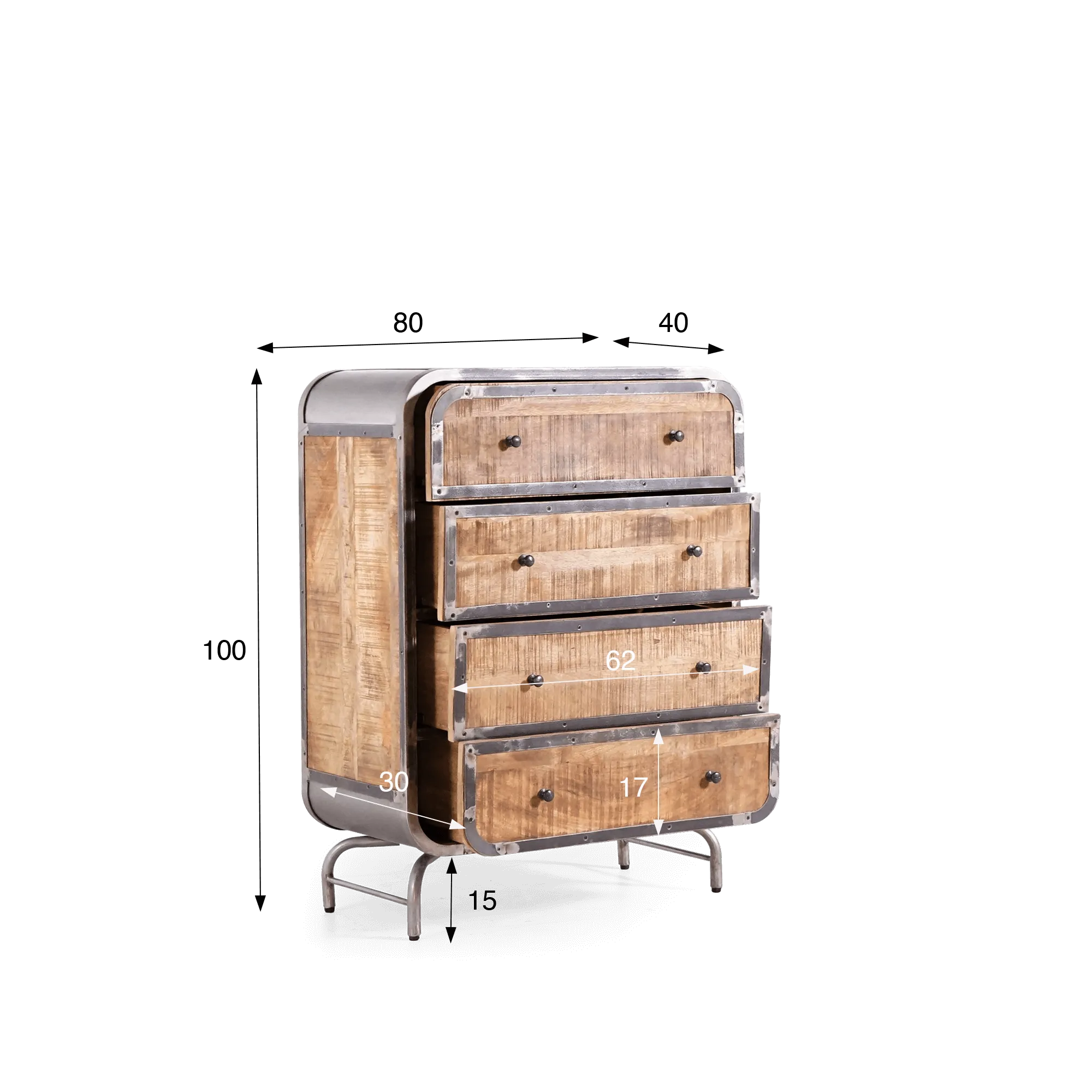 Fabriqué avec soin en bois de manguier massif et en métal de haute qualité, le petit buffet Manchester incarne l'élégance du style industriel. Le bois de manguier, apprécié pour sa solidité et sa résistance, confère à ce meuble une beauté naturelle et une durabilité incomparable. Les finitions en métal, qui soulignent les contours et ornent les poignées des quatre tiroirs, ajoutent une touche de contraste visuel élégant qui rend ce petit buffet unique en son genre.