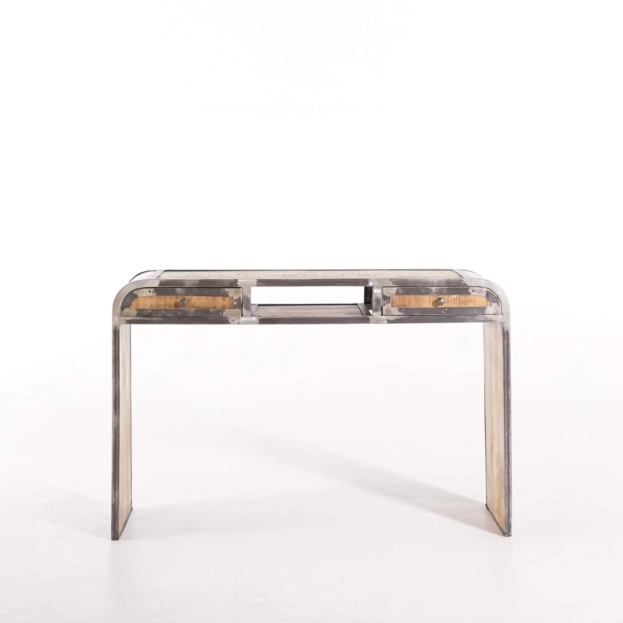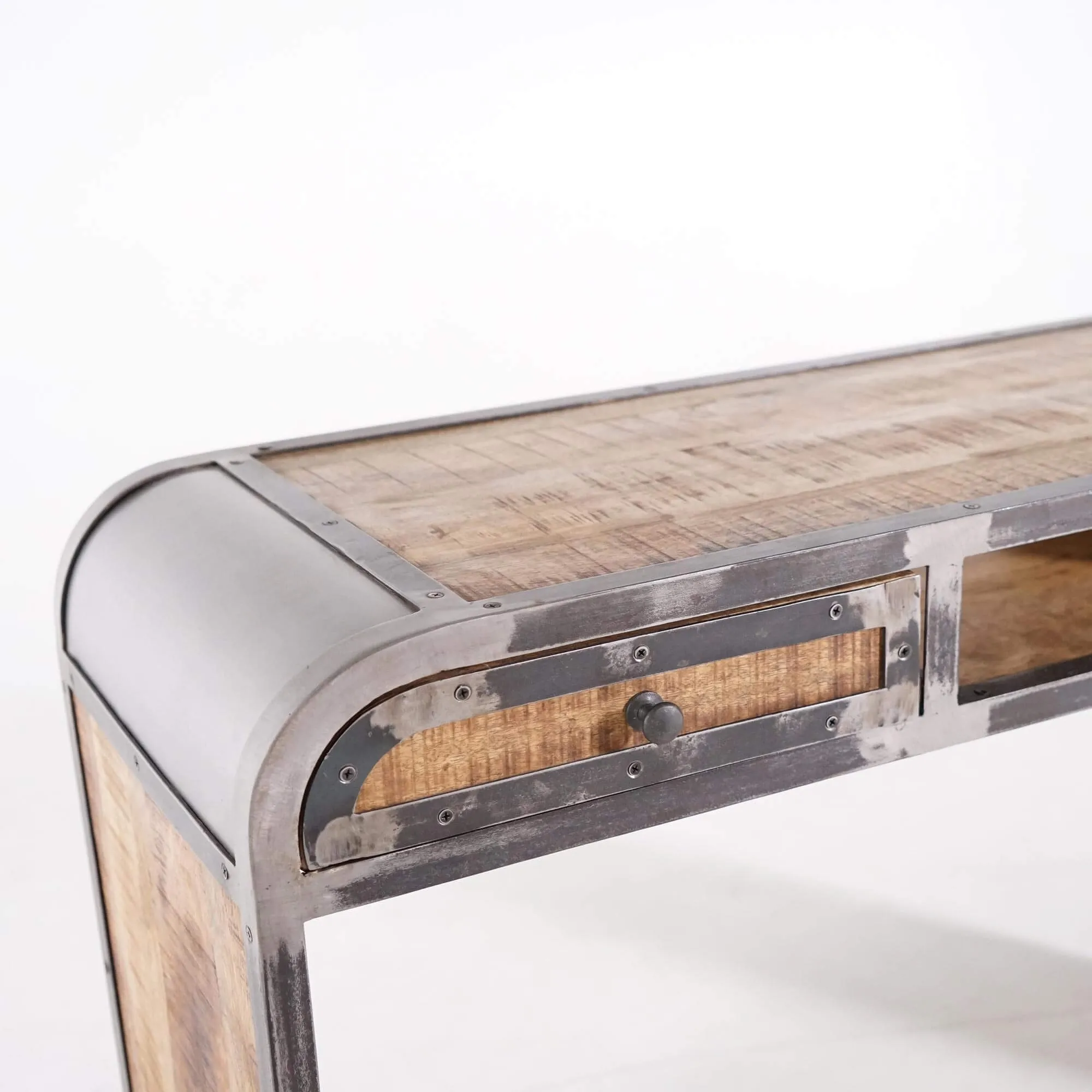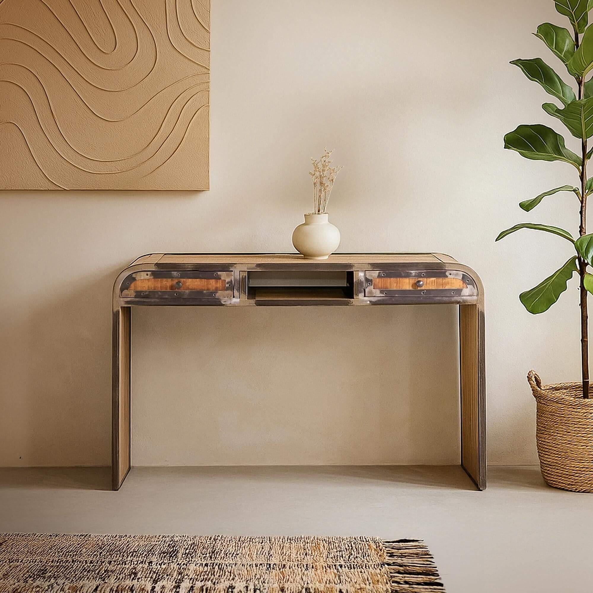 Les finitions en métal confèrent à la console Manchester une allure sophistiquée et authentique. Les contours du meuble ainsi que les poignées des tiroirs aux extrémités sont en métal, ajoutant une touche de contraste visuel élégant.