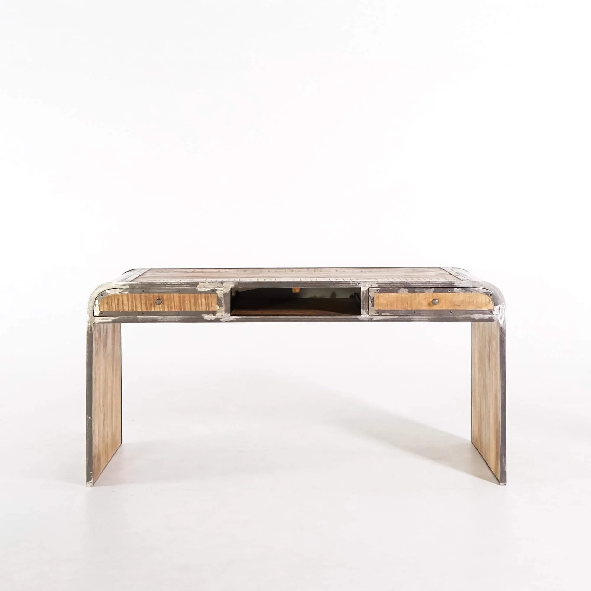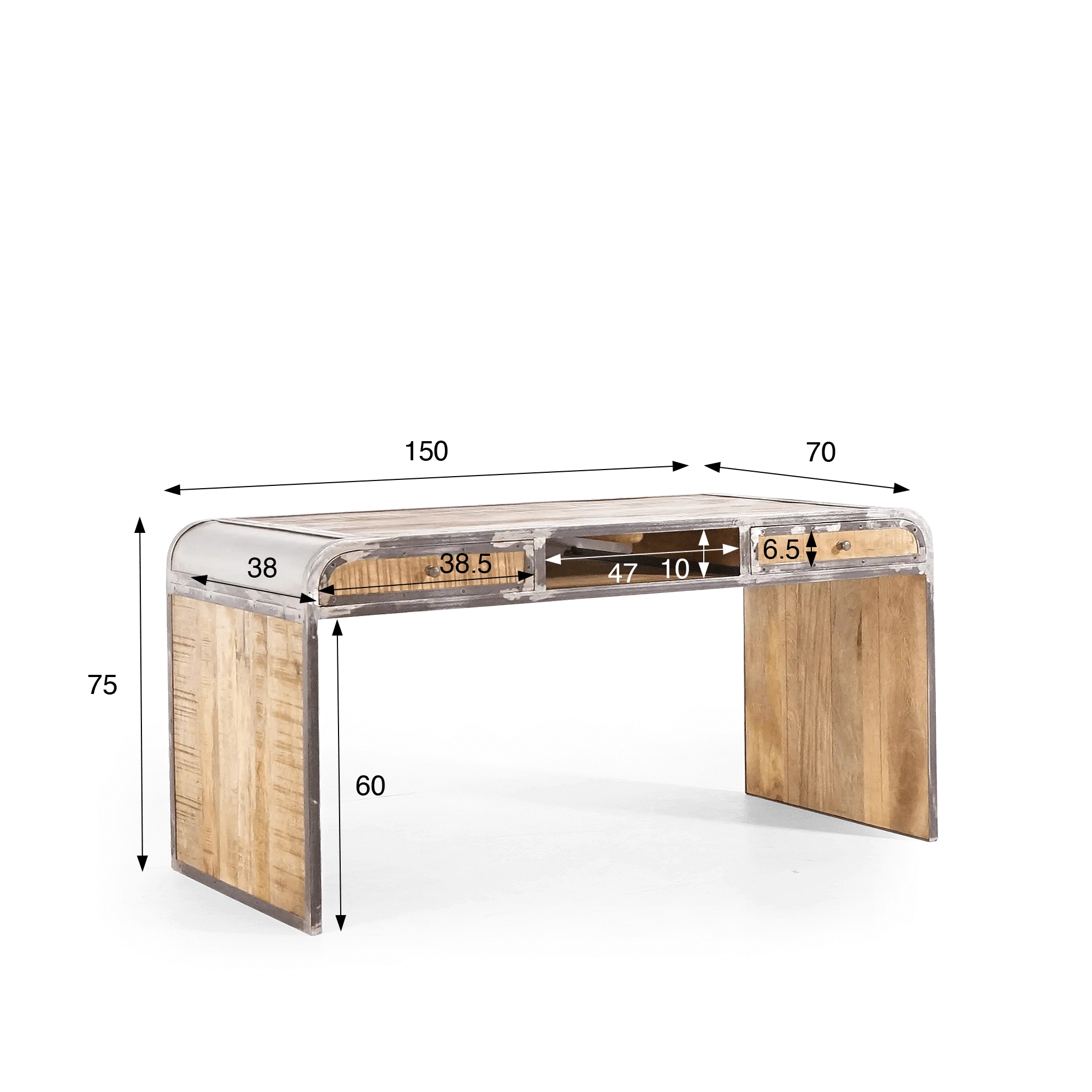 Ce bureau est conçu pour répondre à vos besoins de rangement. Il dispose de deux tiroirs aux extrémités, offrant un espace pratique pour organiser vos fournitures de bureau, vos documents ou autres petits objets. Au centre du bureau, vous trouverez un rangement ouvert, sans tiroir, offrant un espace polyvalent pour vos dossiers, vos livres ou même votre ordinateur portable.