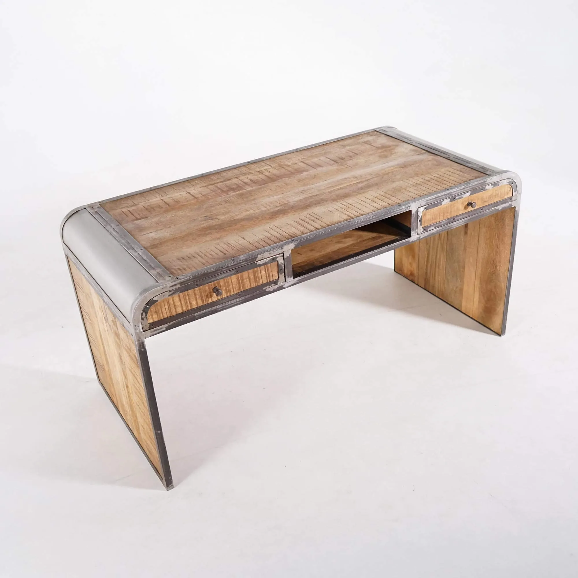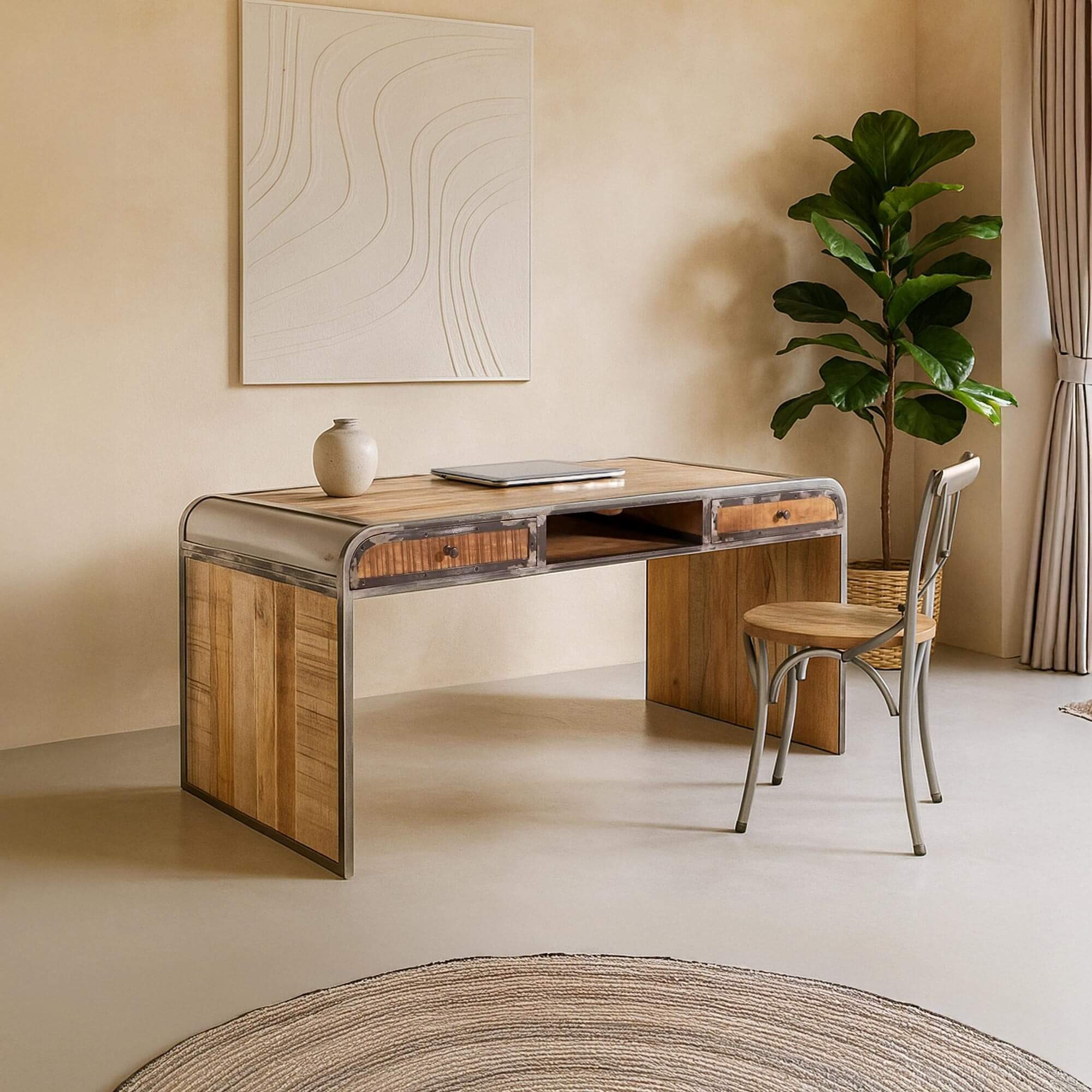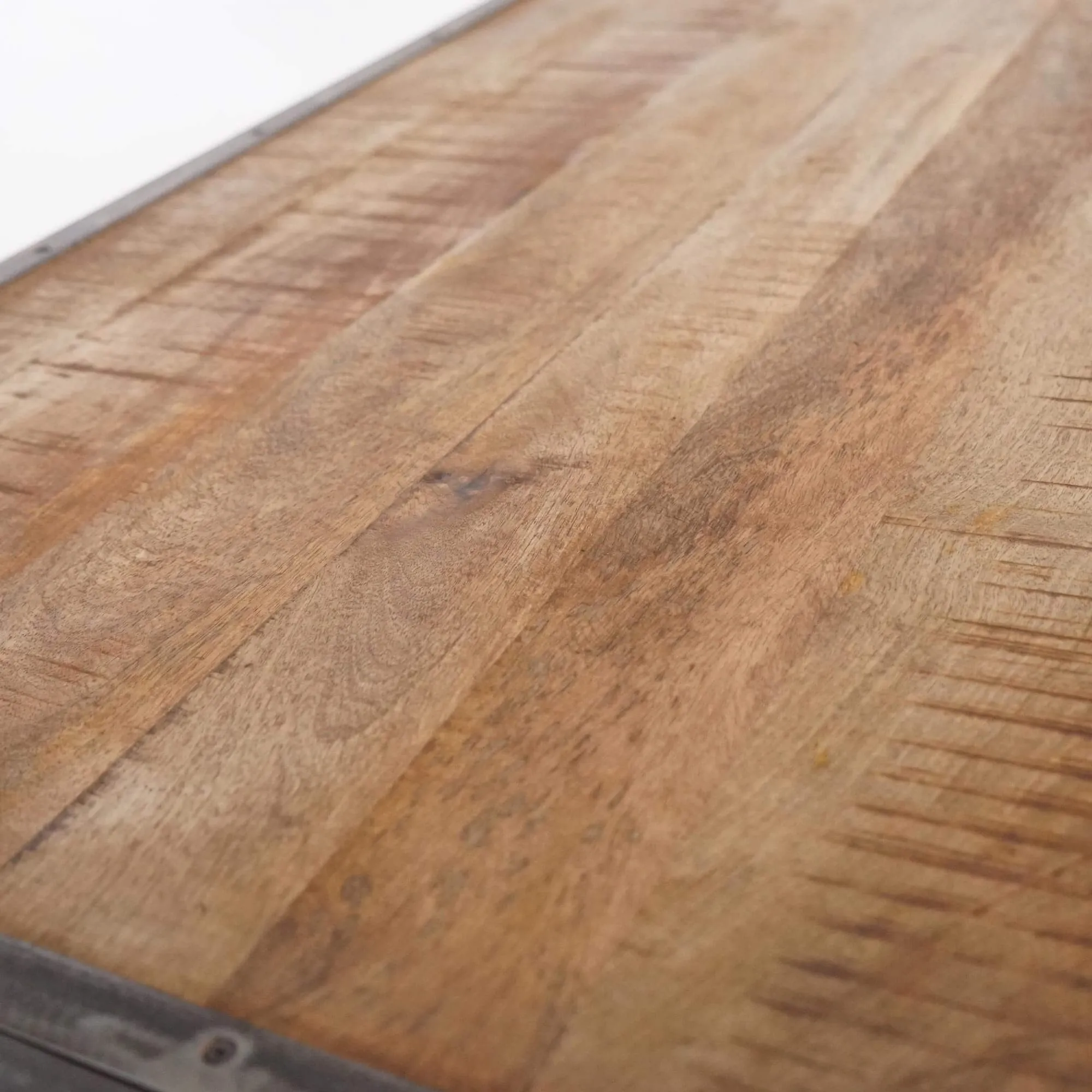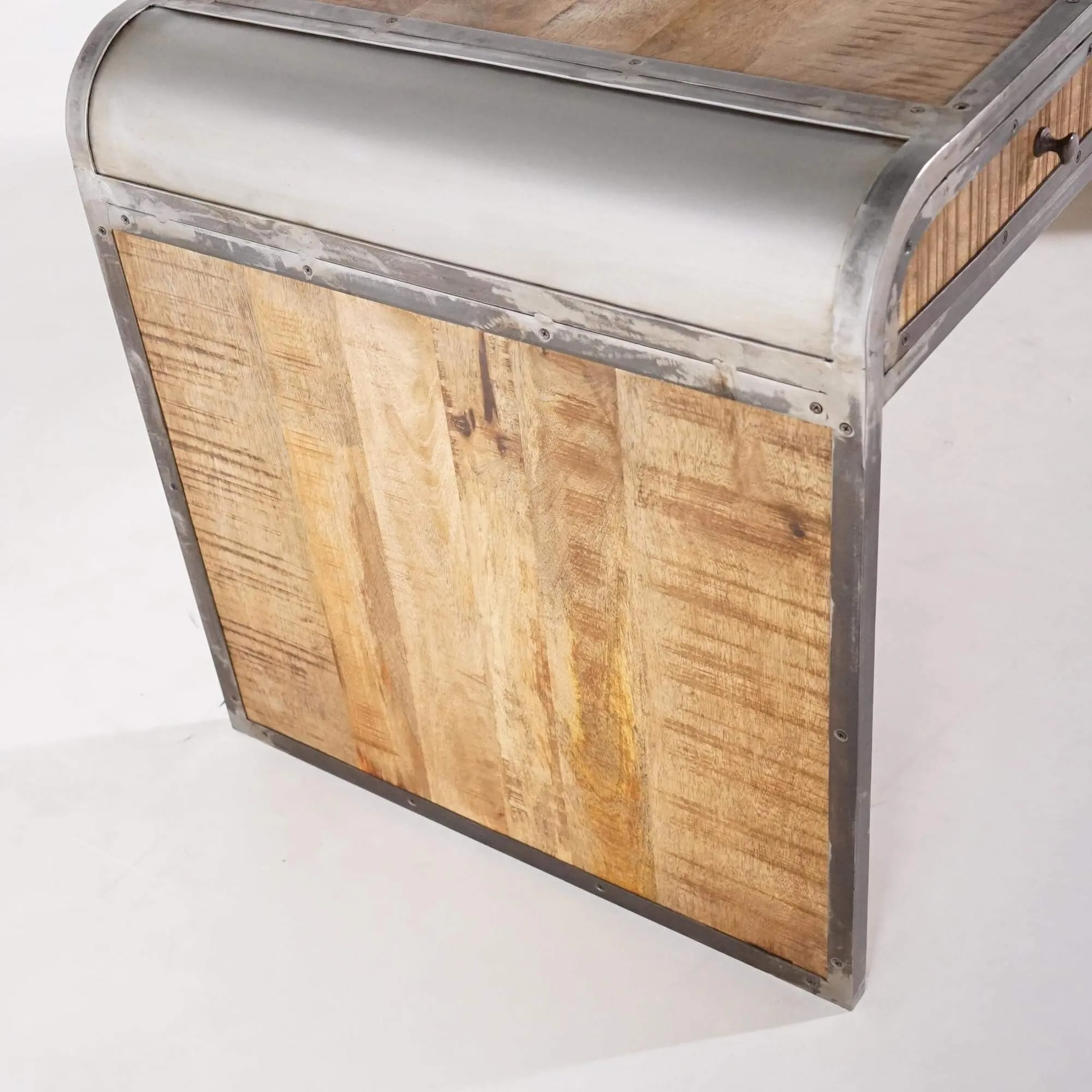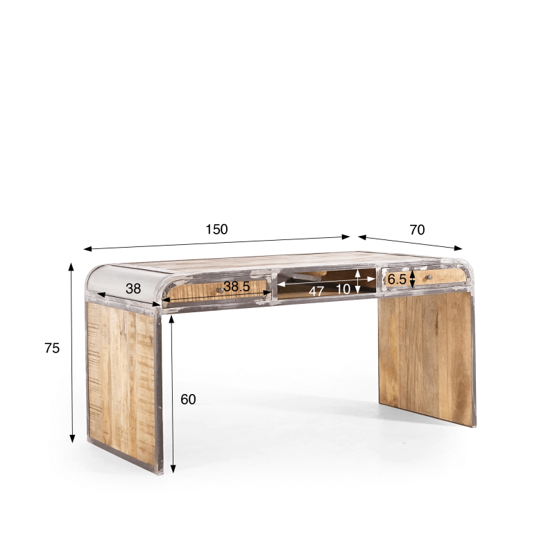 Le bureau Manchester se distingue par ses côtés courbés, qui apportent une touche d'originalité à sa silhouette. Fabriqué en bois de manguier, il offre à la fois une beauté naturelle et une durabilité exceptionnelle. Le manguier est réputé pour sa solidité et sa résistance, garantissant que ce bureau vous accompagnera pendant de nombreuses années. Les finitions naturelles du métal confèrent au bureau Manchester une allure sophistiquée et moderne. Les contours du meuble ainsi que les poignées des deux tiroirs sont en métal, ajoutant une touche de contraste visuel élégant.