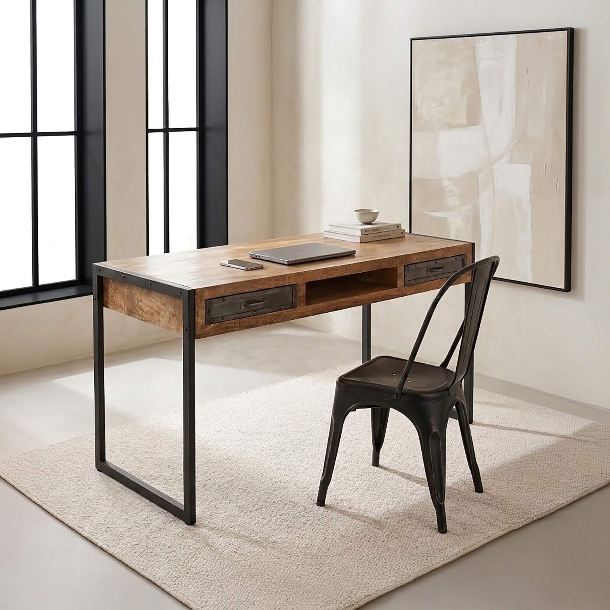 Le corps du bureau est fabriqué en manguier massif. De part et d’autre de la tablette, vous y découvrirez 2 tiroirs en métal noir. Au centre, un niche ouverte est prévue pour pouvoir y installer vos documents, clavier, souris et autres petit matériel de bureau que vous souhaitez avoir sous la main rapidement.