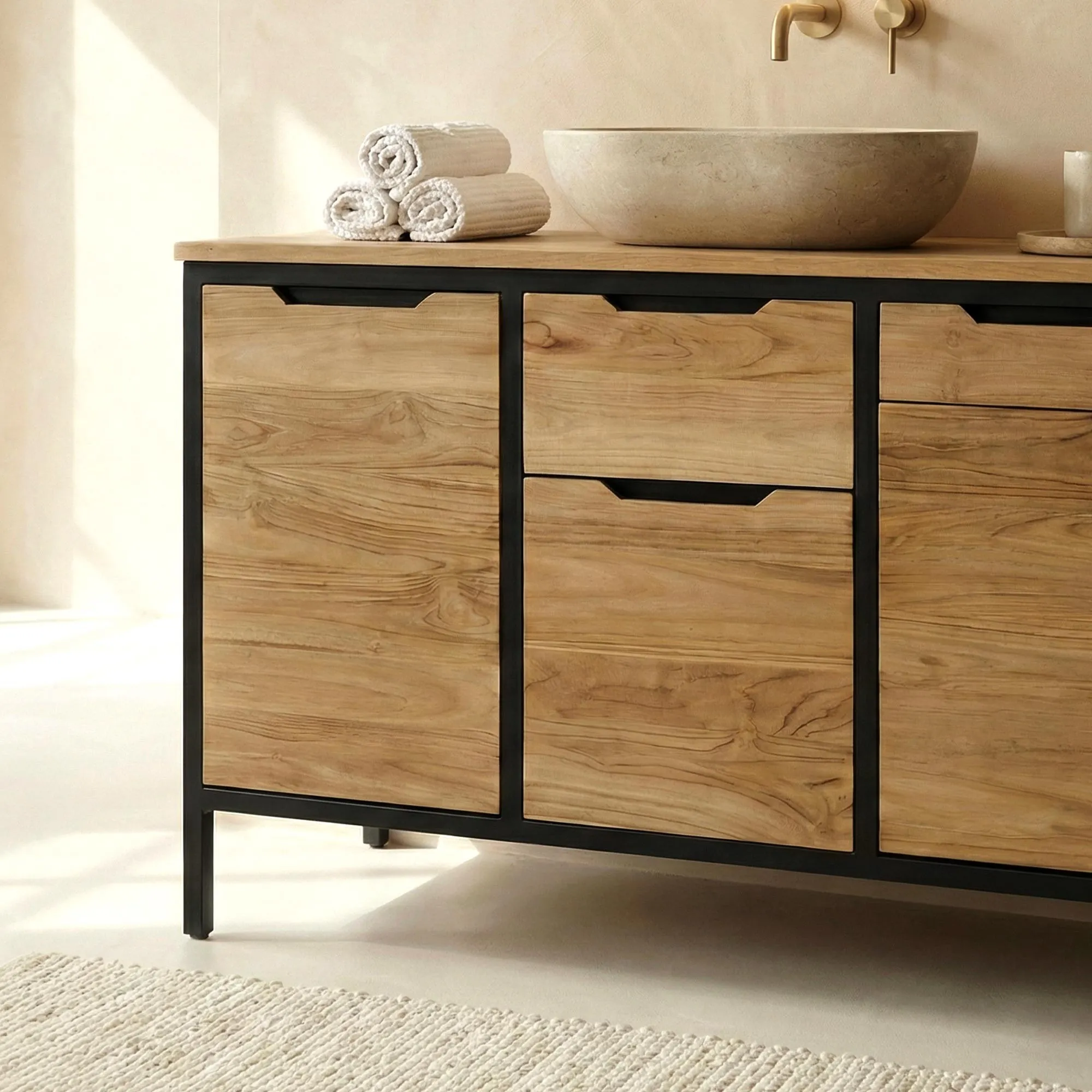 Ce meuble de salle de bain de 120 cm de long fait partie de la collection Bold. De style industriel, fabriqué en teck massif et métal, ce meuble sous vasque fera une entrée remarquée dans un intérieur contemporain.