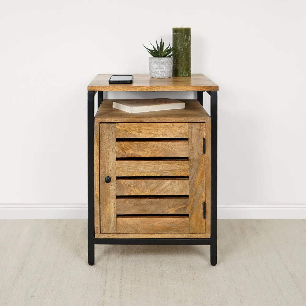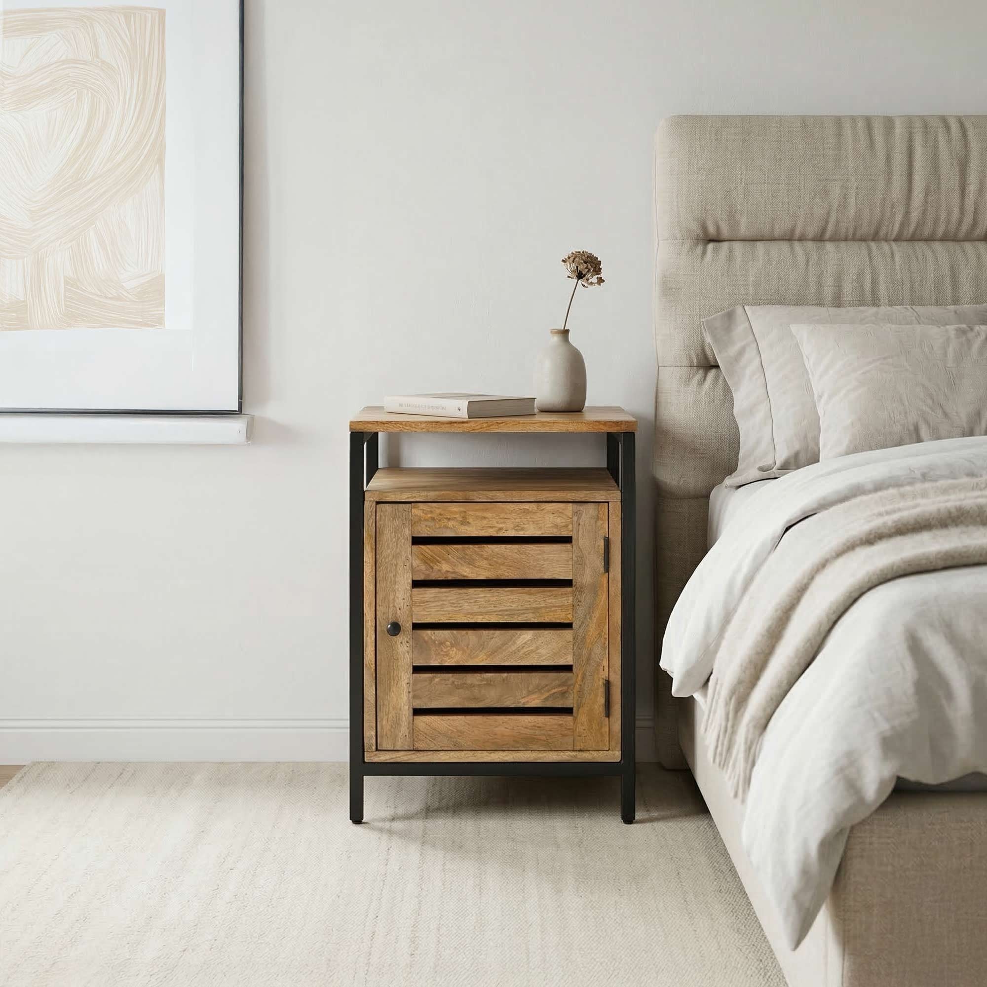 Cette table de nuit en bois naturel et métal allie élégance rustique et fonctionnalité moderne, rendant hommage au style industriel tout en incorporant des éléments de design « farmhouse ». Le meuble est conçu en bois massif de manguier, connu pour sa robustesse et son grain riche, ce qui lui confère un caractère distinct et une présence chaleureuse dans toute chambre à coucher.