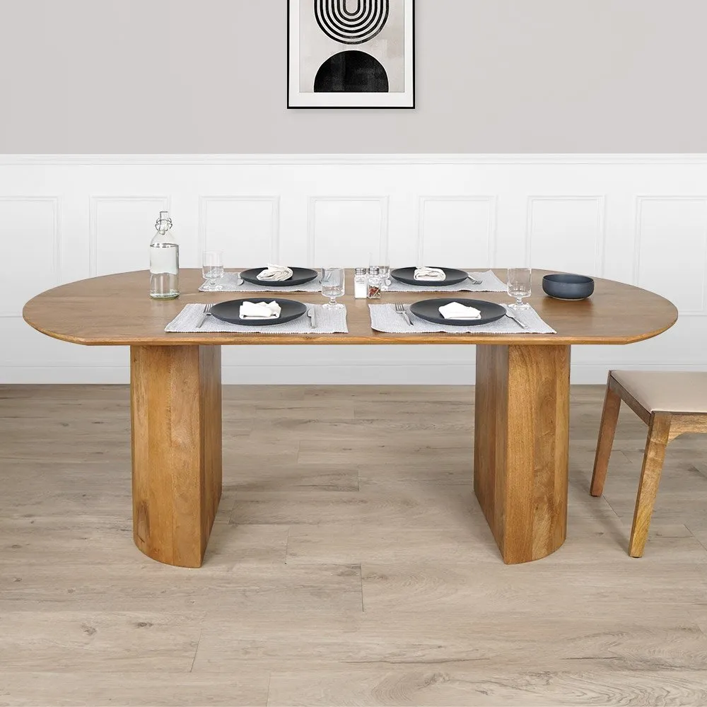 Le plateau ovale de cette table ajoute une touche de légèreté à votre salle à manger, tandis que les deux pieds en demi-cercles en bois de manguier apportent une note organique. La simplicité de son design est précisément ce qui fait le charme de cette pièce, créant un point focal qui se marie parfaitement avec différents styles de décoration. Ses lignes épurées travaillées en relief, présentes sur les pieds de cette table ovale, ajoutent une note de minimalisme qui lui confère un charme unique.