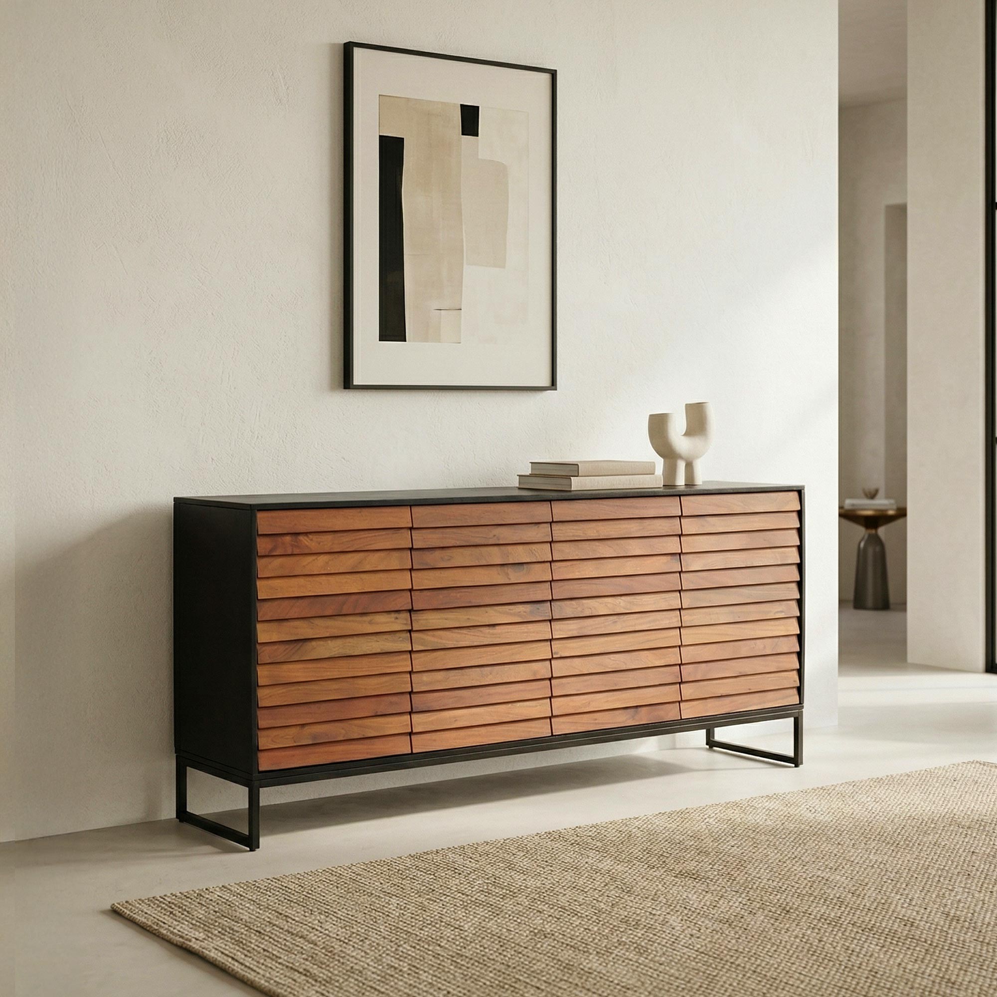 Le design du buffet est rehaussé par une base en métal noir, qui non seulement offre une solidité remarquable mais ajoute également une touche moderne essentielle. Cette base métallique, en élevant légèrement le buffet, facilite le nettoyage sous le meuble et crée un contraste visuel saisissant qui met en valeur la légèreté du design malgré la robustesse de sa construction.