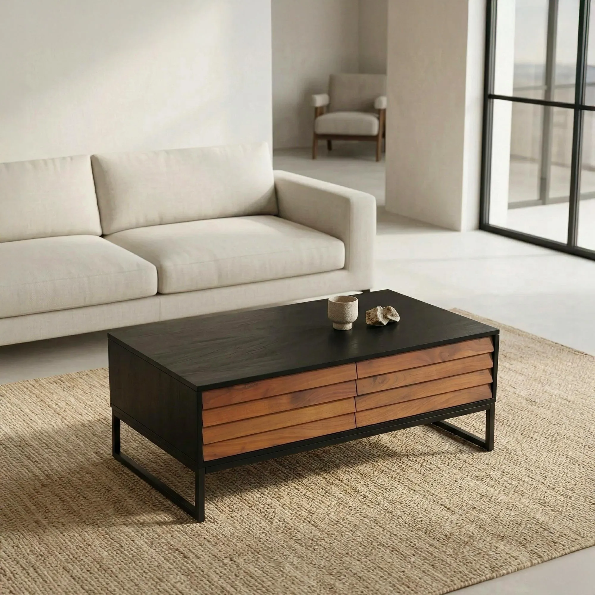 Les tiroirs de la table, fabriqués en bois d'acacia, offrent un contraste de couleur et de grain qui enrichit l'esthétique de la table tout en soulignant son design moderne. Ces tiroirs sont équipés d'un système d'ouverture push-pull, une fonctionnalité qui permet un accès facile sans l'utilisation de poignées externes, conservant ainsi une façade épurée et minimaliste. Les quatre tiroirs spacieux, deux de chaque côté, offrent un espace de rangement ample et discret, parfait pour stocker magazines, télécommandes et autres nécessités quotidiennes.