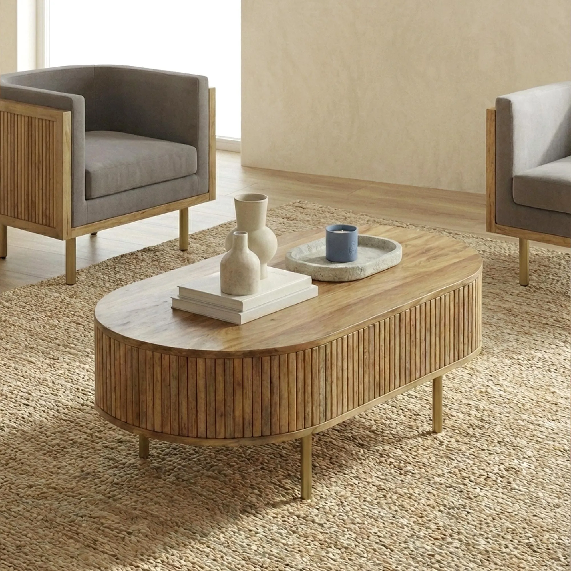 Le design de la table présente une forme ovale, douce et invitante, qui contraste agréablement avec la robustesse du bois. La façade est ornée de lamelles de bois disposées verticalement, ajoutant une texture visuelle intéressante qui attire le regard sans surcharger. Les pieds de la table sont en métal fini laiton, offrant un léger éclat métallique qui complète à merveille les tons chauds du bois. Cette touche de laiton n’est pas seulement esthétique, elle assure également une stabilité robuste.