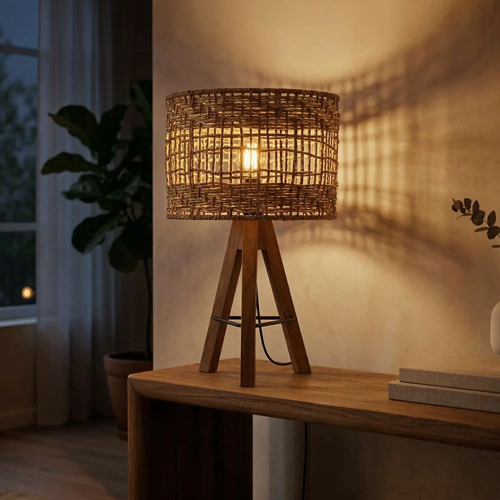 L'abat-jour en rotin tressé laisse subtilement apparaître l'ampoule à travers ses entrelacements, créant ainsi une atmosphère chaleureuse et apaisante. Le mariage entre la texture brute du bois et la légèreté du rotin confère à cette lampe un charme intemporel qui se marie aussi bien avec des intérieurs modernes que plus traditionnels. Parfaitement équilibrée entre design artisanal et fonctionnalité, elle s'intègre facilement dans un salon, une chambre ou un espace de travail, ajoutant une touche naturelle et chic à votre décoration.