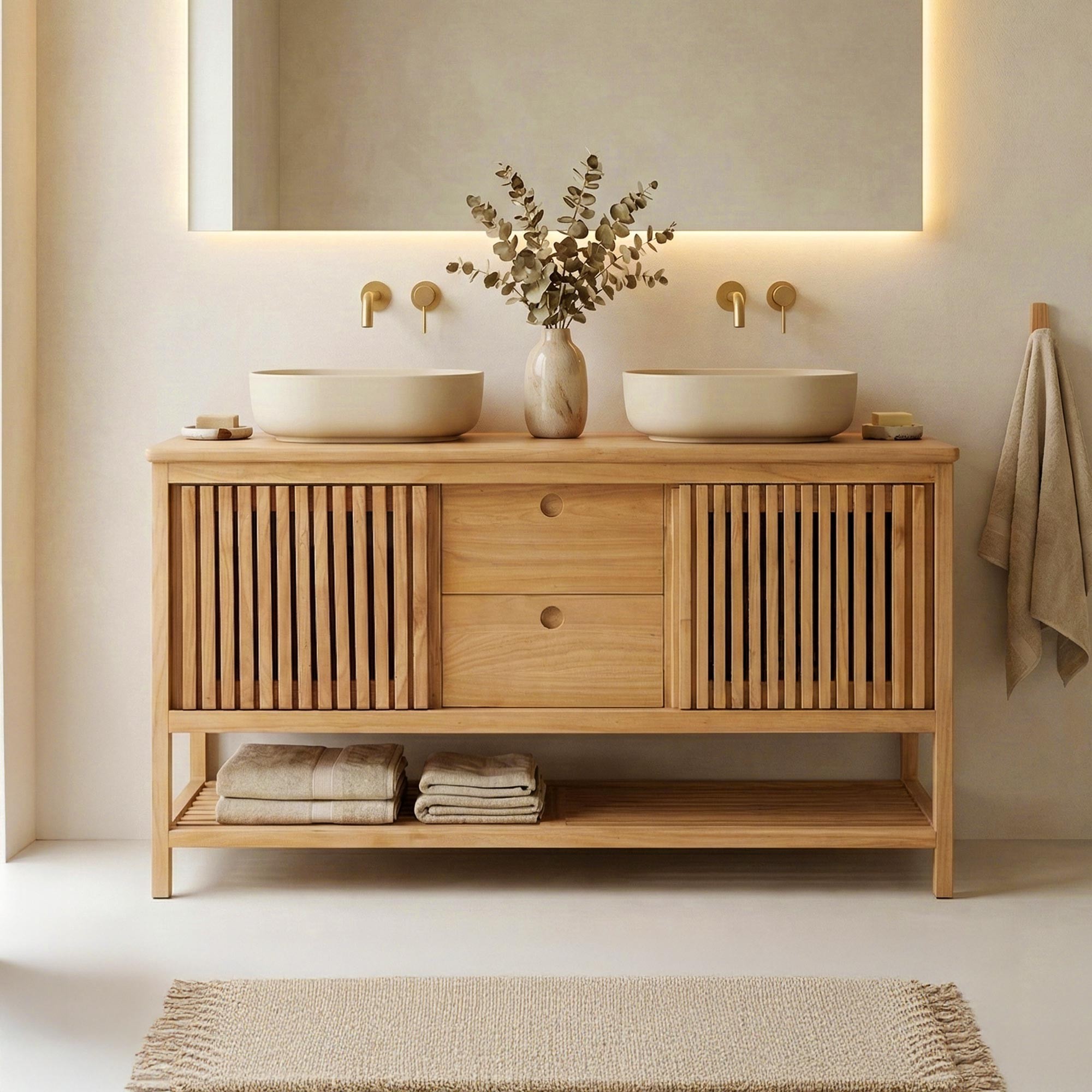 Apportez une touche de design scandinave à votre salle de bain avec le meuble sous vasque 140cm Rohini, une création qui allie fonctionnalité et esthétique naturelle. Conçu en bois massif de mindi, ce meuble reflète un savoir-faire artisanal remarquable, mettant en avant les nervures subtiles et la chaleur de ce bois durable.