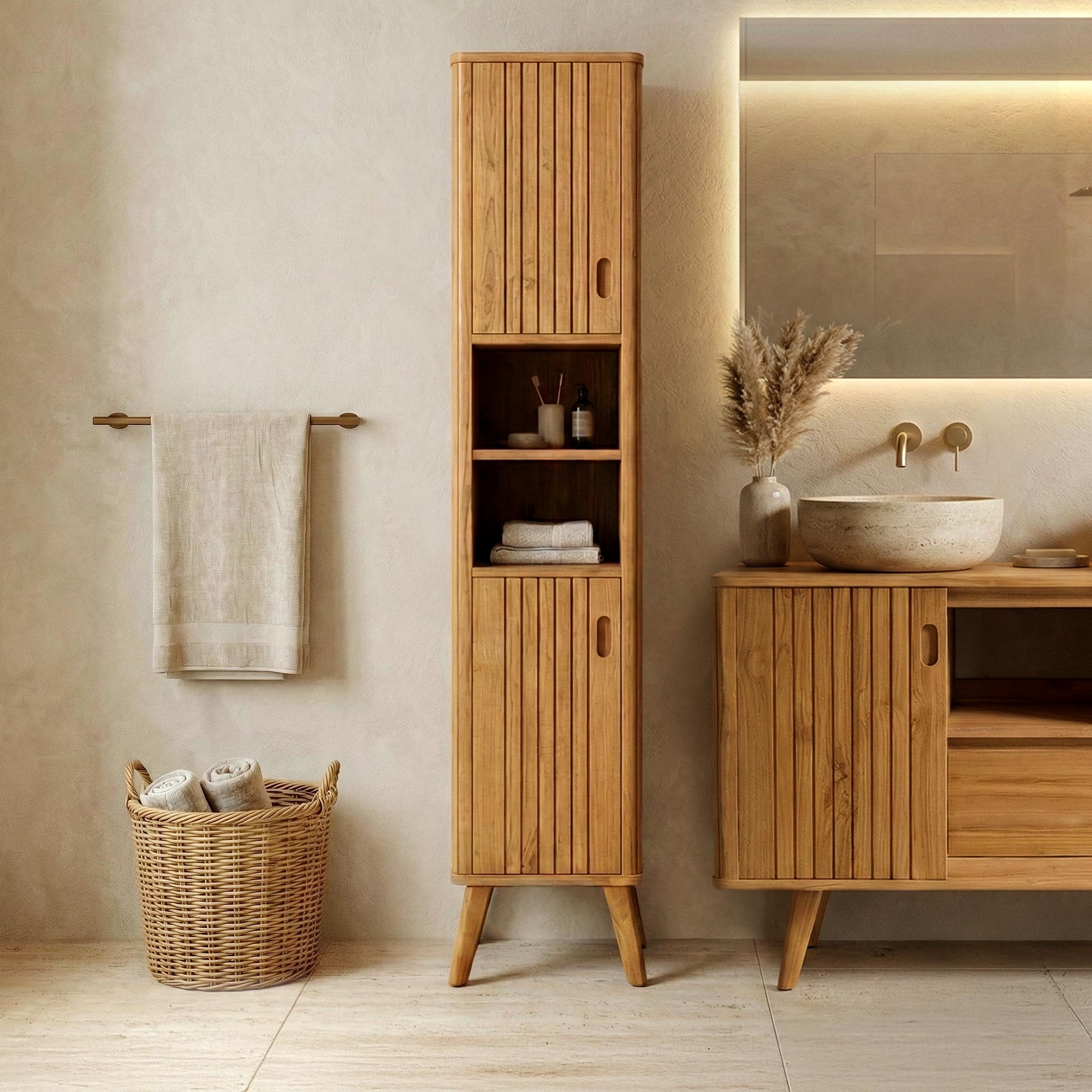 Apportez une touche de sophistication scandinave à votre salle de bain avec la colonne de rangement en bois massif de la collection Neha. Élégamment dessinée, cette colonne en bois de teck se distingue par ses lignes épurées et sa finition naturelle qui sublime la beauté du bois. Conçue pour offrir un rangement optimal, elle dispose de deux compartiments fermés et de niches ouvertes qui permettent d'organiser facilement les essentiels de la salle de bain tout en gardant à portée de main ce qui est nécessaire au quotidien.