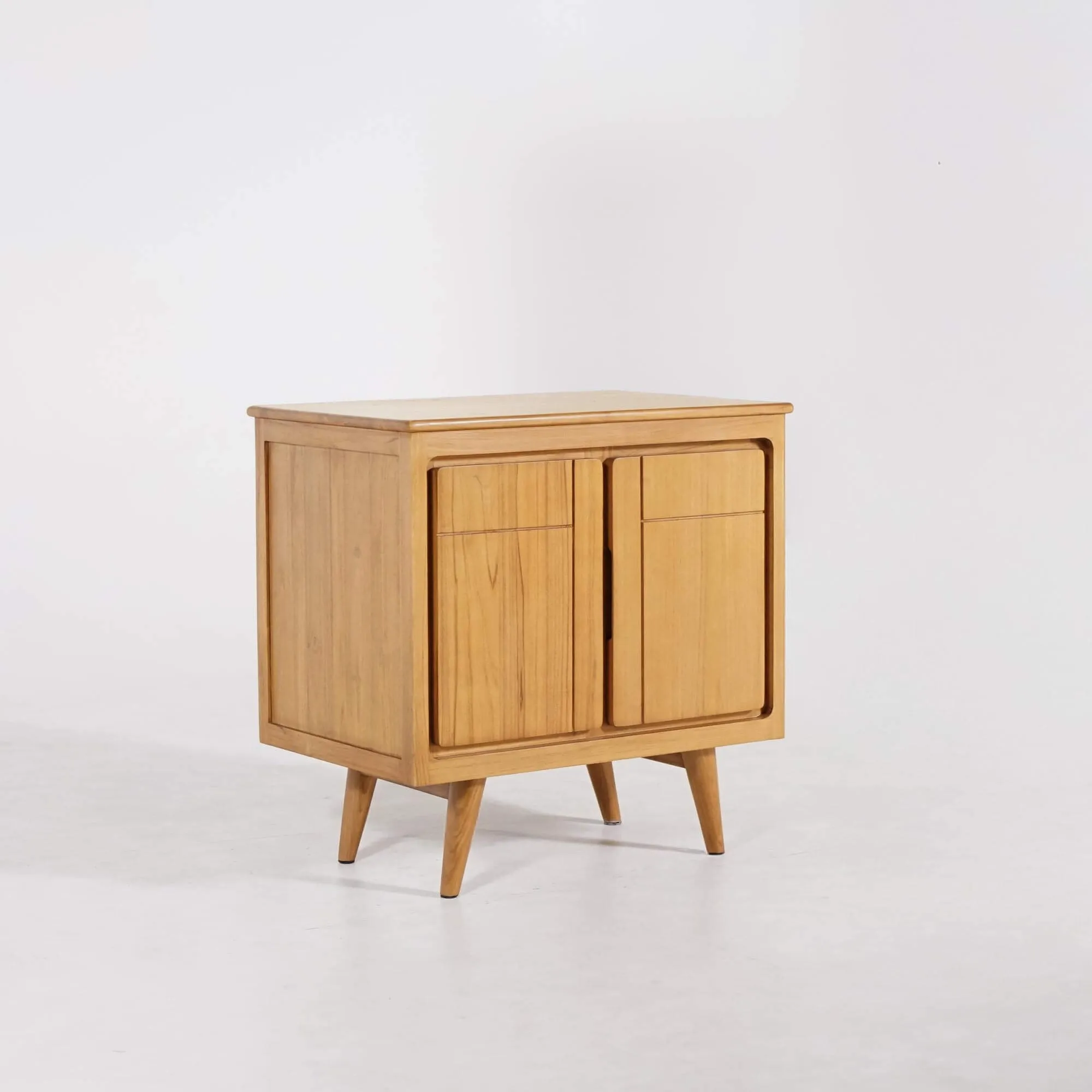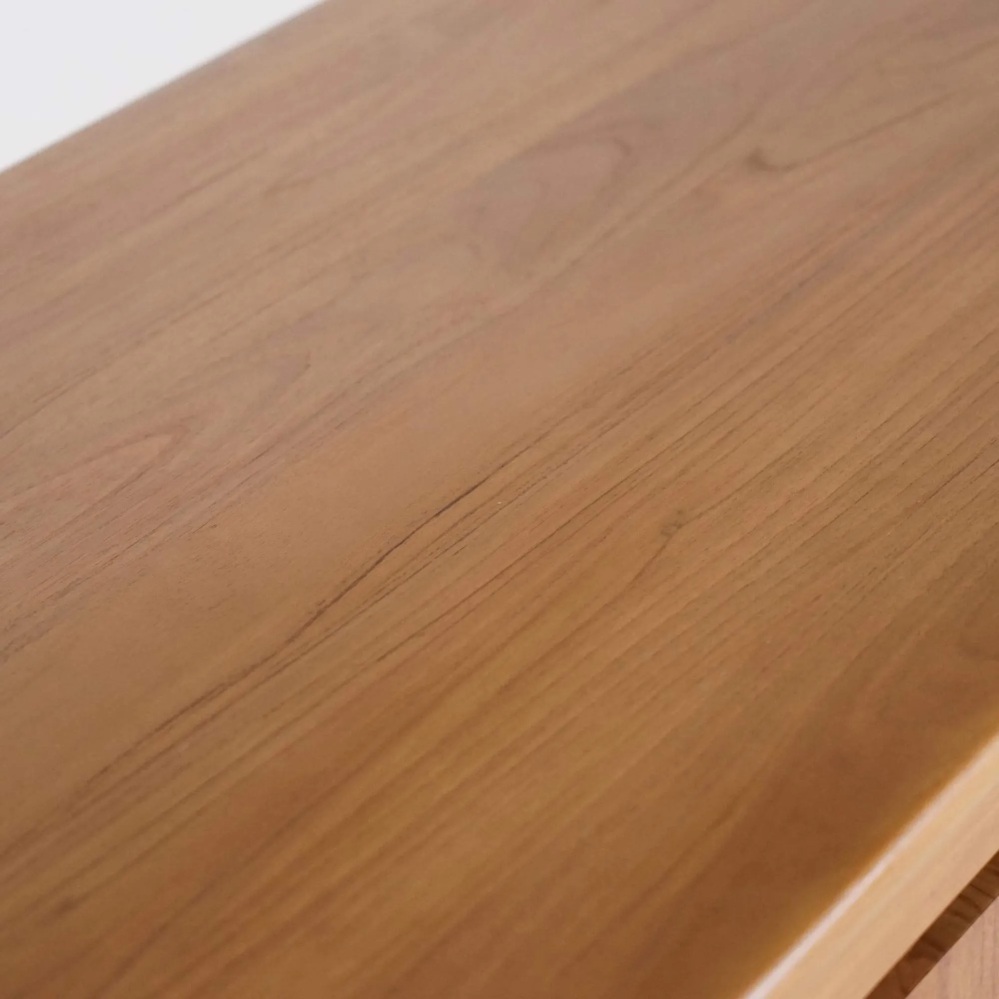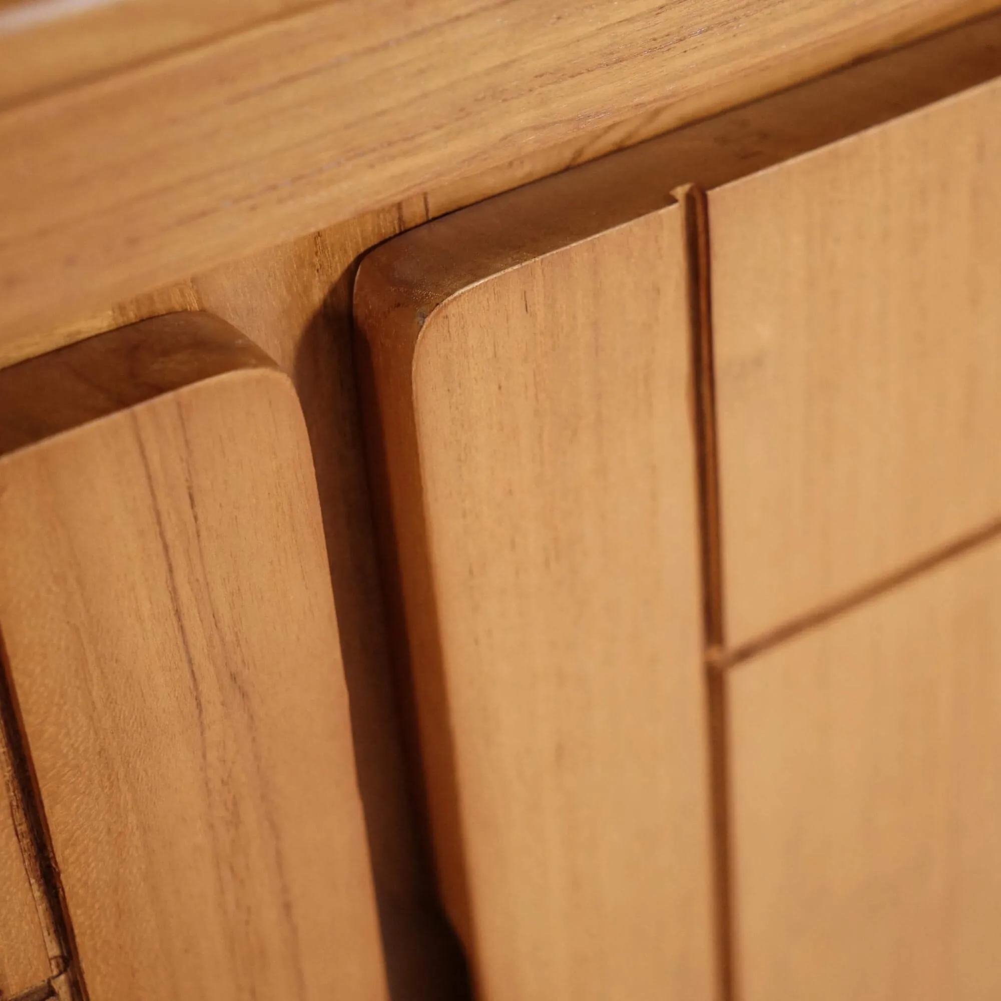Nous avons voulu un meuble salle de bain en teck massif qui invite à la sérénité : une pièce épurée mais vivante, dont la présence discrète valorise la matière plutôt que la forme. Sa teinte dorée se marie harmonieusement avec des vasques en pierre naturelle, en terrazzo ou en béton lissé, offrant des contrastes raffinés et contemporains.