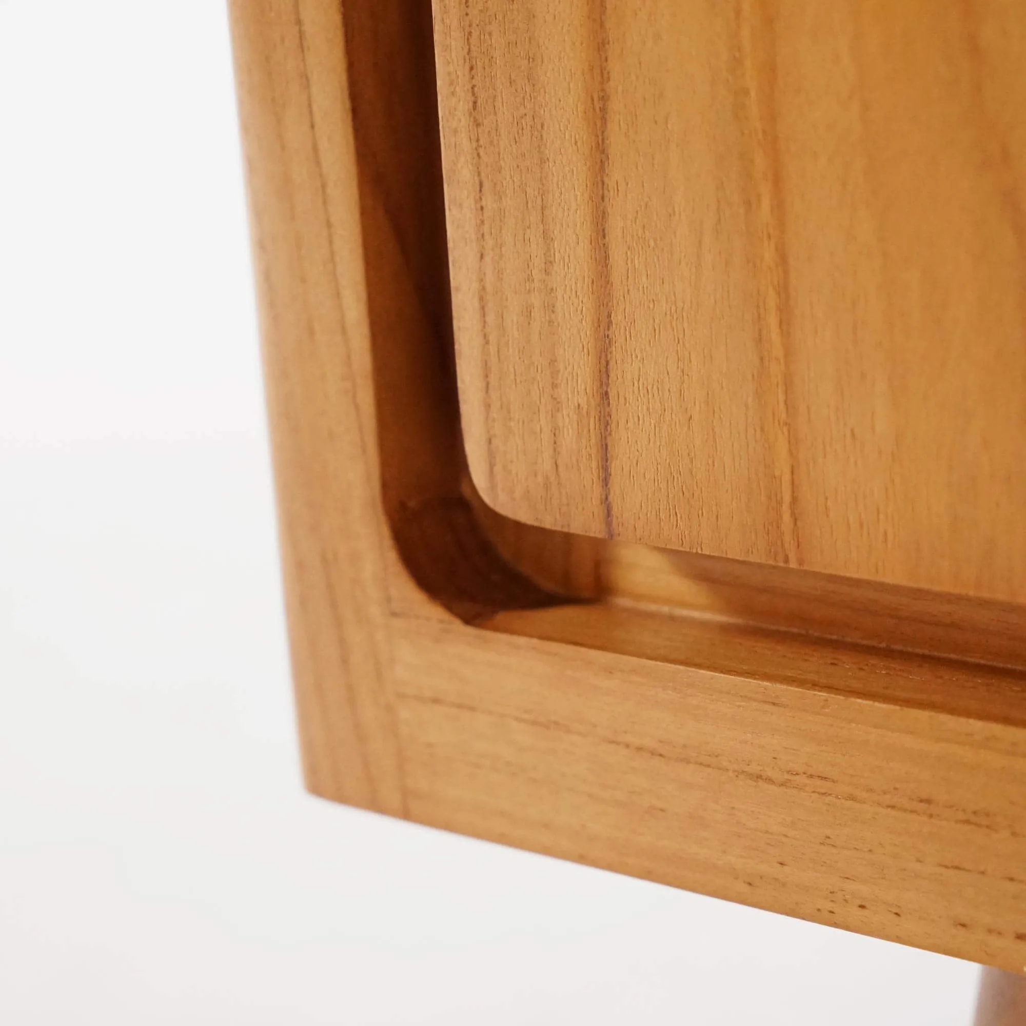 Chaque détail de la conception de ce meuble salle de bain en teck massif a été pensé pour sublimer la matière. Le teck massif, sélectionné pour sa densité et sa résistance naturelle à l’humidité, révèle un veinage subtil et chaleureux. Les chants arrondis, la douceur des angles et la finition satinée témoignent d’un travail artisanal minutieux, fidèle à notre exigence de qualité. Le meuble repose sur des pieds coniques de 21 cm, apportant une légèreté visuelle et facilitant l’entretien du sol.