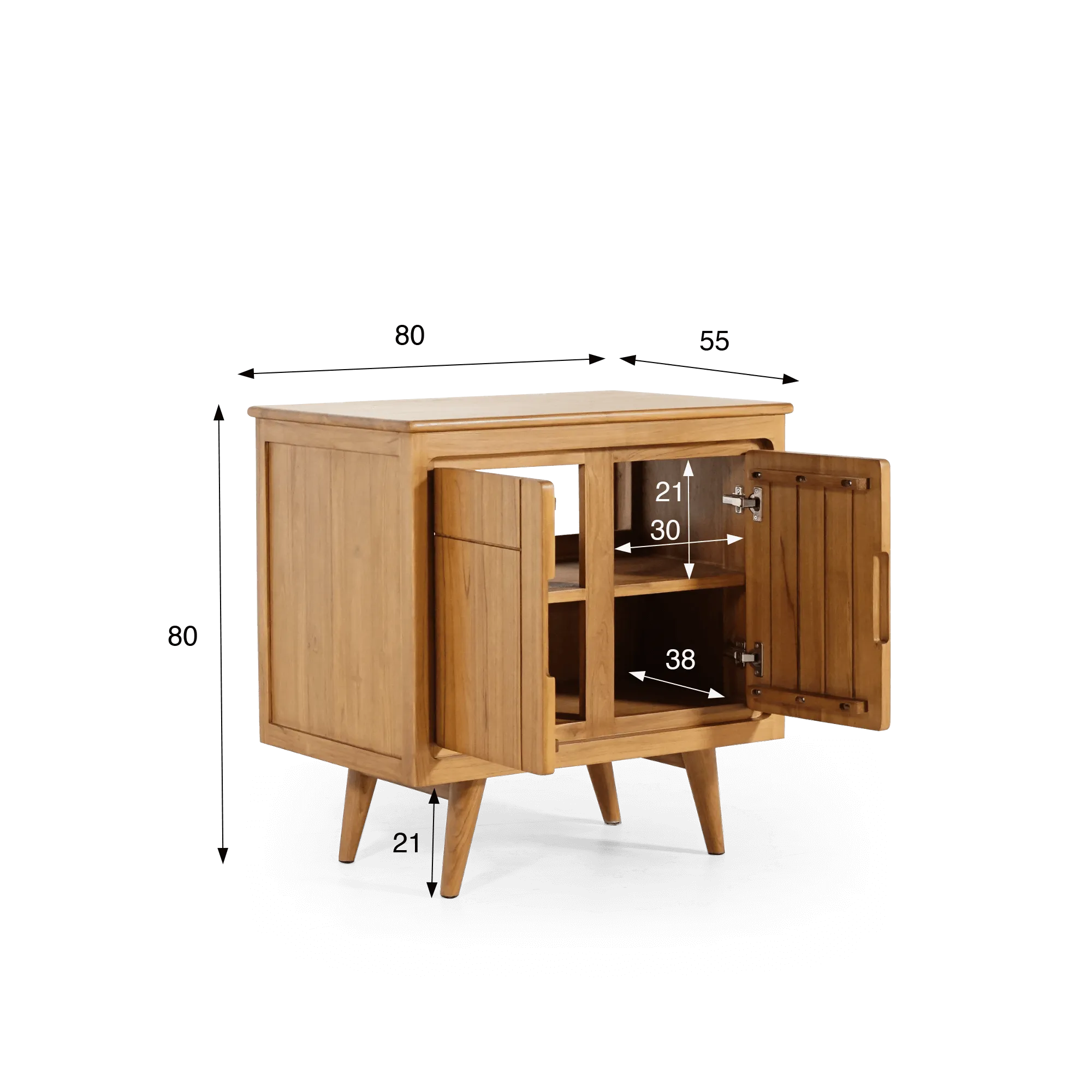 Avec ses 80 cm de long, 55 cm de profondeur et 80 cm de haut, ce meuble salle de bain en teck massif offre une silhouette compacte, parfaitement adaptée aux espaces contemporains. Ses deux portes battantes dissimulent un rangement généreux, organisé sur deux niveaux : la première étagère à 30 cm du plateau accueille flacons et accessoires de beauté grâce à sa profondeur utile de 38 cm, tandis que le compartiment inférieur, de mêmes dimensions, peut accueillir serviettes et autres produits volumineux.