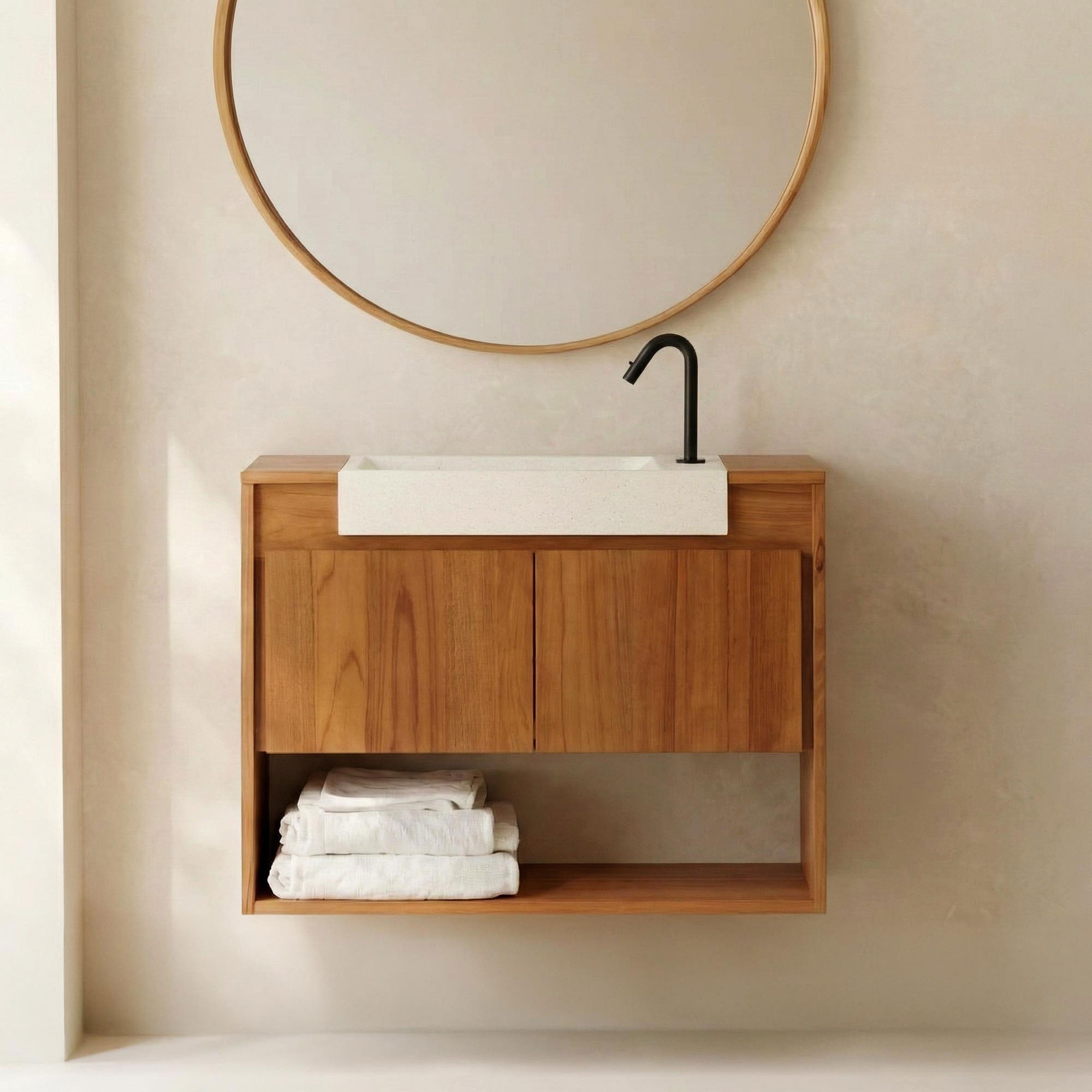 Fabriqué en teck massif, ce meuble conjugue la durabilité d’un matériau noble avec un design minimaliste, idéal pour s'intégrer harmonieusement dans des intérieurs modernes ou naturels.