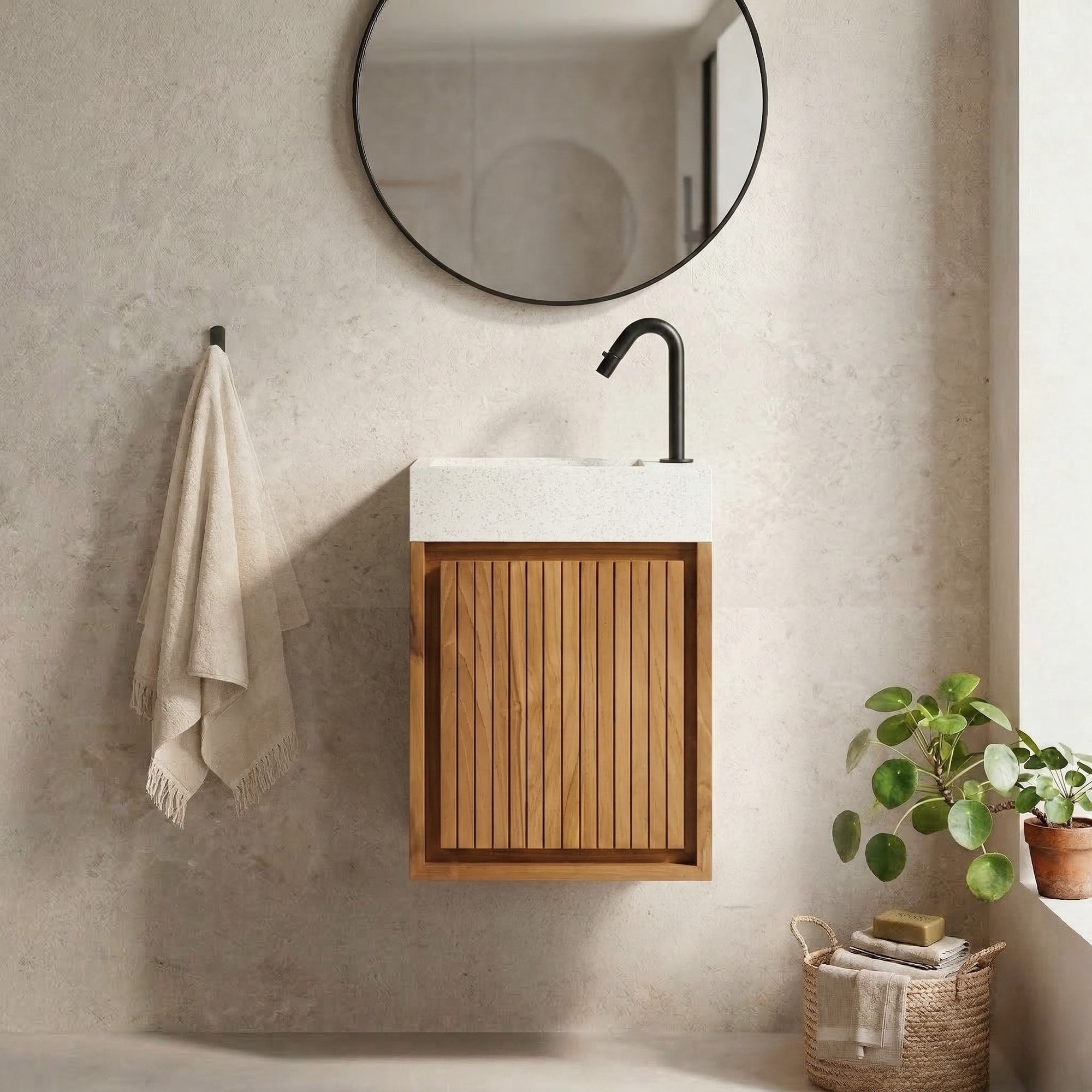 Chaque détail de ce meuble est pensé pour célébrer la noblesse de ses matériaux. Le teck massif, réputé pour sa robustesse et sa résistance naturelle à l'humidité, est travaillé avec soin pour révéler des veines subtiles et une finition douce au toucher. La vasque en terrazzo blanc, à la fois minimaliste et sophistiquée, vient sublimer l’ensemble en créant un contraste visuel apaisant et raffiné.