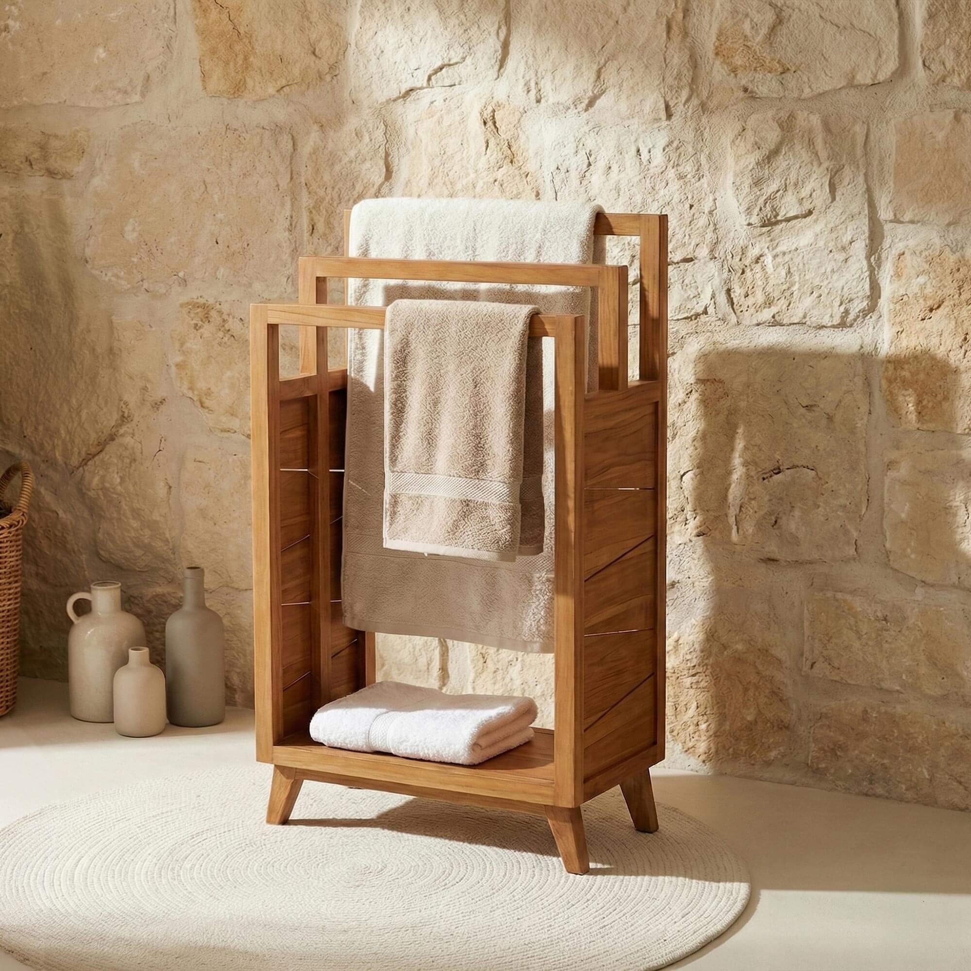 Nous avons voulu créer un accessoire à la fois fonctionnel et esthétique, permettant d’organiser vos serviettes de manière optimale tout en ajoutant une note design à votre décoration. Chaque détail, des finitions impeccables aux formes géométriques de sa structure, a été pensé pour offrir une expérience utilisateur agréable et pour s’harmoniser parfaitement avec les autres pièces de la collection Meera, comme le meuble de salle de bain en teck massif.