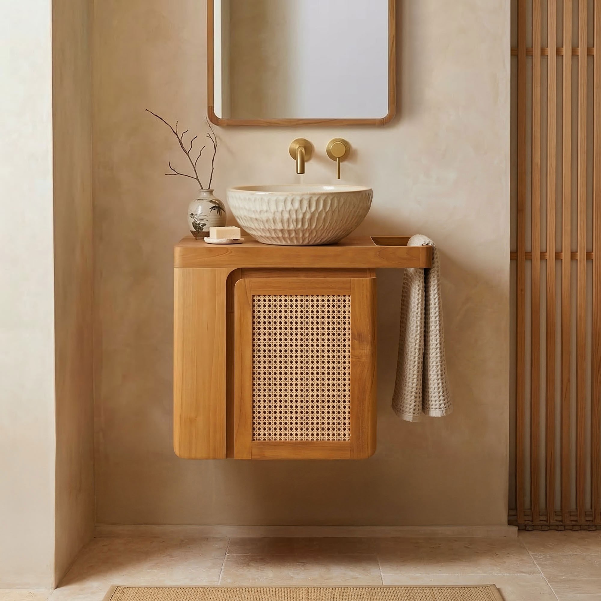 Ce meuble de salle de bain suspendu Indira s’intègre aussi bien dans une ambiance épurée et contemporaine qu’au sein d’un décor plus bohème ou naturel. Son alliance du bois massif et du cannage lui permet de dialoguer harmonieusement avec des matières brutes comme la pierre, le terrazzo ou le béton ciré. Associé au miroir de la même collection, il crée une continuité esthétique, apportant équilibre et douceur à l’ensemble de la pièce.