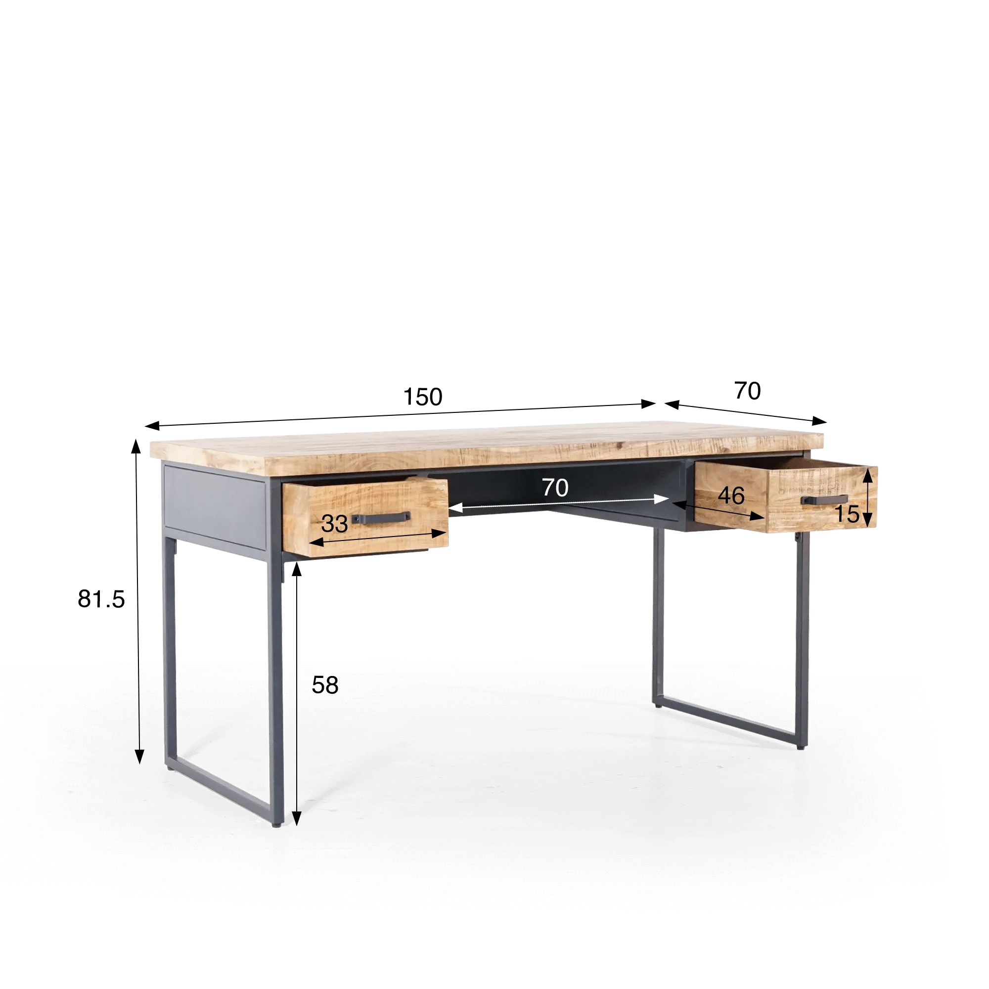 Nos designers ont travaillé sur des lignes pures et des proportions harmonieuses pour proposer un bureau style industriel en bois et métal à l’allure affirmée, où chaque détail a été pensé pour allier esthétique et praticité. Le plateau, long de 150 cm et profond de 70 cm, offre un vaste espace de travail idéal pour accueillir ordinateur, documents ou objets décoratifs, tout en préservant une impression de légèreté. Le manguier massif, avec son veinage naturel et ses variations subtiles de teinte, confère à l’ensemble une authenticité que nous avons voulu mettre en valeur sans artifice.
