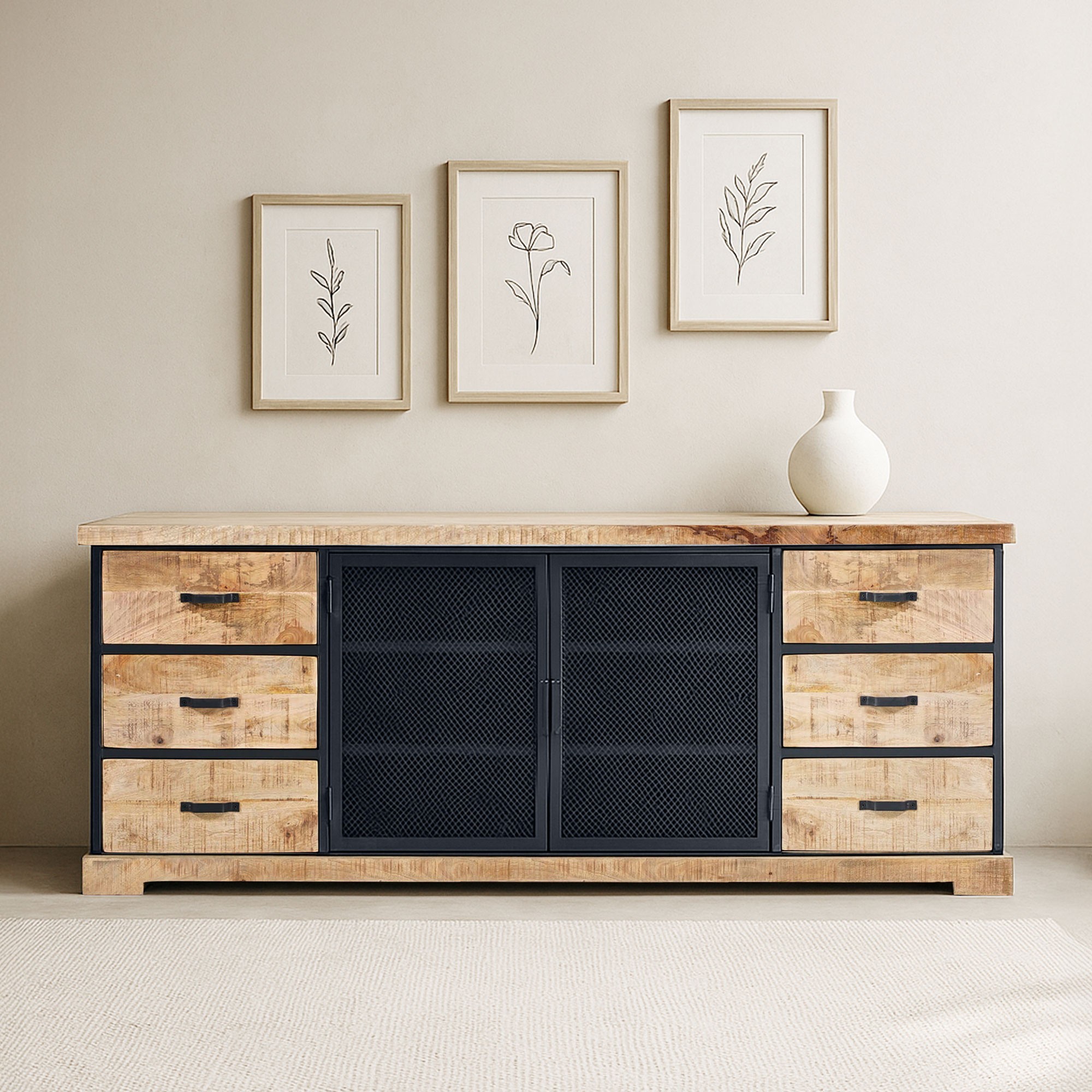 Les six tiroirs en bois de manguier répartis de part et d'autre du corps de meuble permettent de stocker de nombreux objets du quotidien, tandis que les deux portes ajourées en métal cachent deux compartiments spacieux, idéaux pour accueillir de la vaisselle ou des plats plus volumineux. Les portes battantes apportent une touche moderne à l'ensemble, tout en assurant une ergonomie et une utilisation pratique au quotidien.