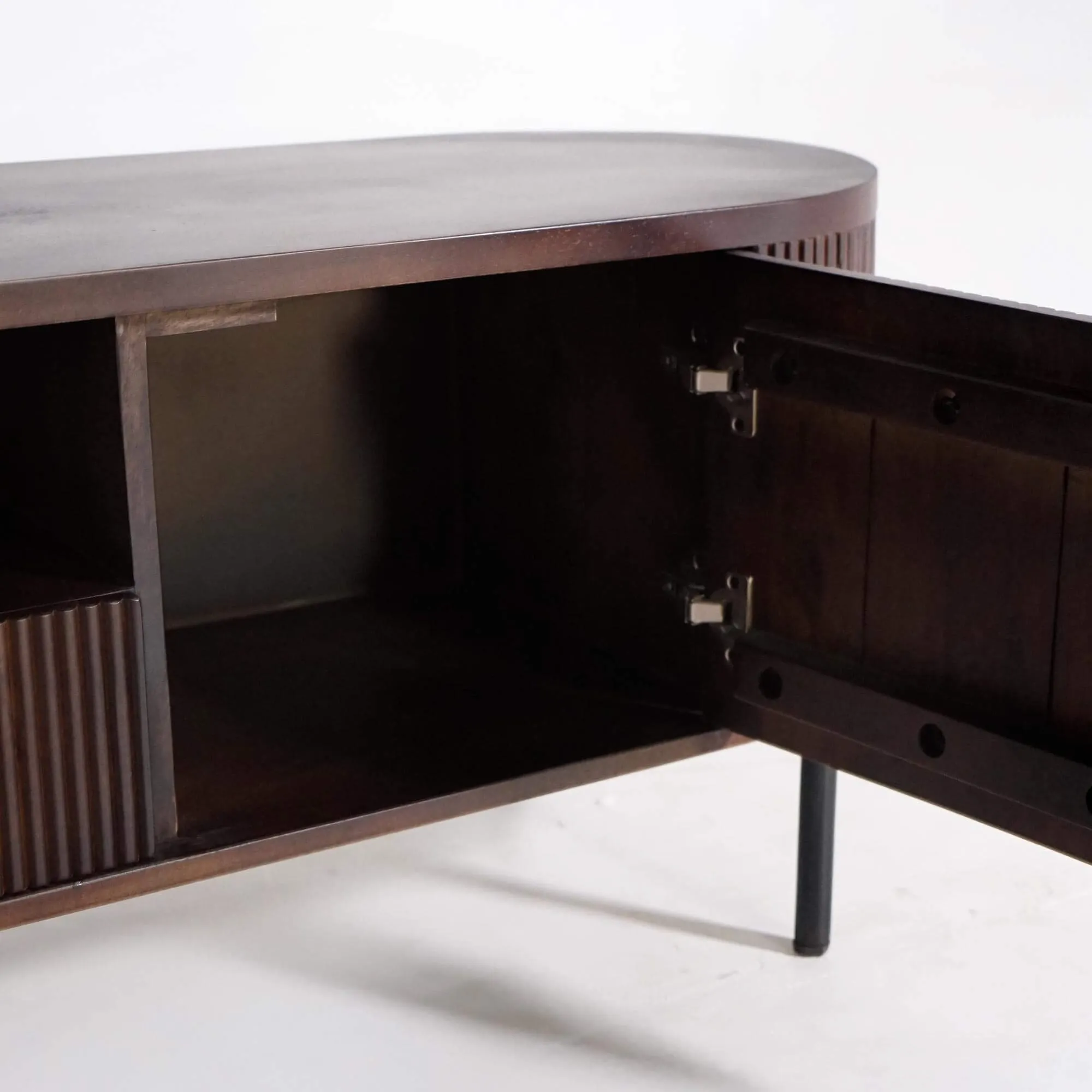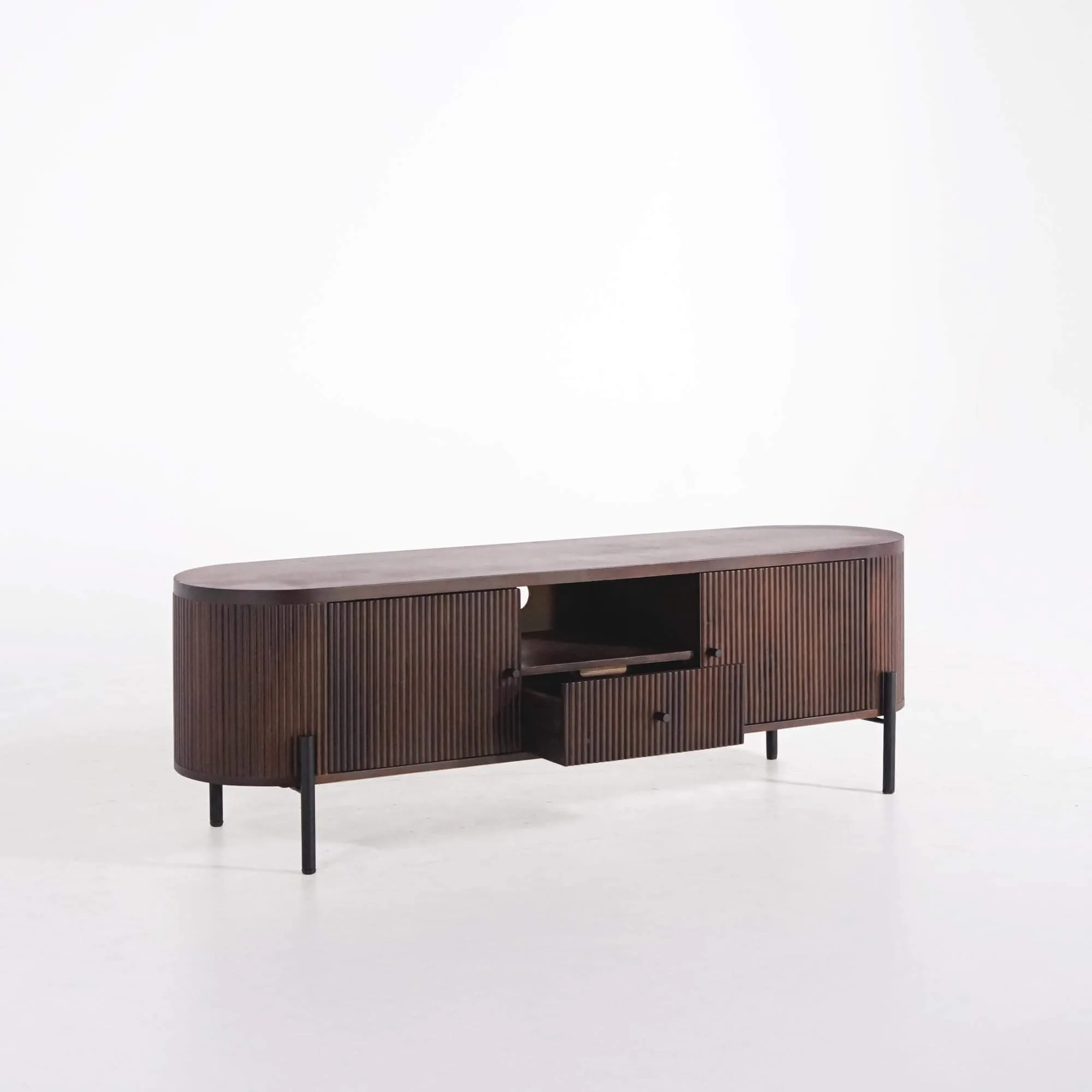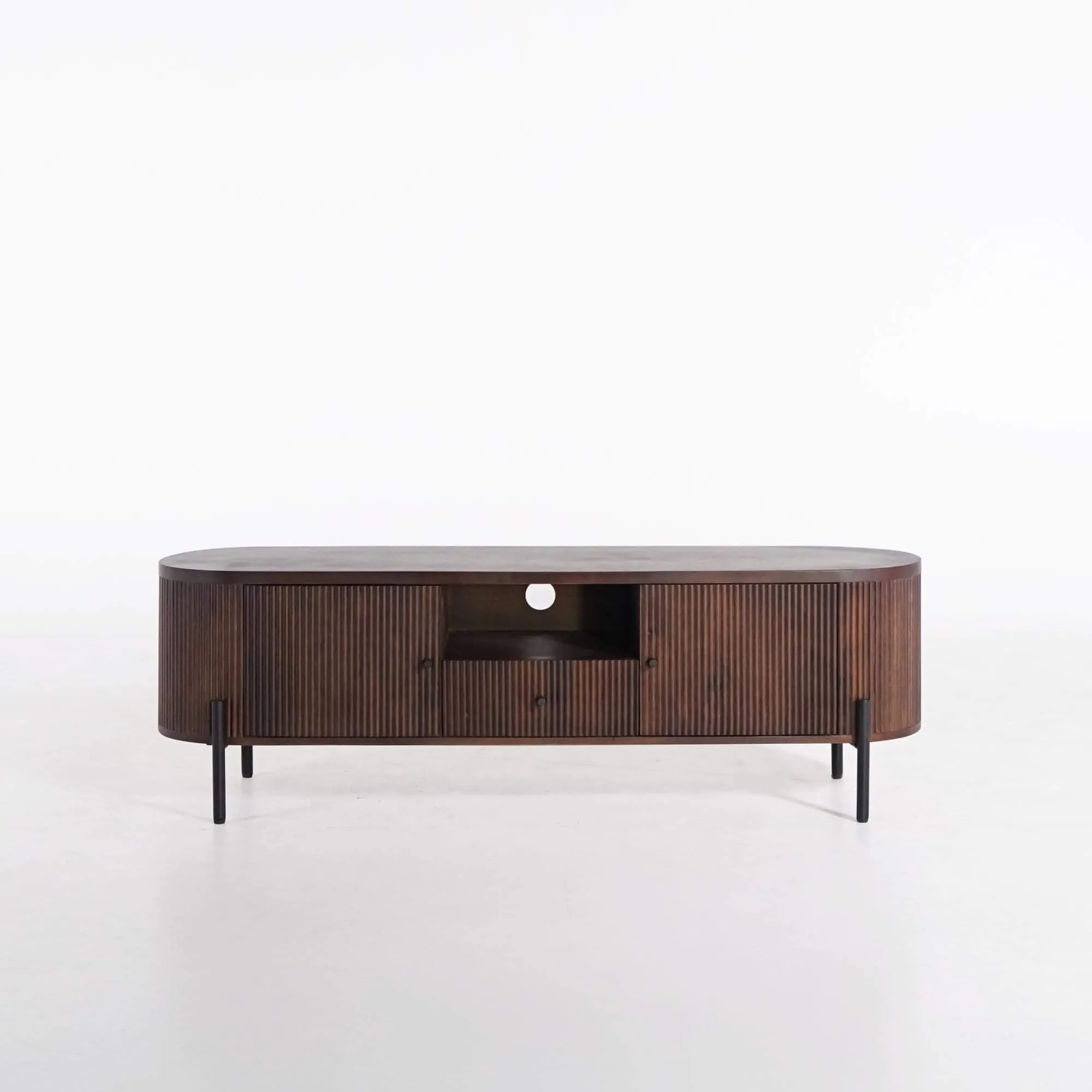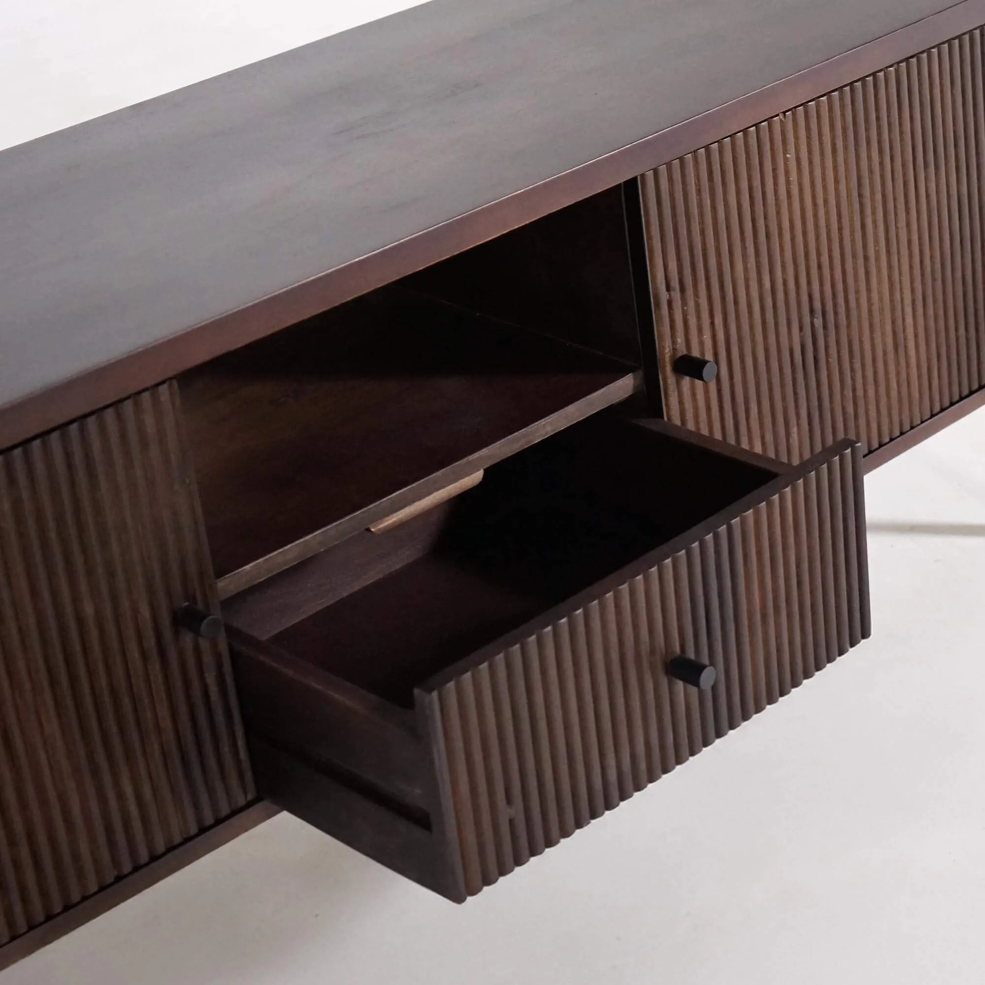 Fabriqué en manguier massif, ce meuble TV en bois de manguier révèle une finition manuelle soigneusement travaillée qui met en valeur les nuances brunes profondes du bois. La façade rainurée, typique de la collection Sohana, capte la lumière avec subtilité et offre un jeu d’ombres raffiné qui anime la surface. Les pieds en métal noir, fins et légèrement décalés, renforcent la légèreté visuelle du meuble tout en garantissant une stabilité parfaite.