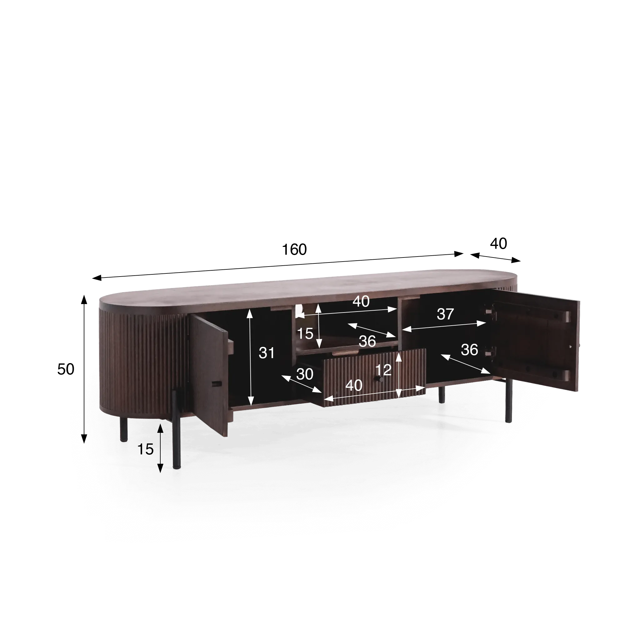 Derrière ses deux portes battantes équipées du système push-pull à fermeture soft close, ce meuble TV en bois de manguier dissimule des compartiments de rangement spacieux de 36 cm de profondeur, idéaux pour accueillir vos équipements multimédia ou vos accessoires. Un tiroir central offre un espace supplémentaire pour télécommandes, câbles ou magazines, tandis que la niche ouverte de 40 cm de largeur est dotée d’un passe-câble discret, garantissant une organisation fluide et esthétique de vos appareils électroniques. Avec ses dimensions de 160 × 40 × 50 cm, ce meuble TV en bois de manguier se veut aussi fonctionnel que raffiné.