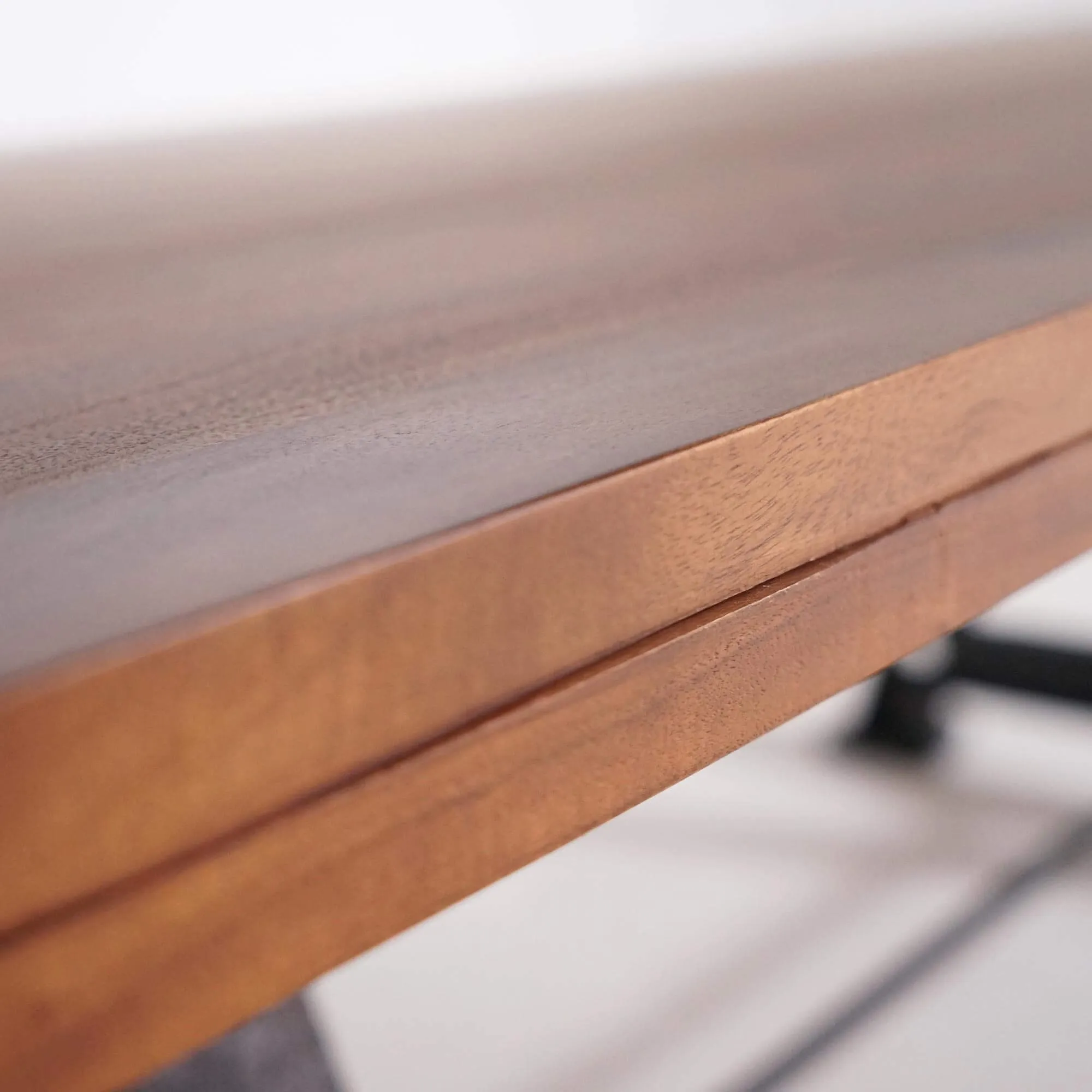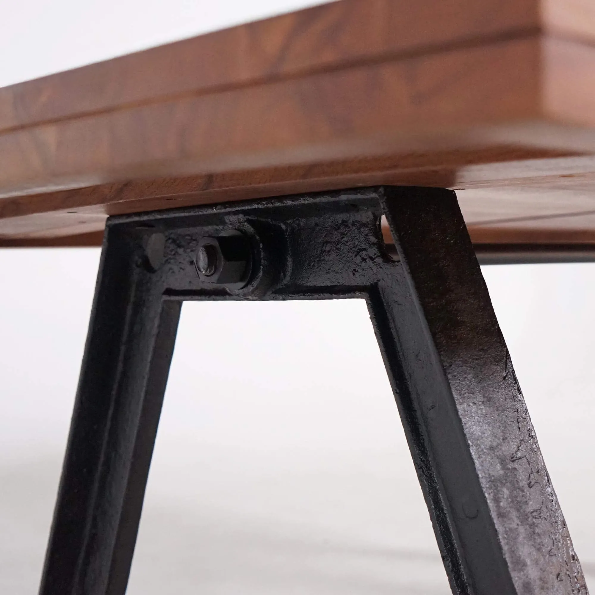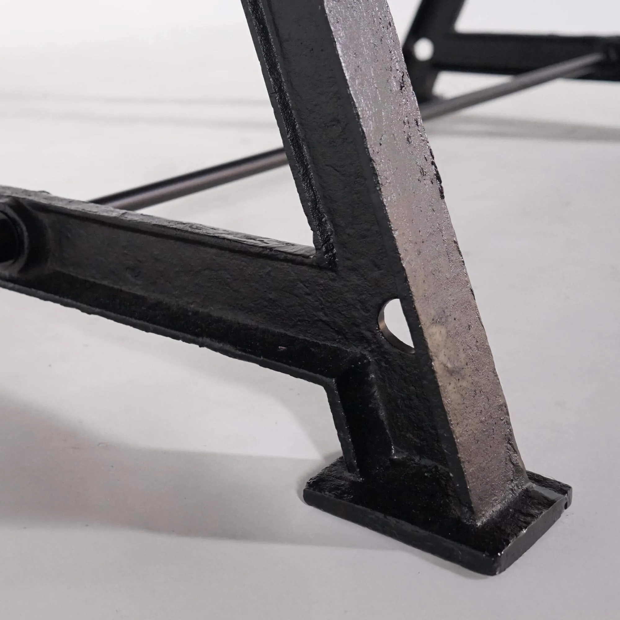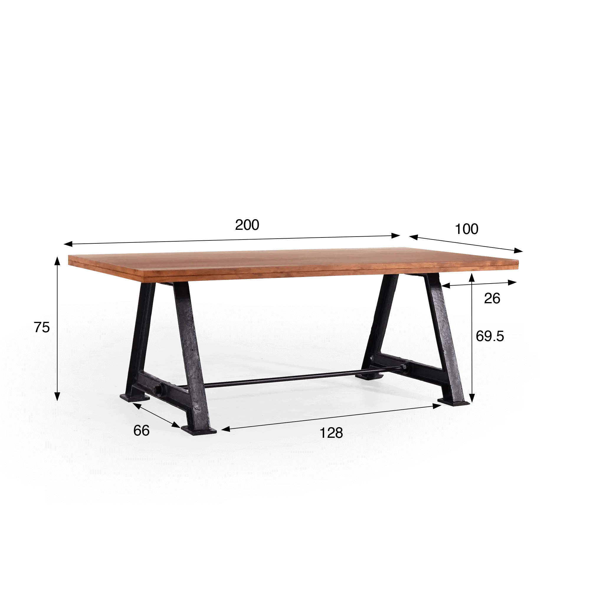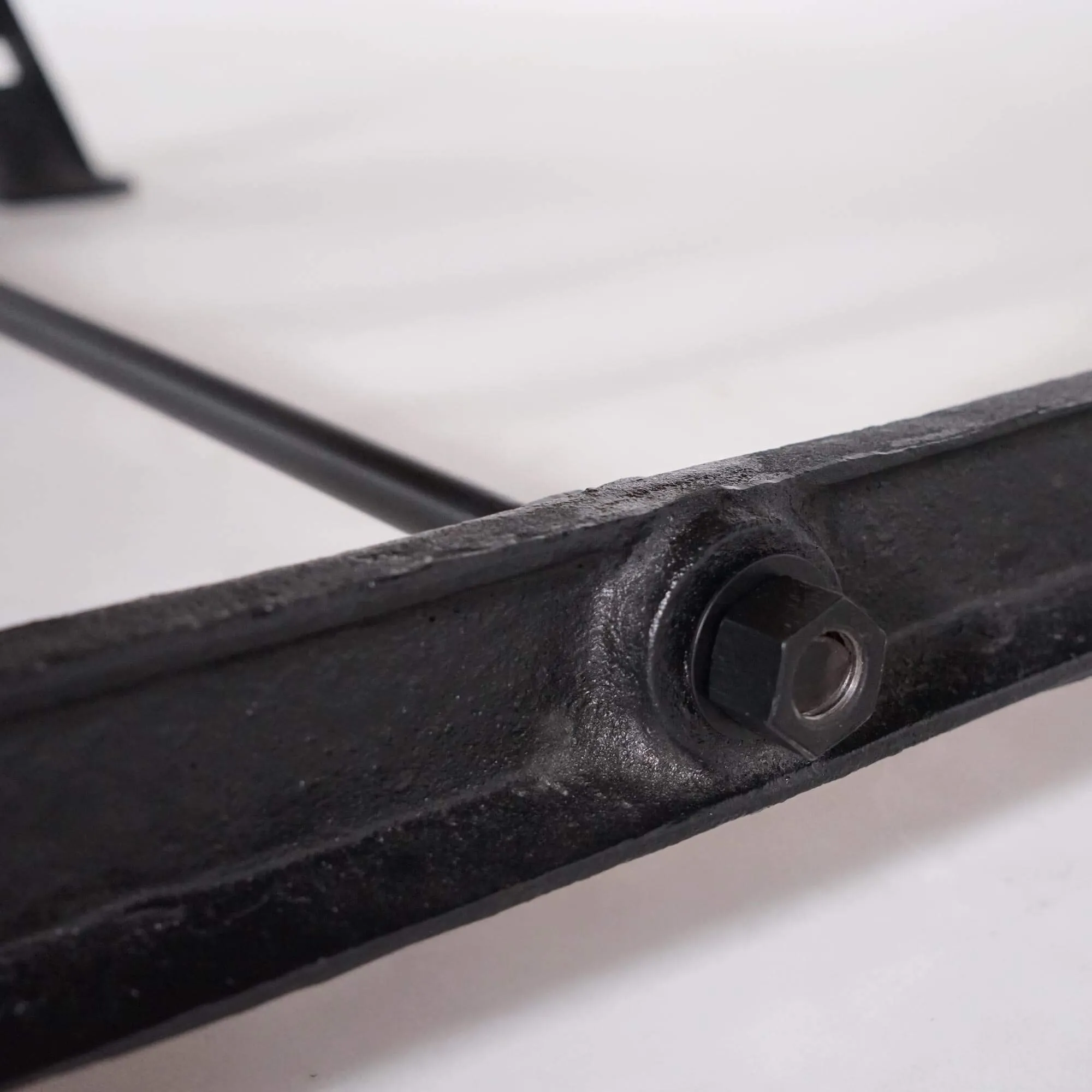 Le piètement en fonte noire de cette table à manger de style industriel en bois massif, inspiré des structures métalliques industrielles, confère à l’ensemble une stabilité remarquable. Ses lignes inclinées et son entretoise centrale soulignent une conception à la fois fonctionnelle et graphique, pensée pour traverser le temps sans perdre de sa modernité. Ce contraste entre la chaleur du bois et la froideur du métal noir crée un équilibre esthétique fort, fidèle à l’esprit industriel de nos collections phare.