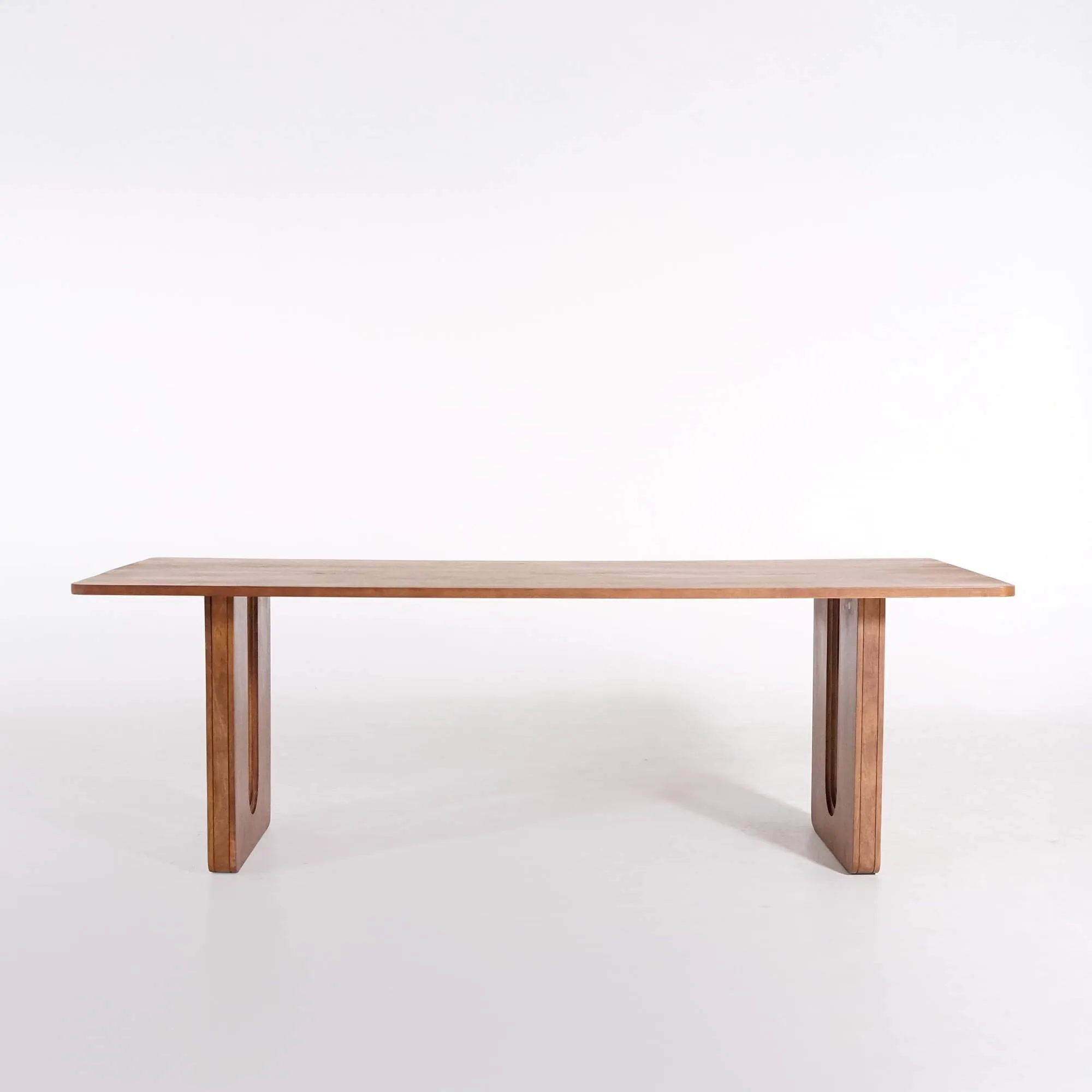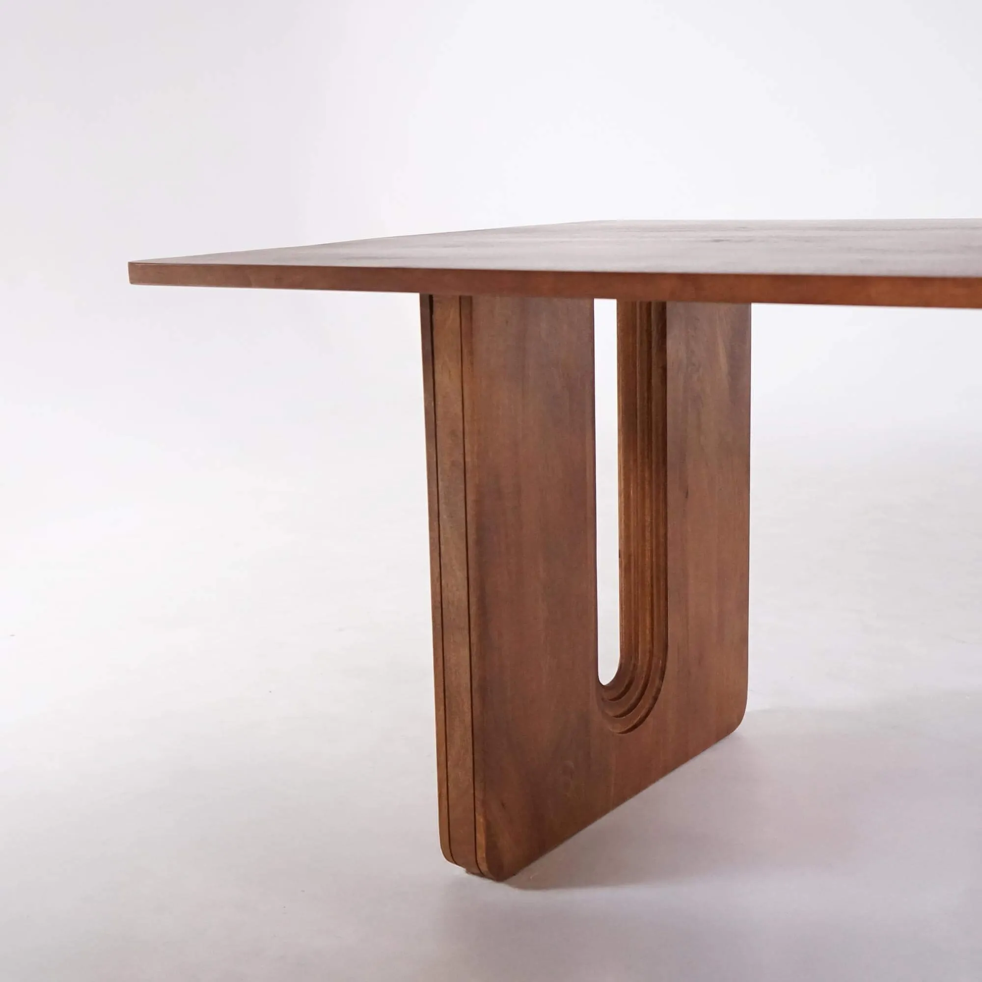 Fabriquée en bois massif de manguier, la table à manger en bois massif Noba révèle toute la richesse de cette essence noble. Sa teinte brun naturel, légèrement ambrée, joue avec la lumière pour créer une atmosphère chaleureuse et apaisante. Le plateau, aux dimensions généreuses de 200 × 100 cm, repose sur deux pieds sculpturaux en forme de U, travaillés dans la même matière. Leur design, à la fois géométrique et fluide, structure visuellement l’ensemble et confère à la table une présence sculpturale forte.
