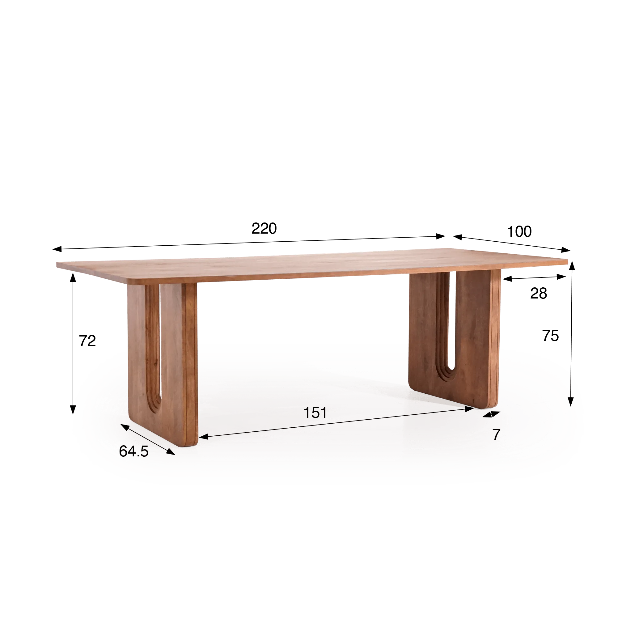 Fabriquée en bois massif de manguier, la table à manger en bois massif Noba révèle toute la richesse de cette essence noble. Sa teinte brun naturel, légèrement ambrée, joue avec la lumière pour créer une atmosphère chaleureuse et apaisante. Le plateau, aux dimensions généreuses de 220 × 100 cm, repose sur deux pieds sculpturaux en forme de U, travaillés dans la même matière. Leur design, à la fois géométrique et fluide, structure visuellement l’ensemble et confère à la table une présence sculpturale forte.