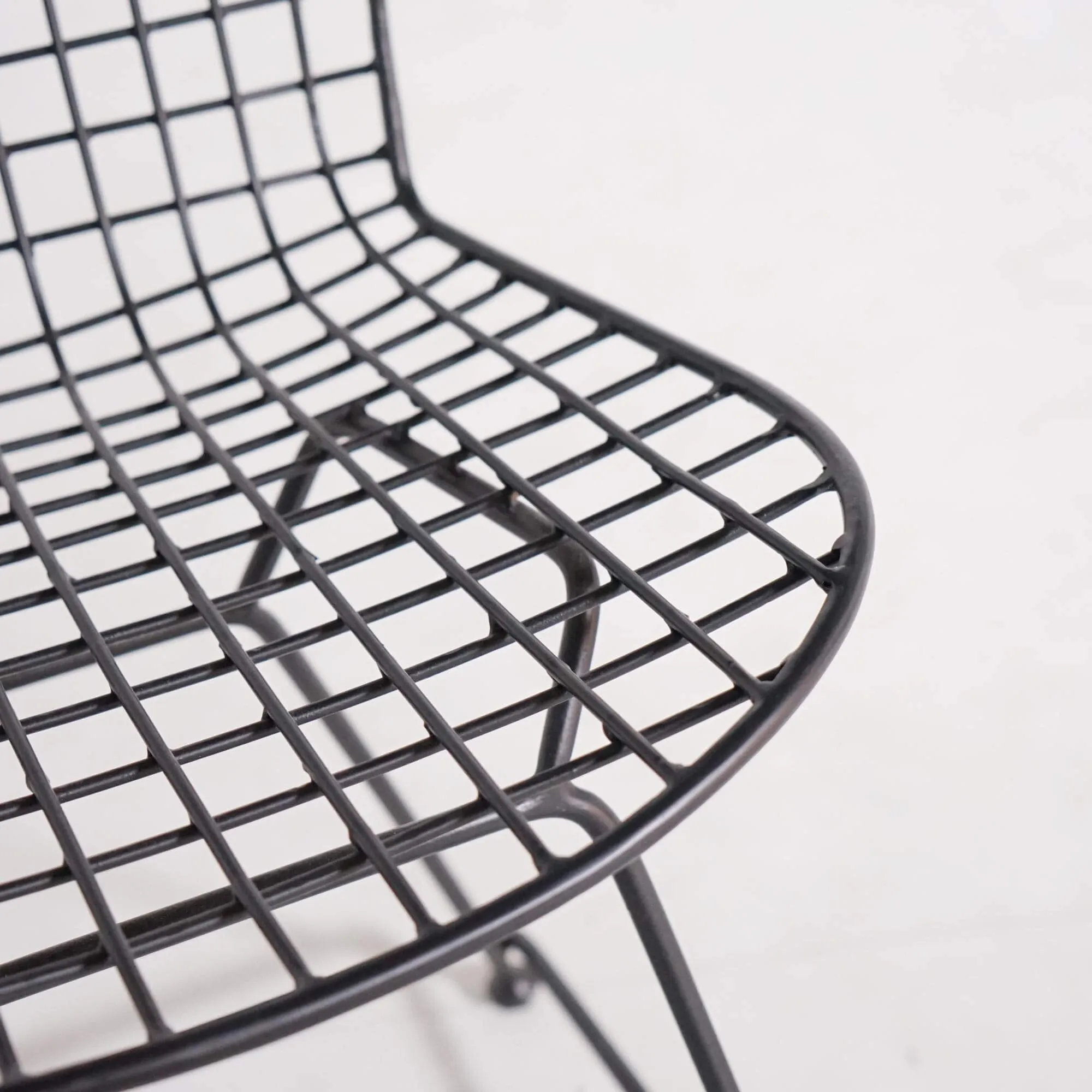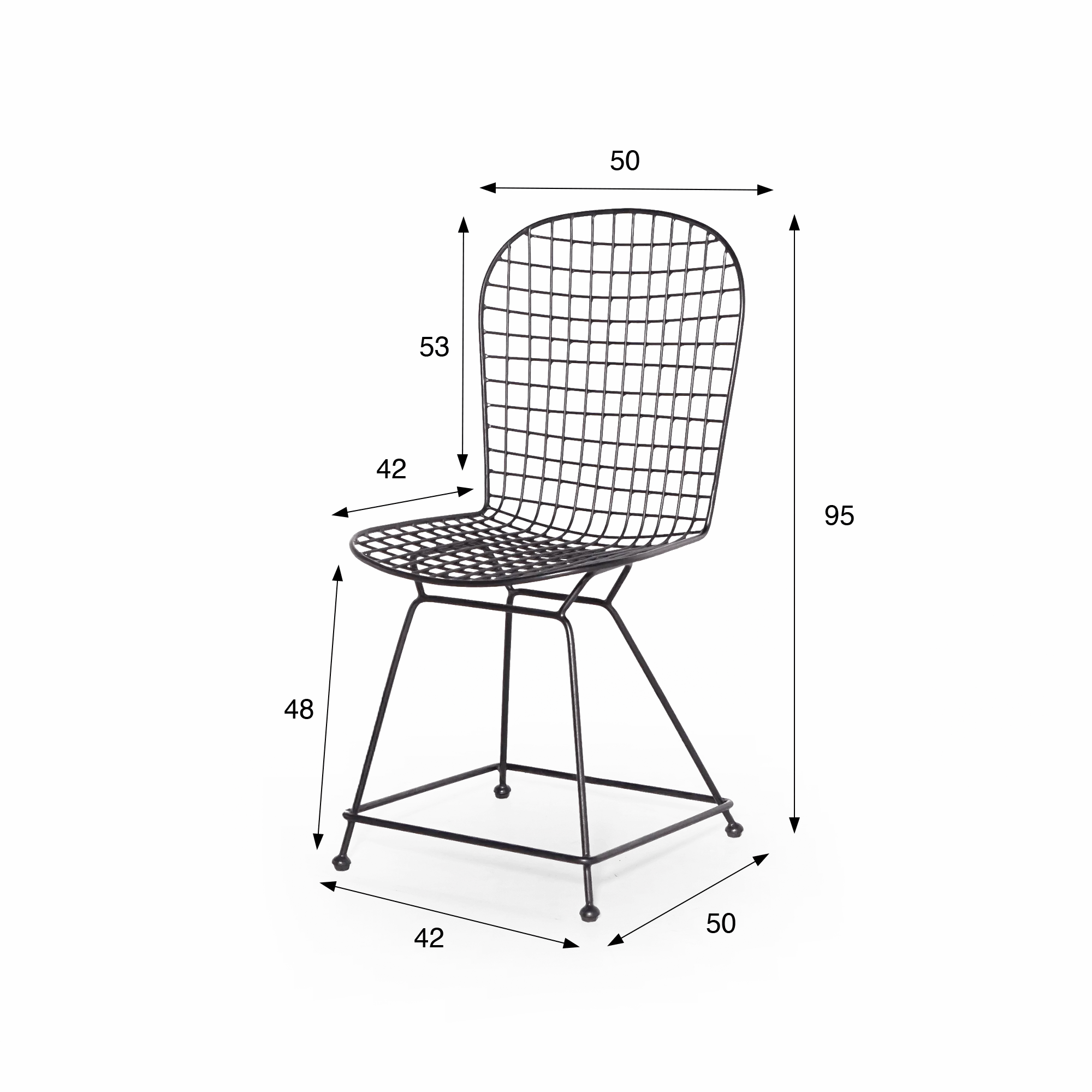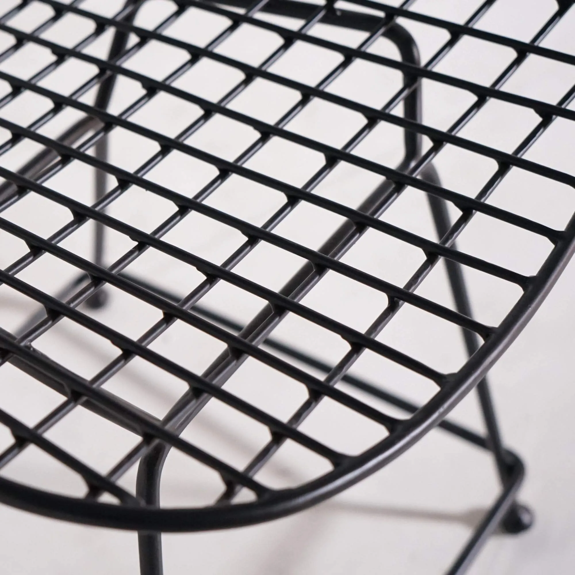 Fabriquée artisanalement en métal plein laqué noir, la chaise en métal de style industriel Wire joue sur la transparence et la géométrie de son treillis. Son dossier haut de 53 cm épouse subtilement la forme du dos, tandis que l’assise de 42 cm de profondeur et 50 cm de large offre un confort stable et équilibré. Les lignes fines et régulières de sa structure créent une impression aérienne, renforcée par ses pieds fuselés reliés par une barre transversale qui assure une parfaite stabilité.