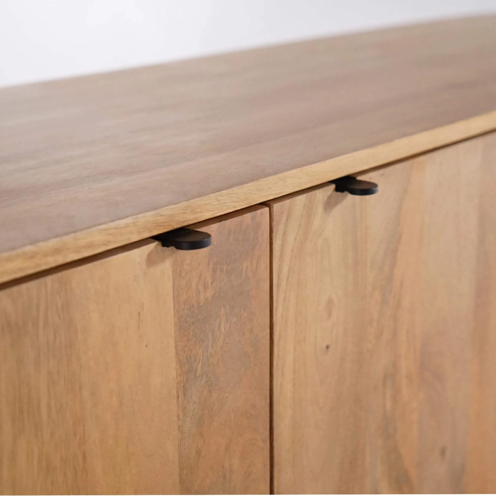 Réalisé en bois massif de manguier, le buffet 2 portes en bois massif Timea révèle un bois chaleureux, vivant, dont les nuances naturelles varient subtilement selon la lumière. Le veinage, volontairement laissé apparent, apporte une profondeur visuelle qui évolue au fil de la journée. Le toucher est doux, la surface soigneusement travaillée, sans effet de brillance excessif, afin de préserver l’authenticité de la matière. C’est ce rapport direct au bois, sincère et non maquillé, qui guide l’identité de la collection.