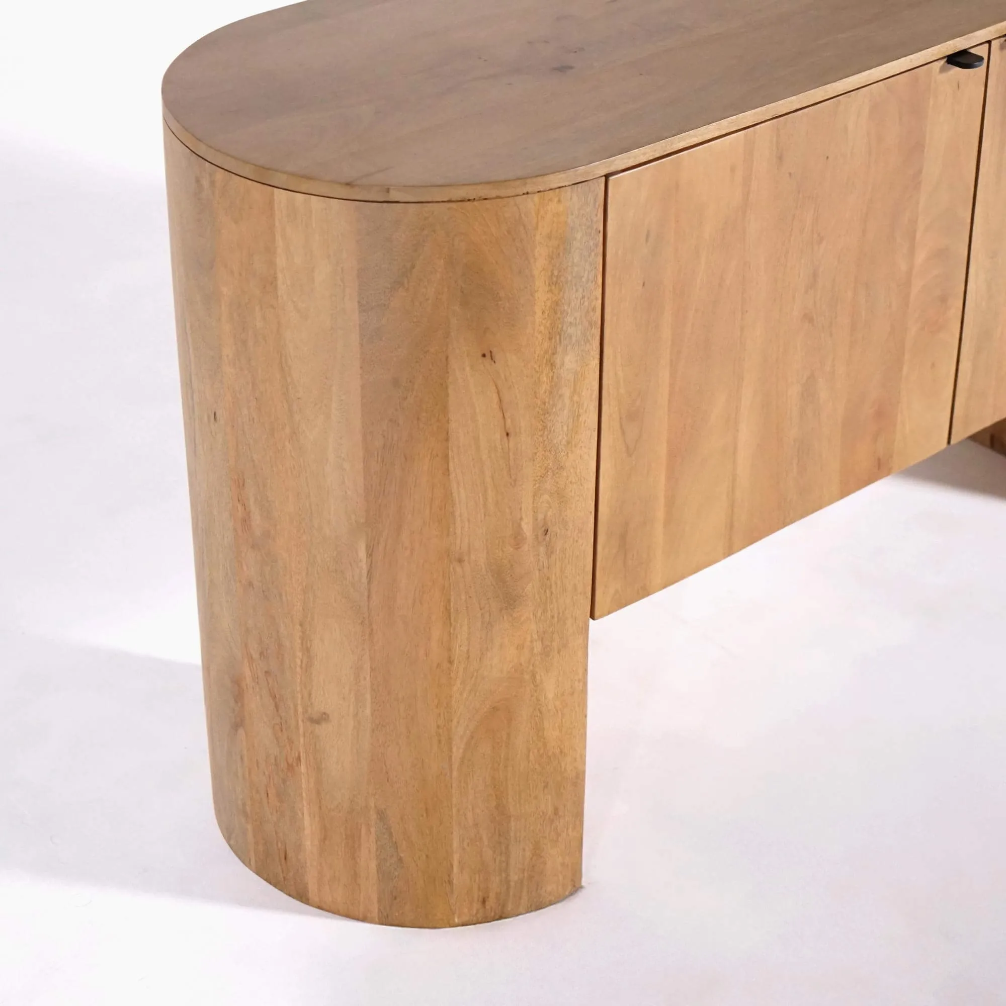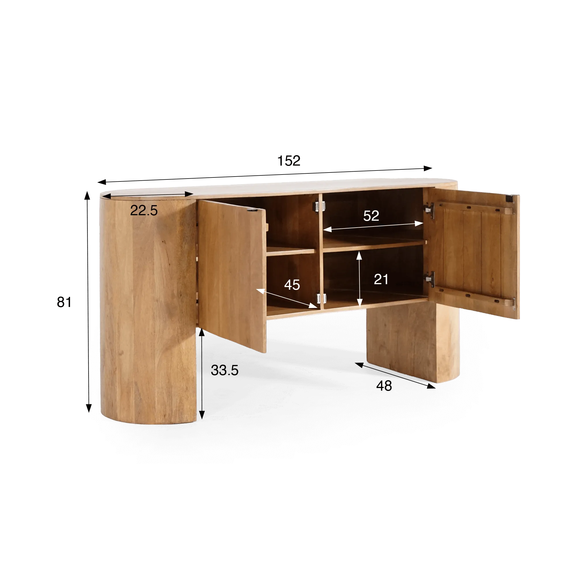 Pensé comme un meuble de transition entre utilité quotidienne et expression du bois, le buffet 2 portes en bois massif Timea traduit notre volonté de revenir à des formes lisibles, apaisées, où chaque ligne a sa raison d’être. Dès le début de sa conception, nous avons travaillé sur une silhouette basse et équilibrée, rythmée par des extrémités arrondies qui adoucissent la présence du meuble tout en affirmant son caractère.