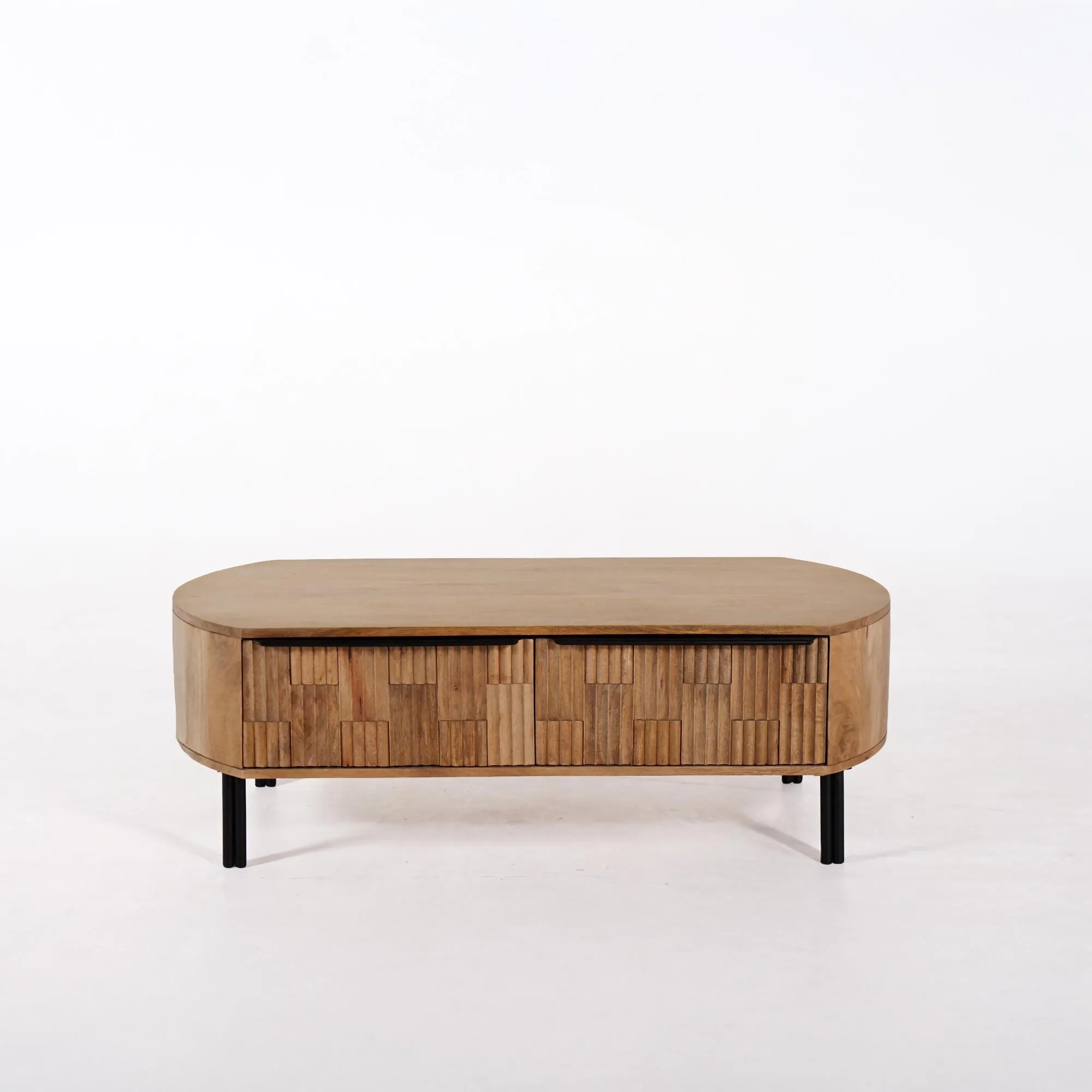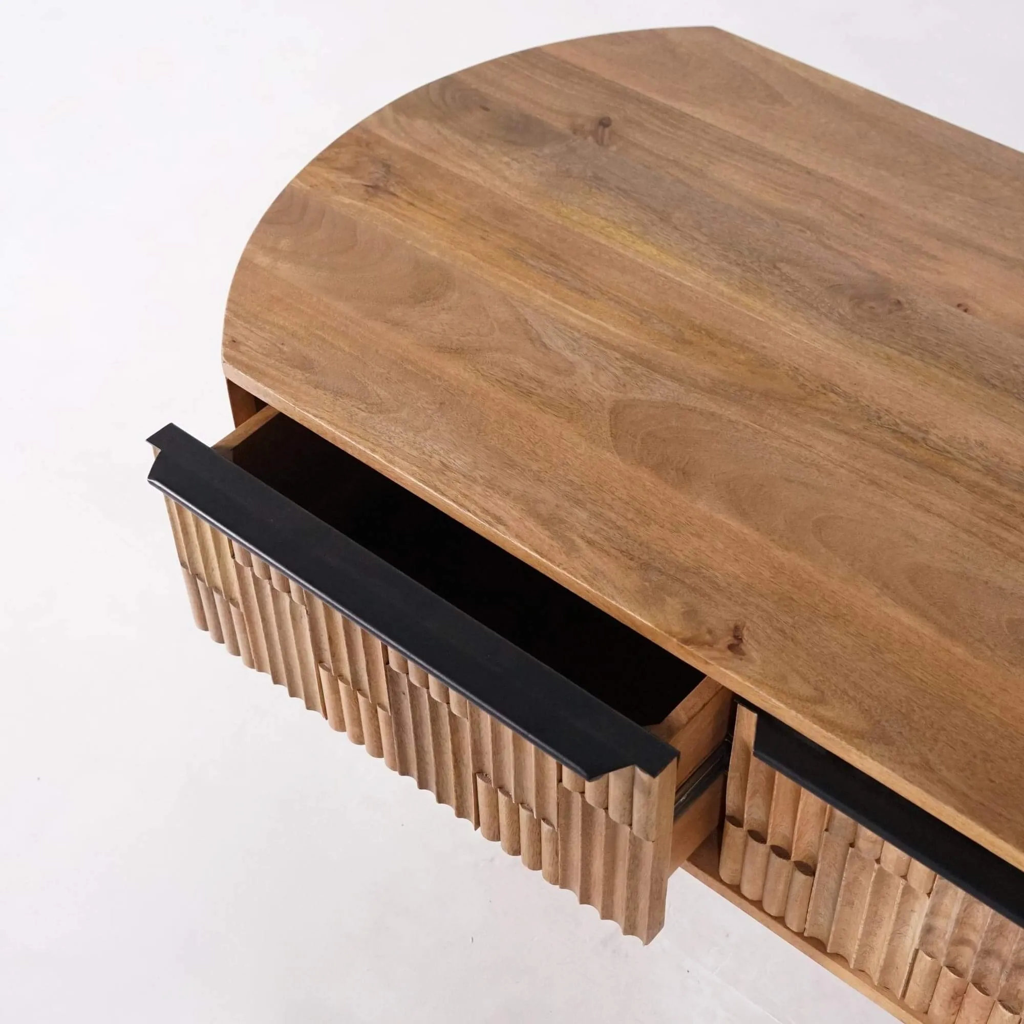 Avec ses 120 cm de long, 60 cm de large et 40 cm de haut, notre table basse en bois de manguier massif Uma offre un format généreux tout en conservant une silhouette légère. Ses bords arrondis et ses lignes douces créent une atmosphère apaisante, idéale pour les intérieurs lumineux et épurés. Nous avons voulu que cette table se distingue par la finesse de son design mais aussi par la richesse de ses détails : les façades de tiroirs présentent un travail artisanal sur le relief du bois, formant un motif géométrique subtil qui capte la lumière et anime la surface sans la surcharger.