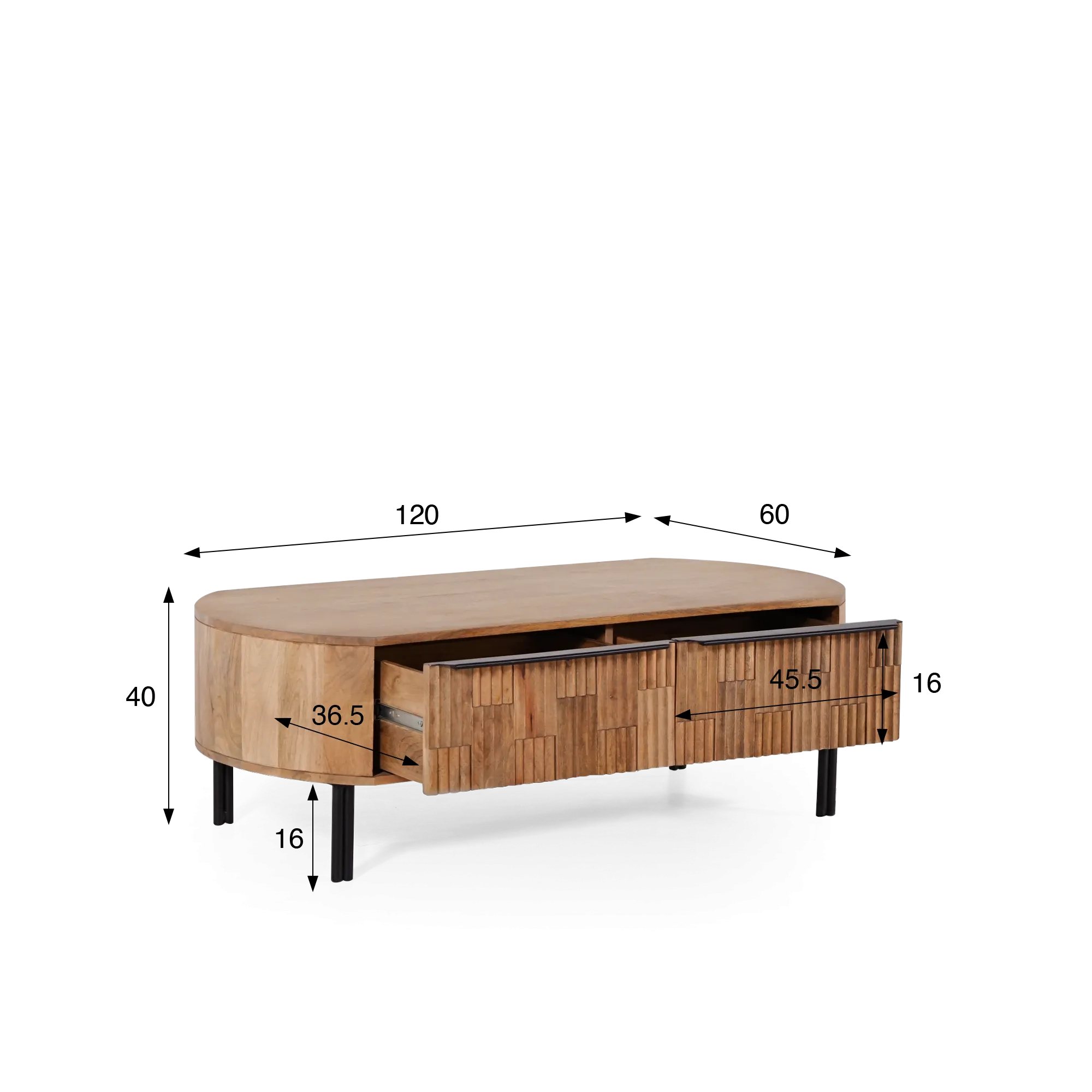 Lors du développement de cette table basse en bois de manguier massif, nos designers ont cherché à conjuguer esthétique et praticité. Les deux tiroirs, d’une profondeur utile de 36,5 cm et d’une hauteur de 16 cm, permettent de dissimuler télécommandes, livres ou petits accessoires du quotidien. Les poignées discrètes, en métal noir, soulignent la ligne du plateau et rappellent les pieds cylindriques en métal qui soutiennent l’ensemble avec finesse et stabilité.