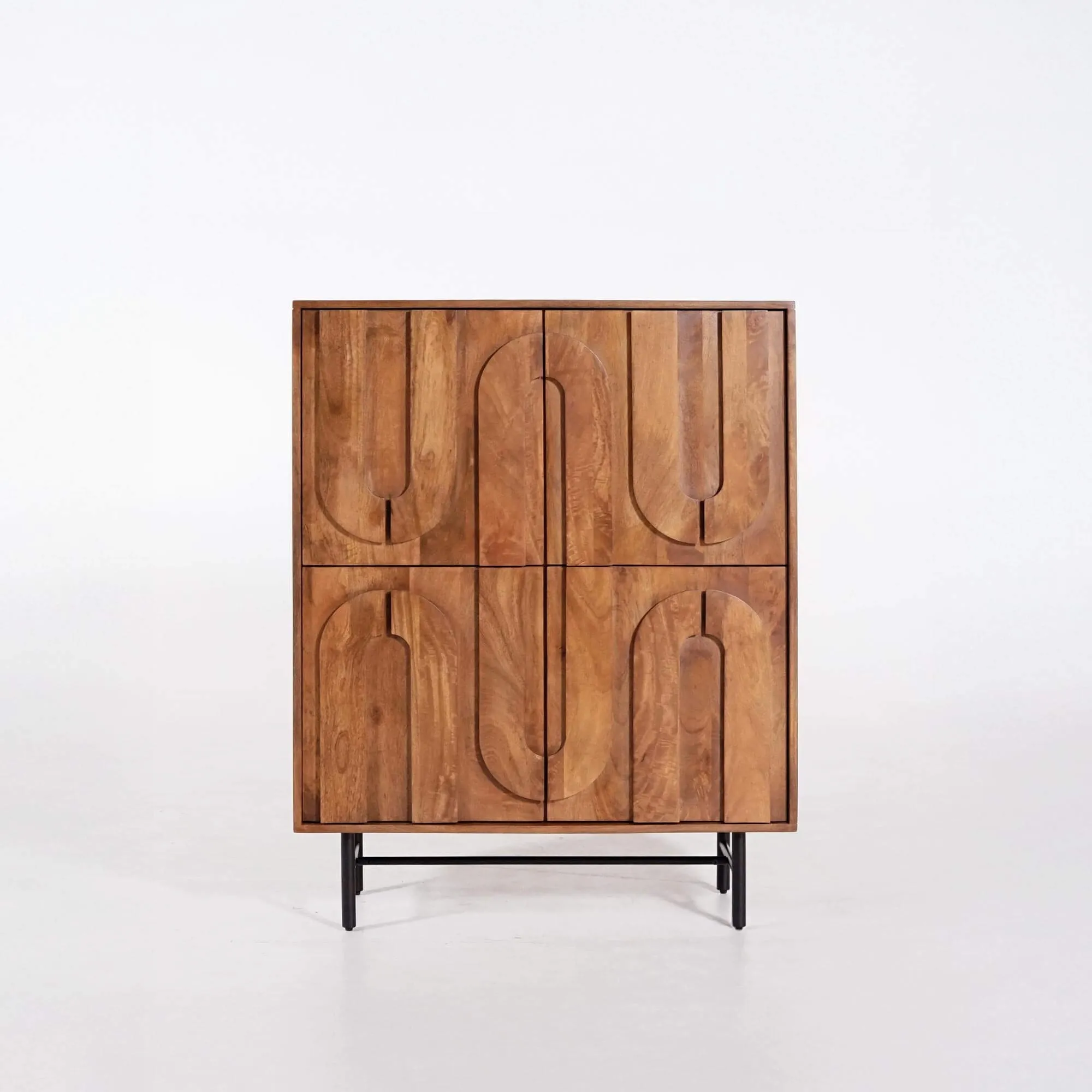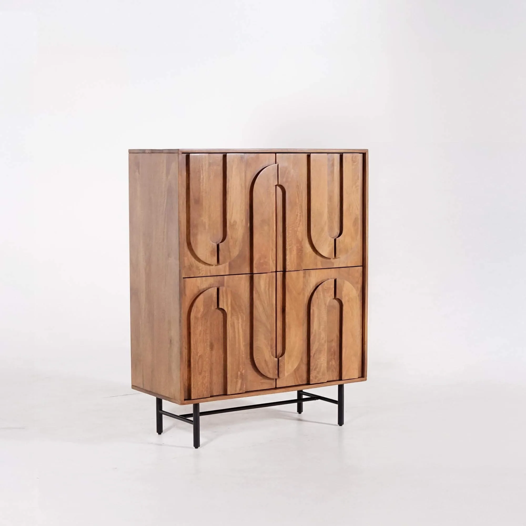 Fabriqué en bois massif de manguier, chaque panneau est soigneusement façonné, révélant un veinage riche et profond, mis en valeur par une finition satinée qui souligne la chaleur naturelle du matériau. Le bois de manguier, reconnu pour sa densité et sa durabilité, confère à ce meuble bar en bois massif une solidité remarquable tout en conservant une douceur au toucher. L’ensemble repose sur une structure en métal noir sobre et fine, qui élève la pièce et apporte une touche contemporaine à son allure chaleureuse.