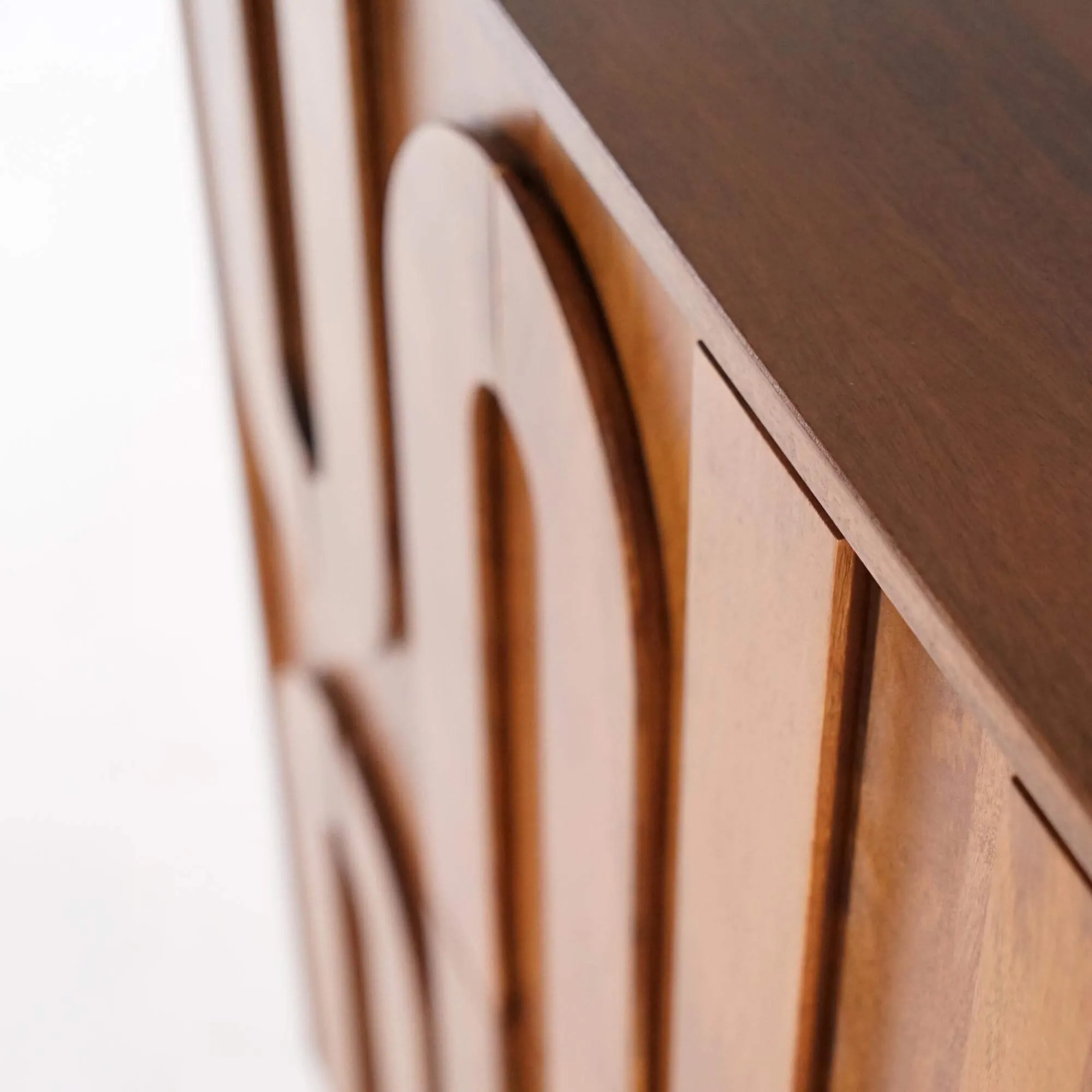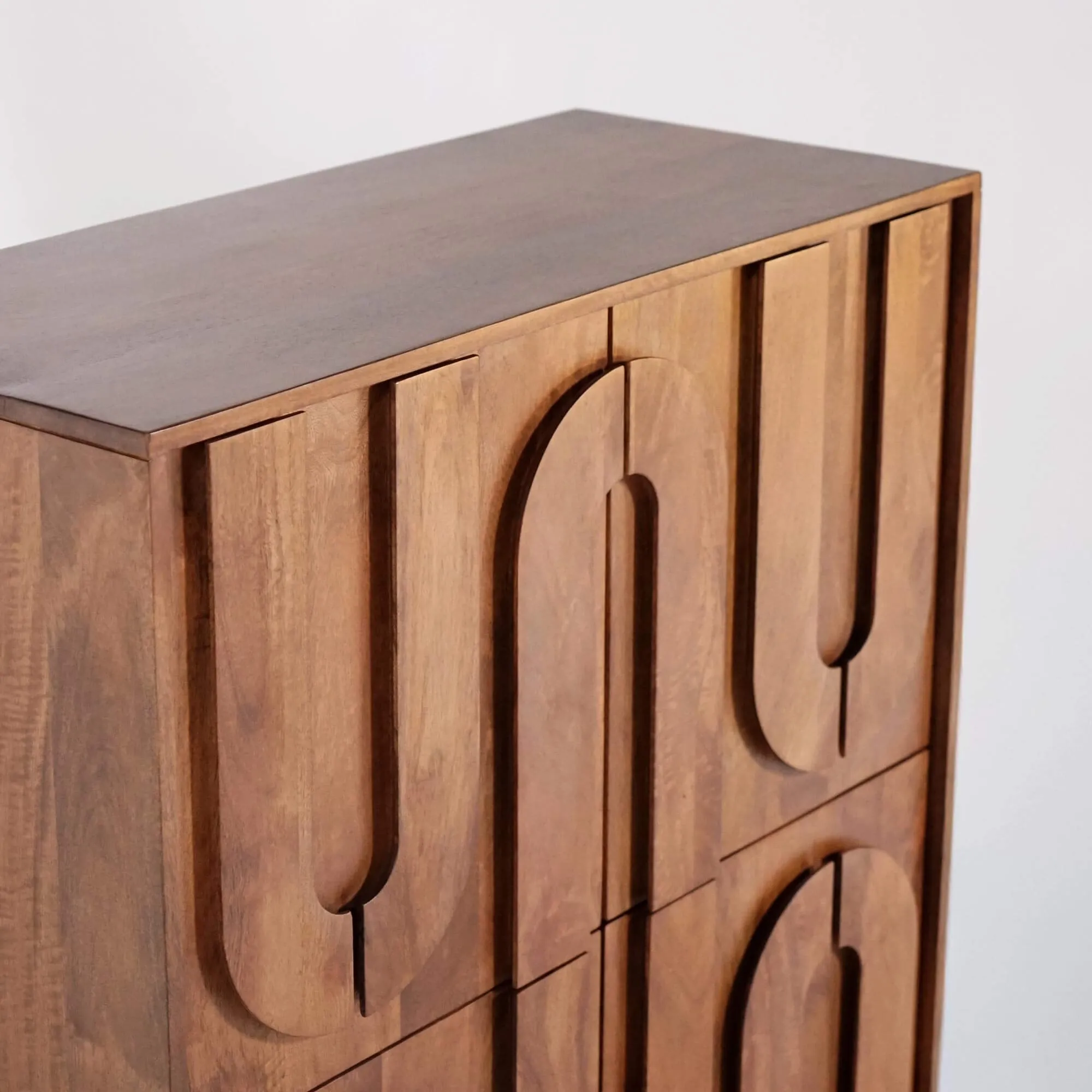 Nos designers ont imaginé le meuble bar en bois massif Flow comme une pièce sculpturale, pensée pour allier fonctionnalité et esthétique. Son design unique, marqué par des reliefs géométriques taillés directement dans le bois, évoque une œuvre artisanale à la croisée du design moderne et de l’inspiration ethnique.