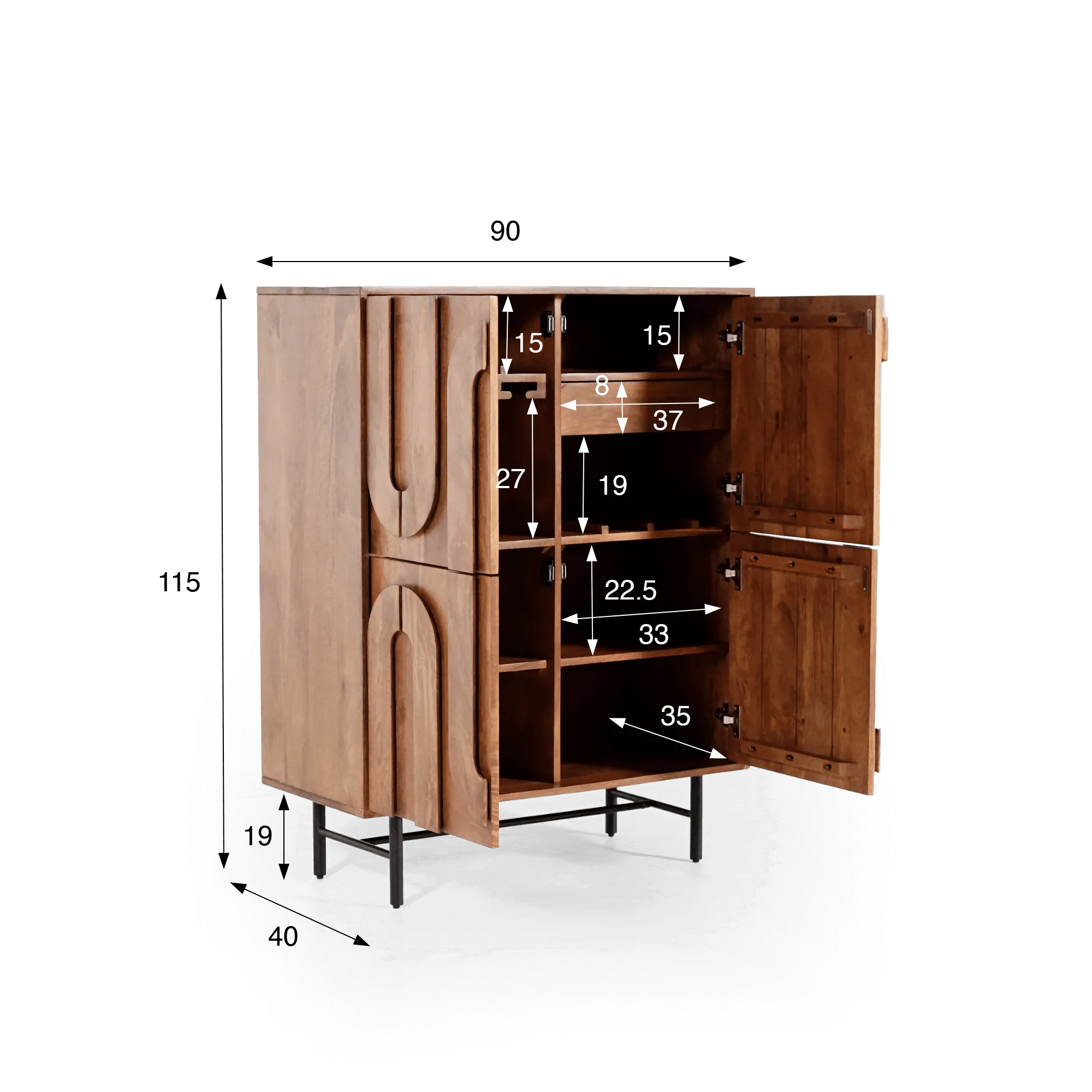 Avec ses dimensions de 90 cm de large, 45 cm de profondeur et 116 cm de haut, ce meuble bar en bois massif trouve naturellement sa place dans un salon ou une salle à manger, où il devient immédiatement un point focal. Son piètement métallique de 19 cm de hauteur allège visuellement la structure tout en assurant une parfaite stabilité.