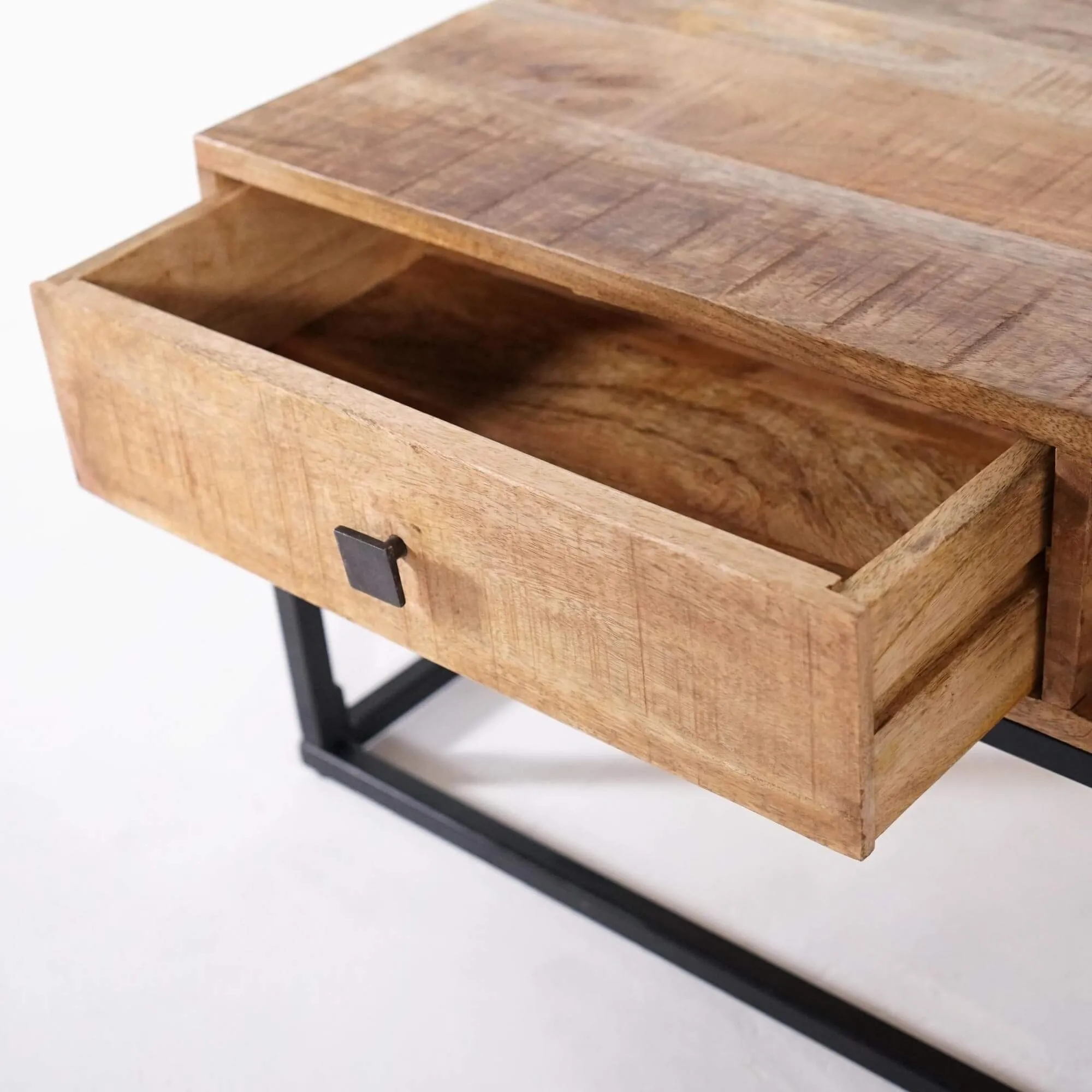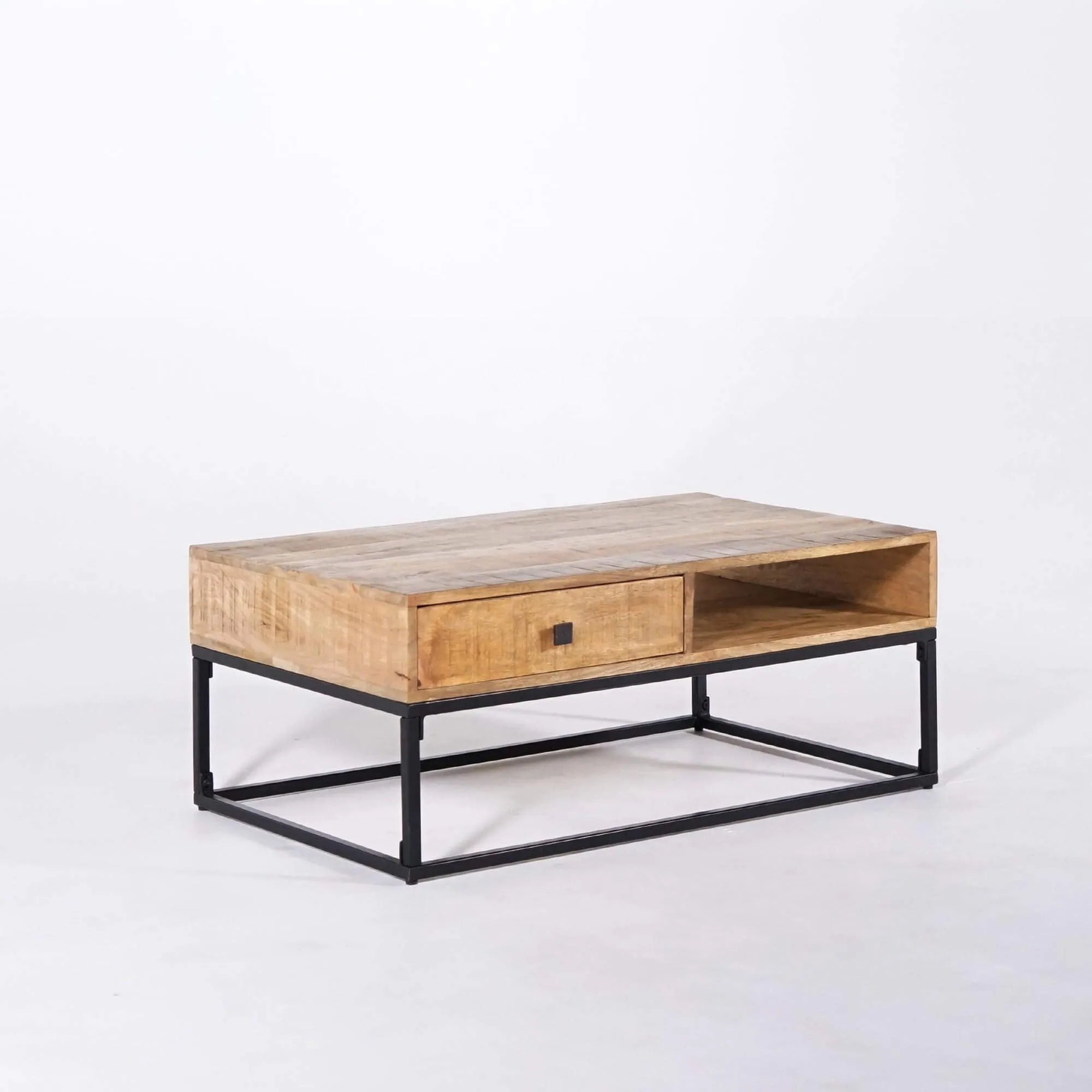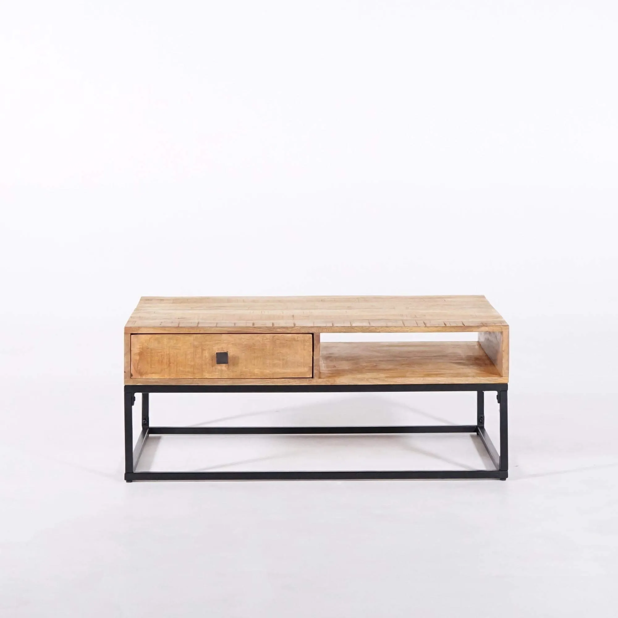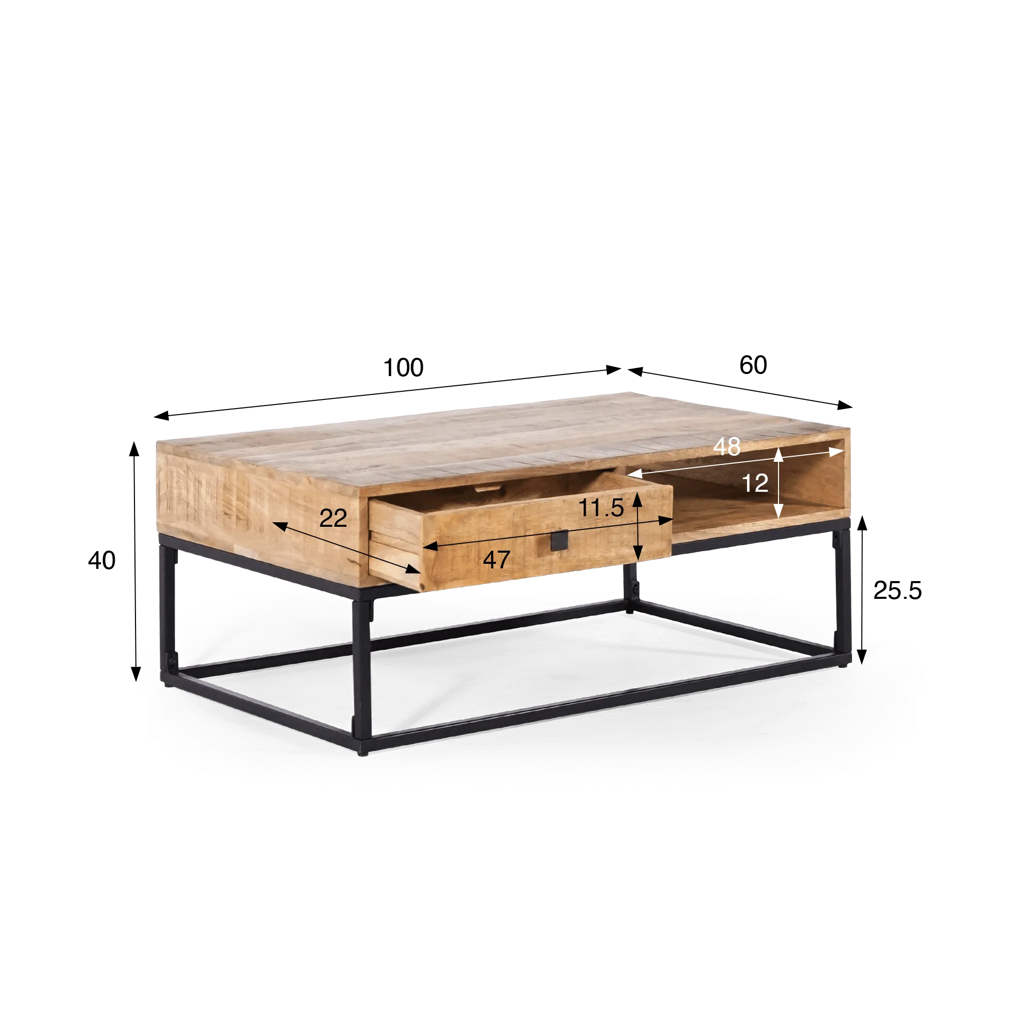Le rangement dans cette table basse en bois massif de manguier et structure en métal a été pensé pour accompagner la vie quotidienne, sans jamais alourdir la silhouette. Les deux tiroirs, disposés de part et d’autre, offrent un espace discret pour télécommandes ou accessoires. Chacun présente une largeur utile d’environ 47 cm pour une profondeur de 22 cm, une dimension idéale pour accueillir les objets du quotidien tout en restant facile d’accès. À leurs côtés, un large compartiment ouvert de 48 × 12 cm permet de glisser magazines ou livres, apportant une organisation naturelle au salon.