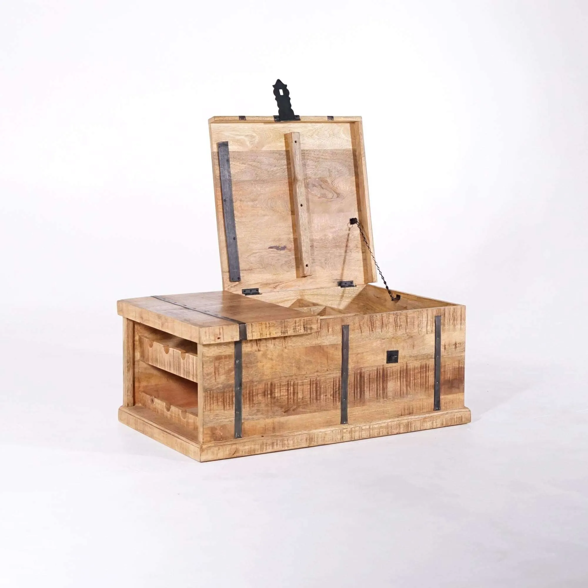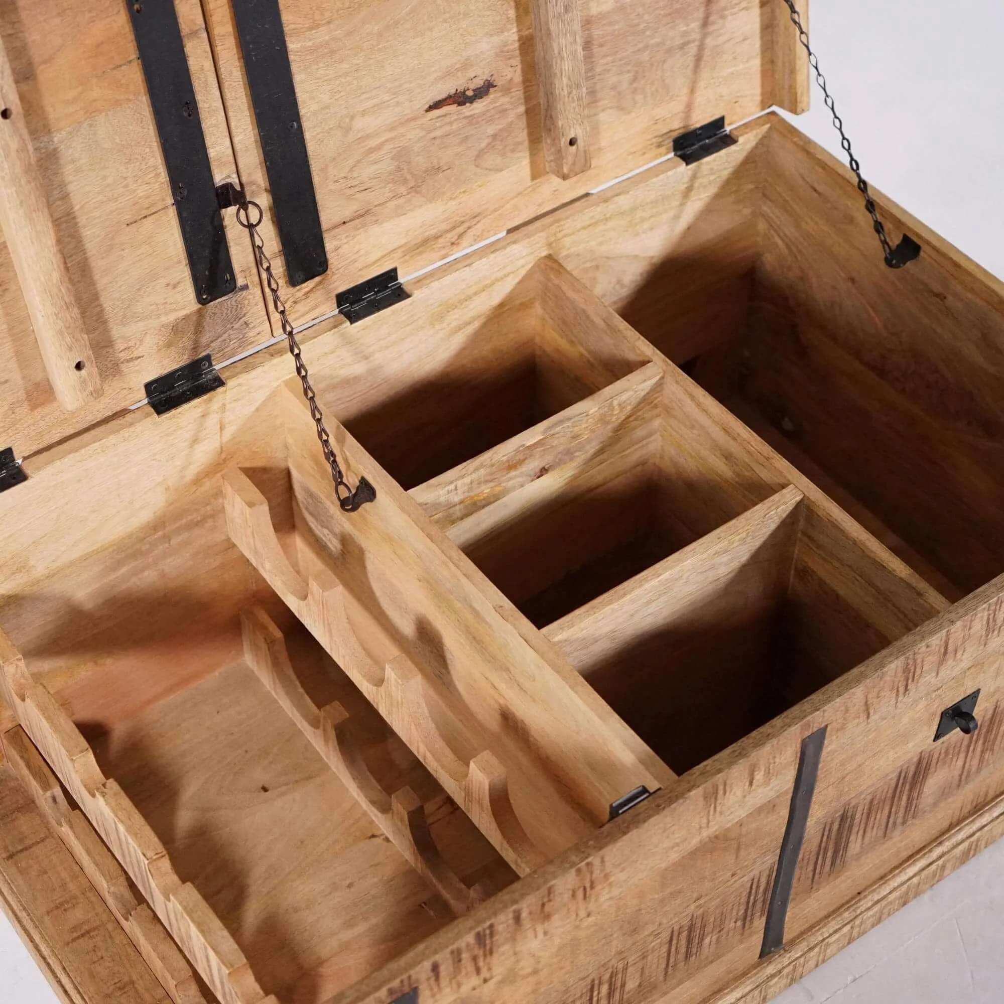 En concevant ce modèle de table de salon coffre de rangement en bois massif, nous voulions offrir plus qu’une simple table basse : un meuble pensé pour les moments de partage, les soirées improvisées, les espaces à vivre. Son grand plateau d'un format généreux de 100 x 60 cm accueille aisément verres, livres ou décoration, tandis que l’intérieur révèle une organisation soignée imaginée pour faciliter le quotidien. Les compartiments accessibles sous la partie plus large du plateau de cette table de salon coffre de rangement en bois massif, profonds d’environ 37 cm, sont structurés pour permettre de ranger facilement verres à vin, livre ou accessoires et les garder bien en place. L'autre compartiment fait office de cave à vin. Deux rangées dédiées peuvent accueillir jusqu'à 6 bouteilles : une solution pratique, discrète et particulièrement appréciée lors des repas en famille ou entre amis.