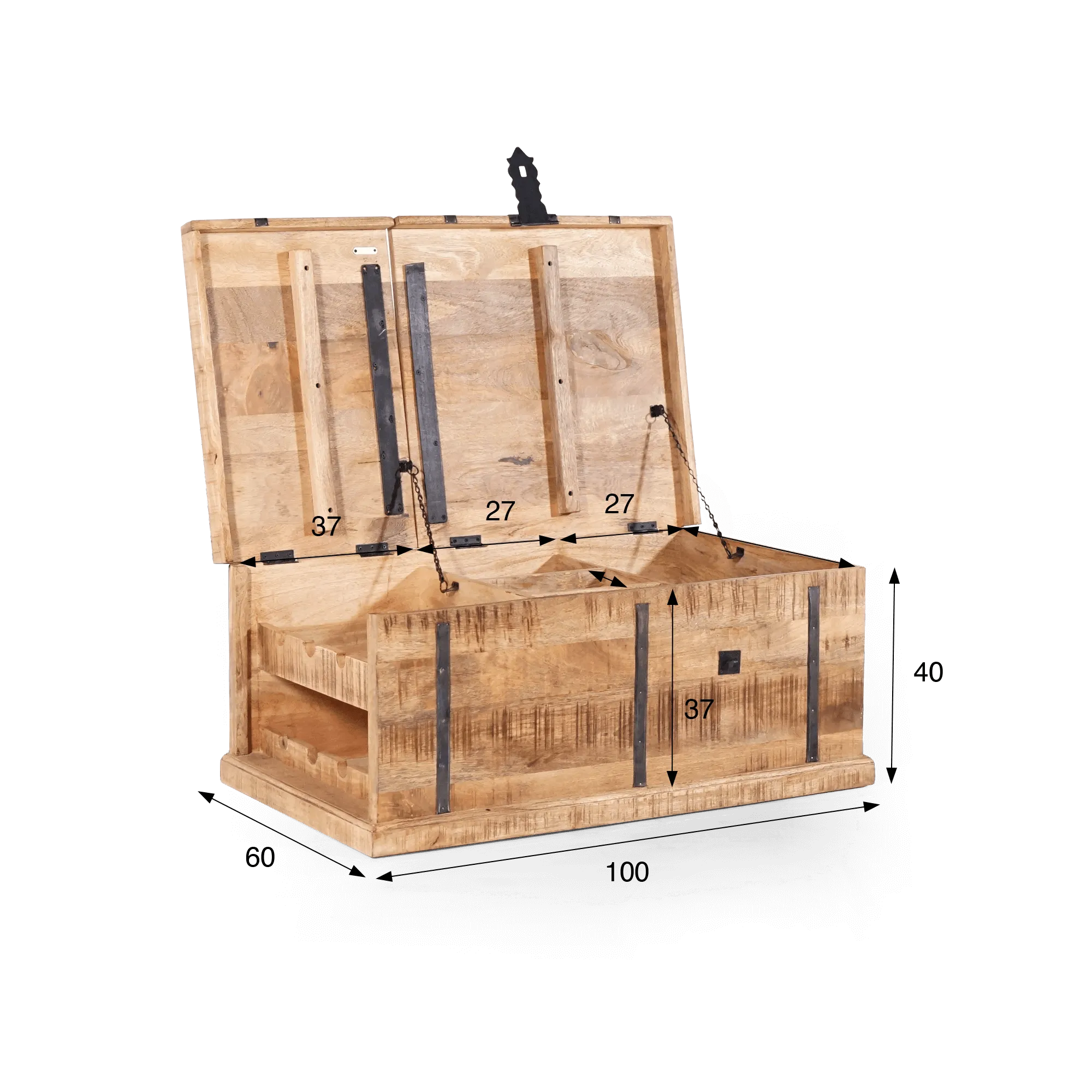 Les ferronneries en métal noir qui habillent cette table de salon coffre de rangement en bois massif, forgées artisanalement, soulignent la structure en bois et renforcent le caractère authentique de la pièce. Chaque détail – du système d’ouverture à chaînes à la finesse des renforts métalliques – a été conçu pour durer, avec ce souci de praticité et de simplicité qui guide nos créations.
