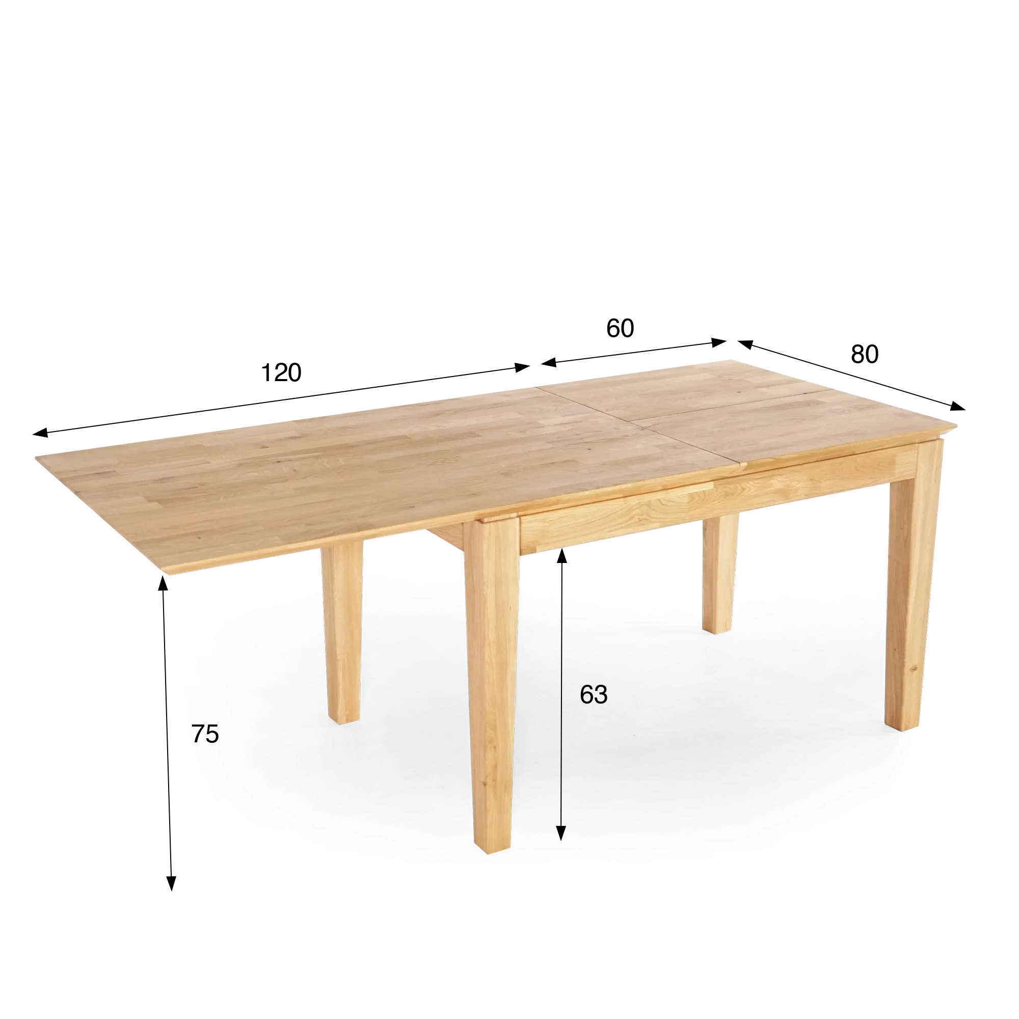Table à manger rectangulaire en bois de chêne 120 x 80 cm avec allonge de 60 cm