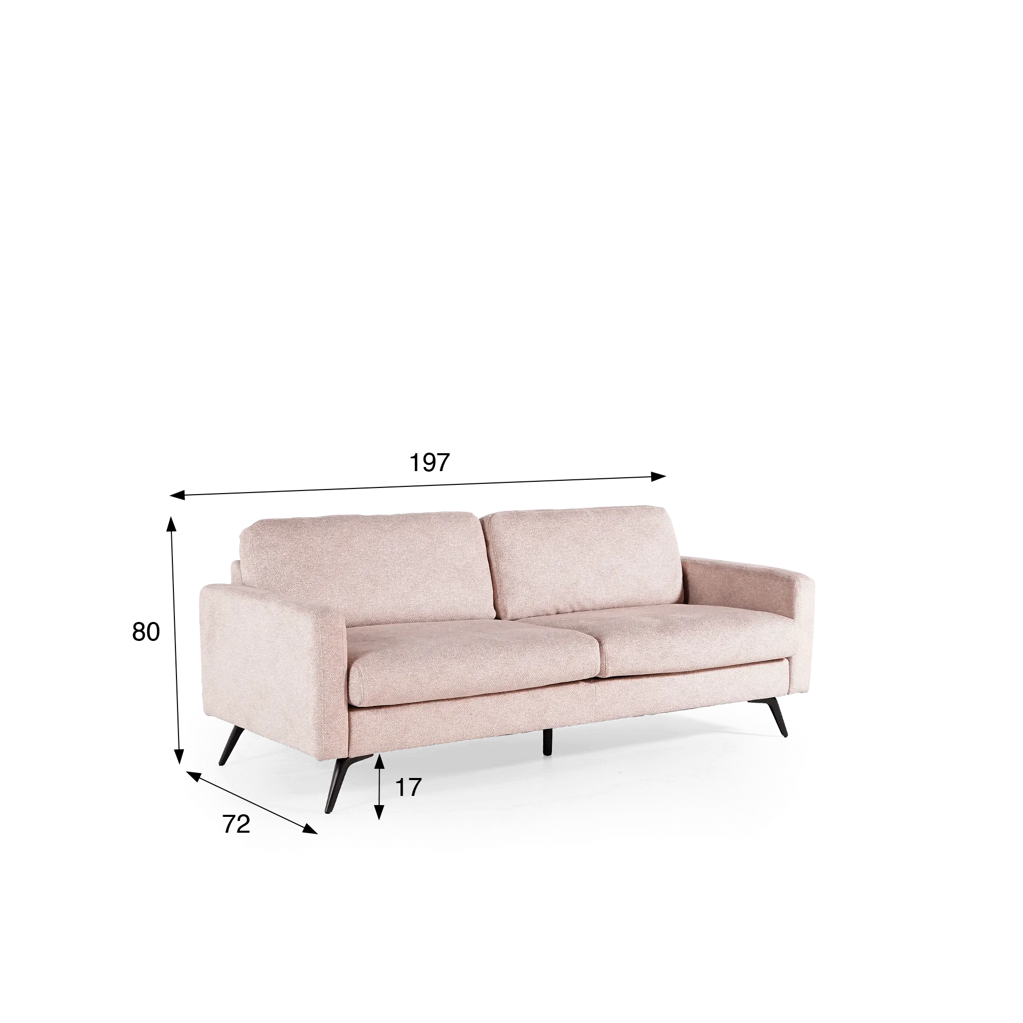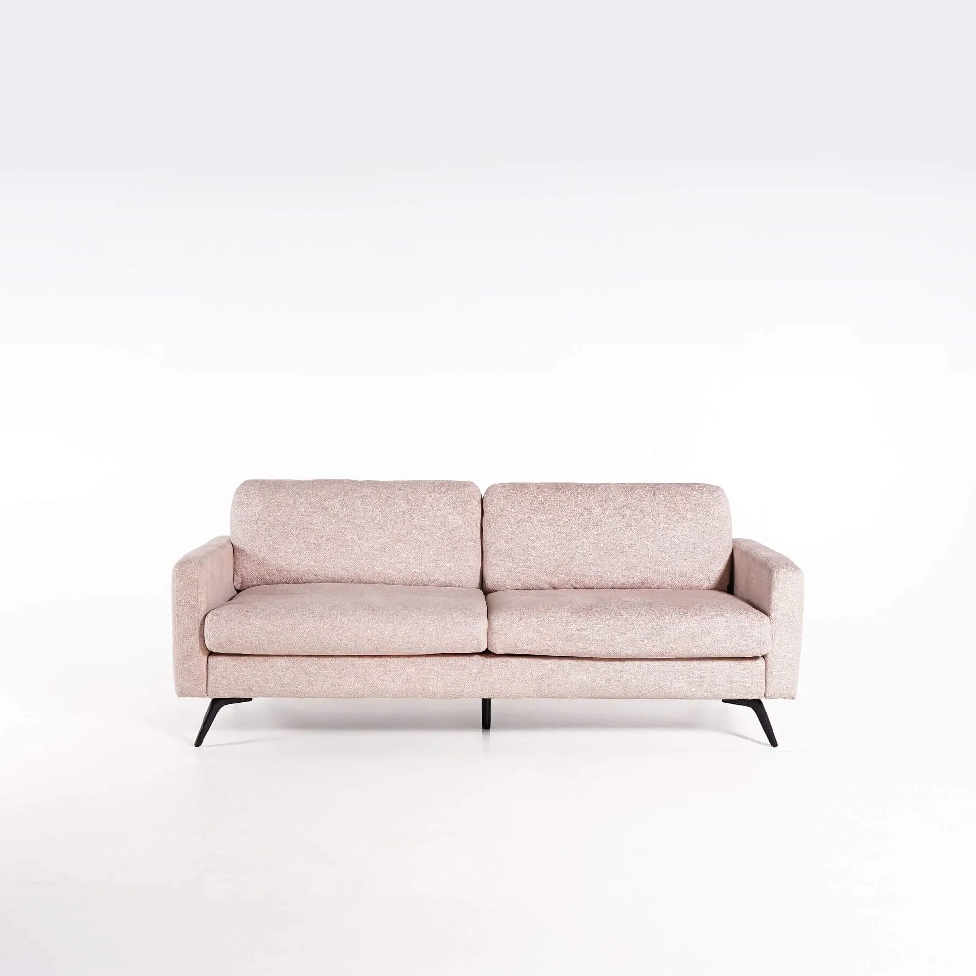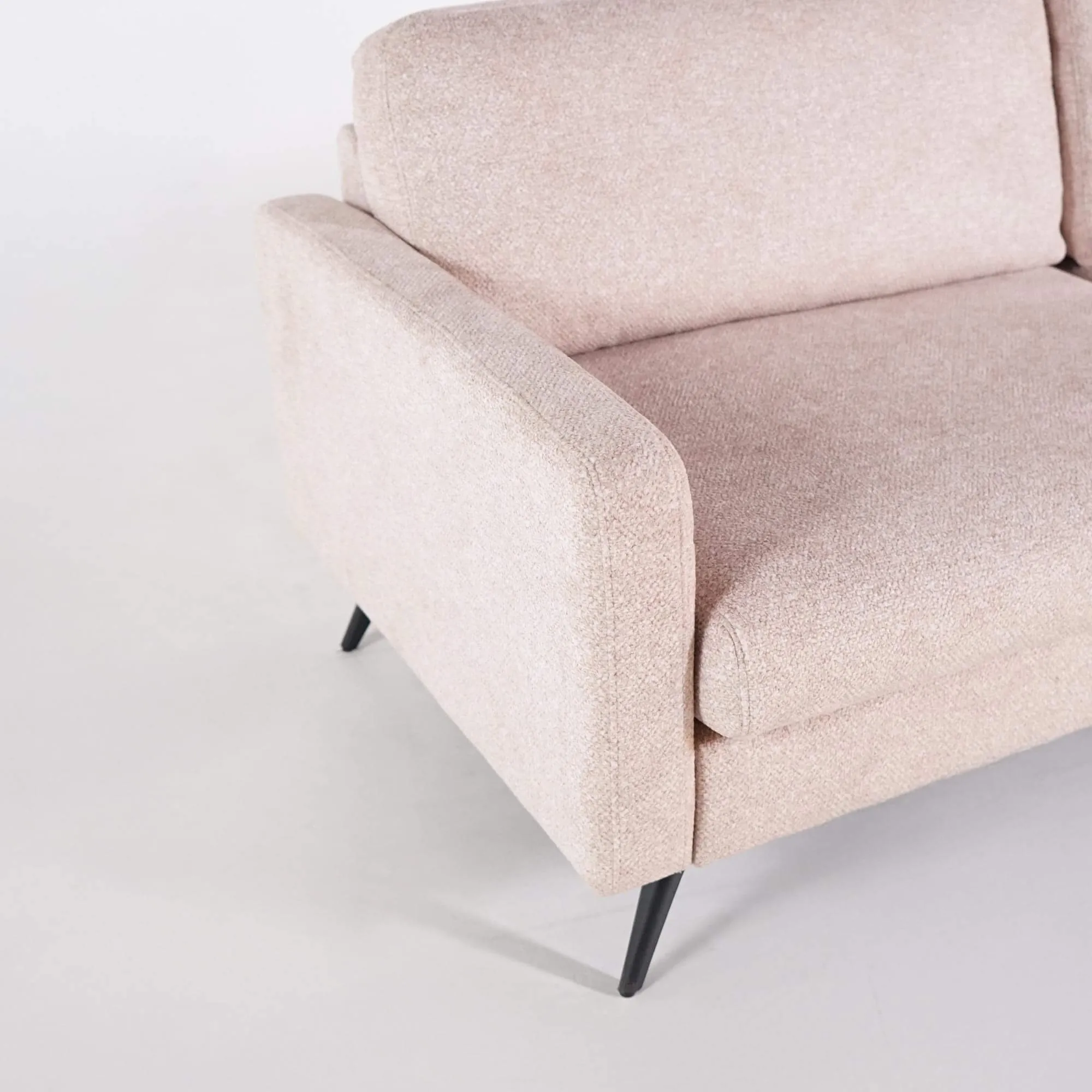 La structure du canapé design 3 places Siena repose sur des pieds en métal noir au design élancé, contrastant subtilement avec la teinte sable du tissu. Leur forme légèrement inclinée confère à l’ensemble une allure aérienne, tout en assurant une excellente stabilité. Le garnissage de haute qualité, réalisé de manière artisanale, offre une assise moelleuse et un maintien agréable, idéal pour de longs moments de détente.
