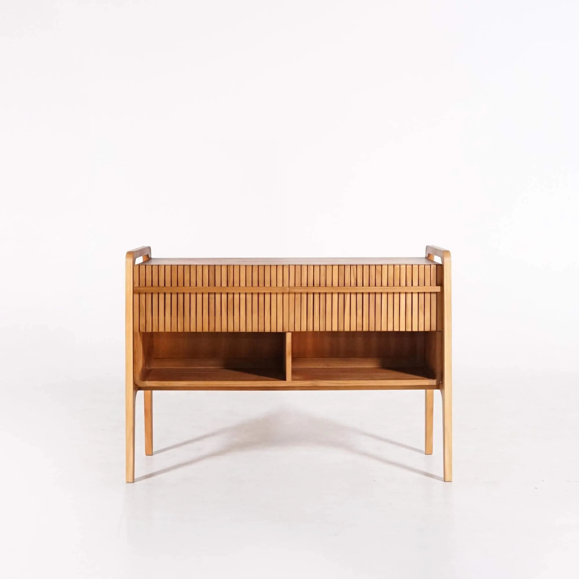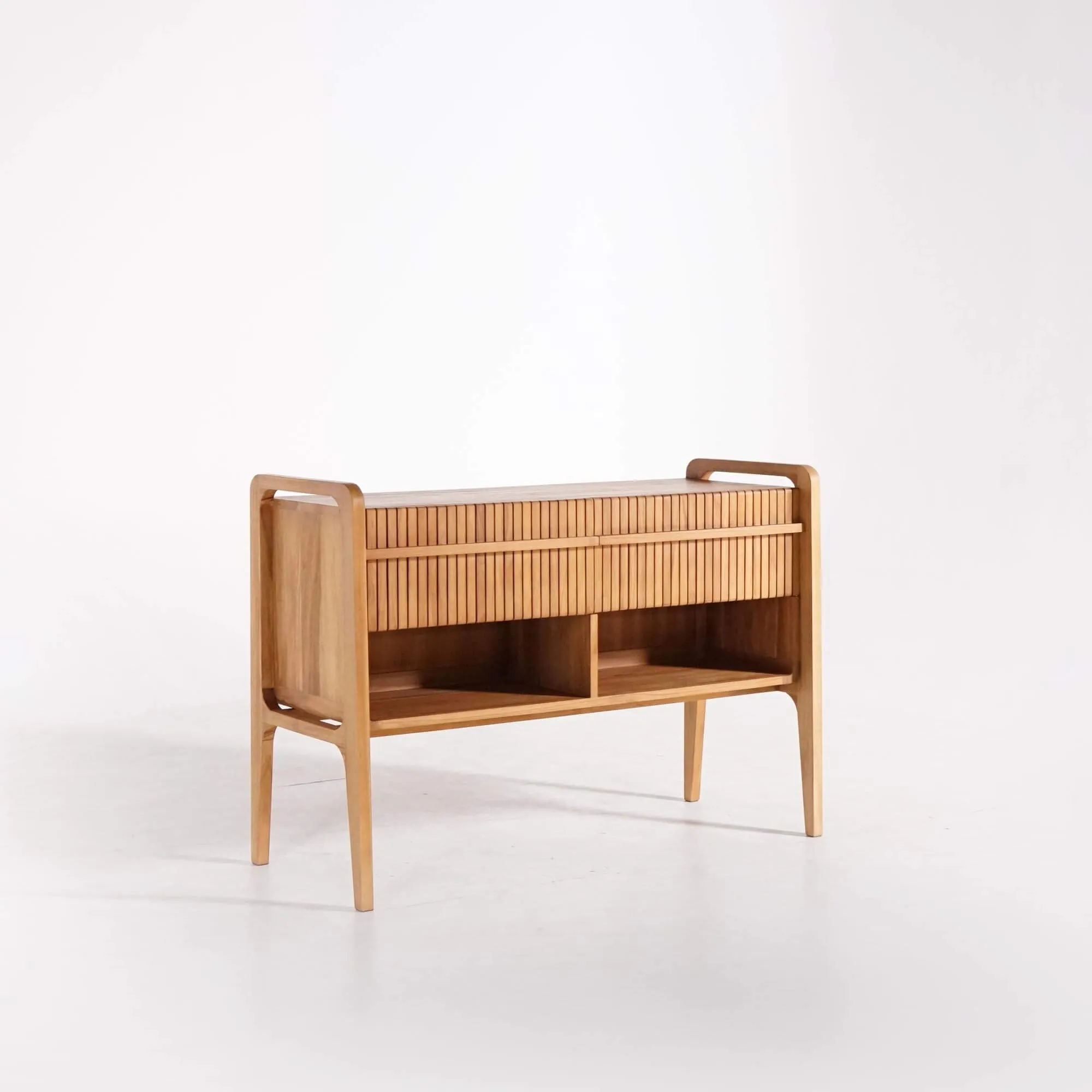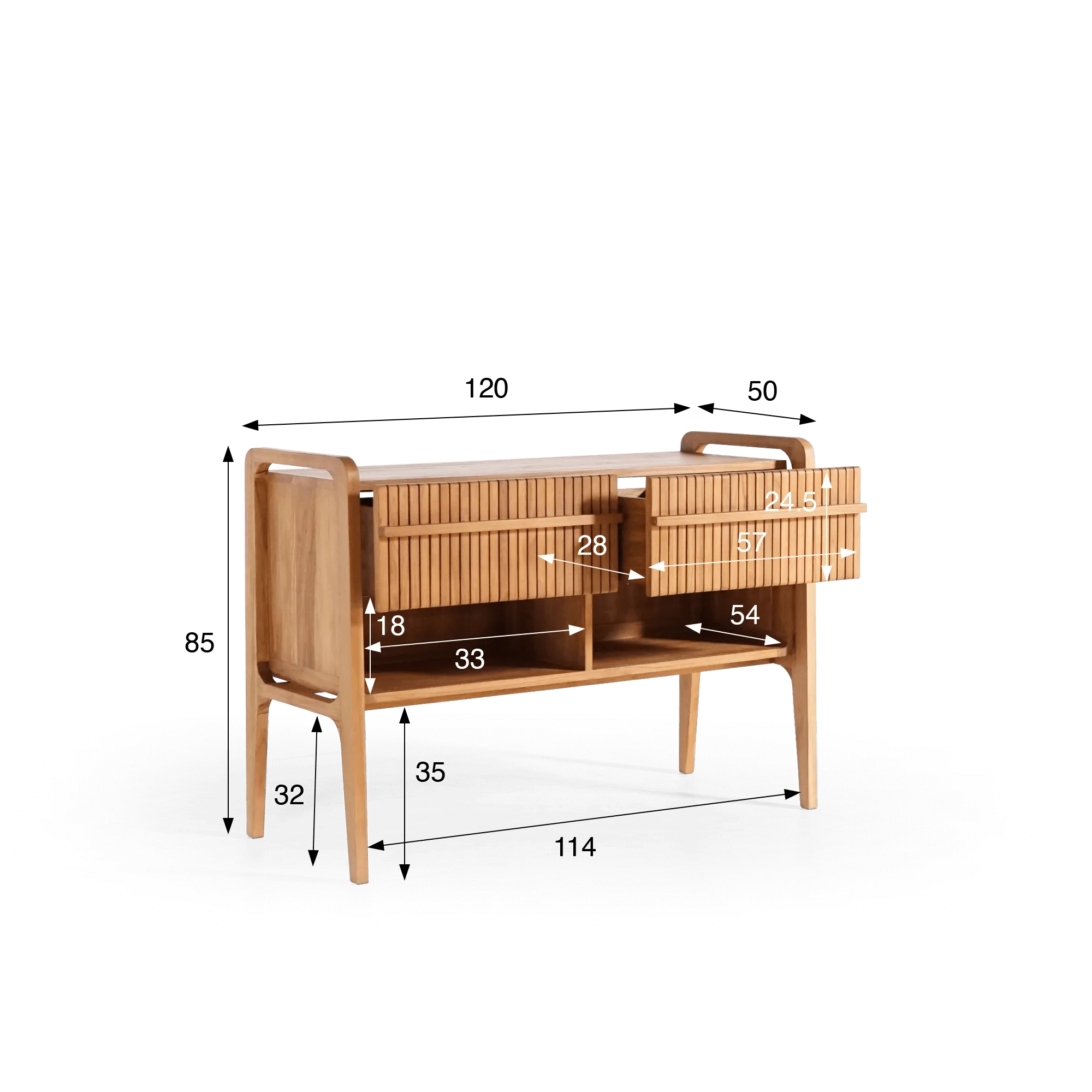 Fabriqué en bois massif de teck, reconnu pour sa résistance naturelle à l’humidité et son toucher soyeux, ce meuble de salle de bain bois teck massif double vasque conjugue esthétique et durabilité. Sa silhouette fluide, ponctuée d’angles adoucis et de contours arrondis, incarne l’esprit Japandi, ce mélange subtil entre rigueur japonaise et douceur scandinave. La façade à lames verticales offre un jeu de lumière et de texture qui anime la surface du bois, tout en dissimulant deux tiroirs spacieux à fermeture soft close. Chacun d’eux, d’une largeur de 57 cm pour une profondeur de 28 cm et une hauteur de 24,5 cm, accueille aisément vos accessoires de bain, textiles ou produits de soin.