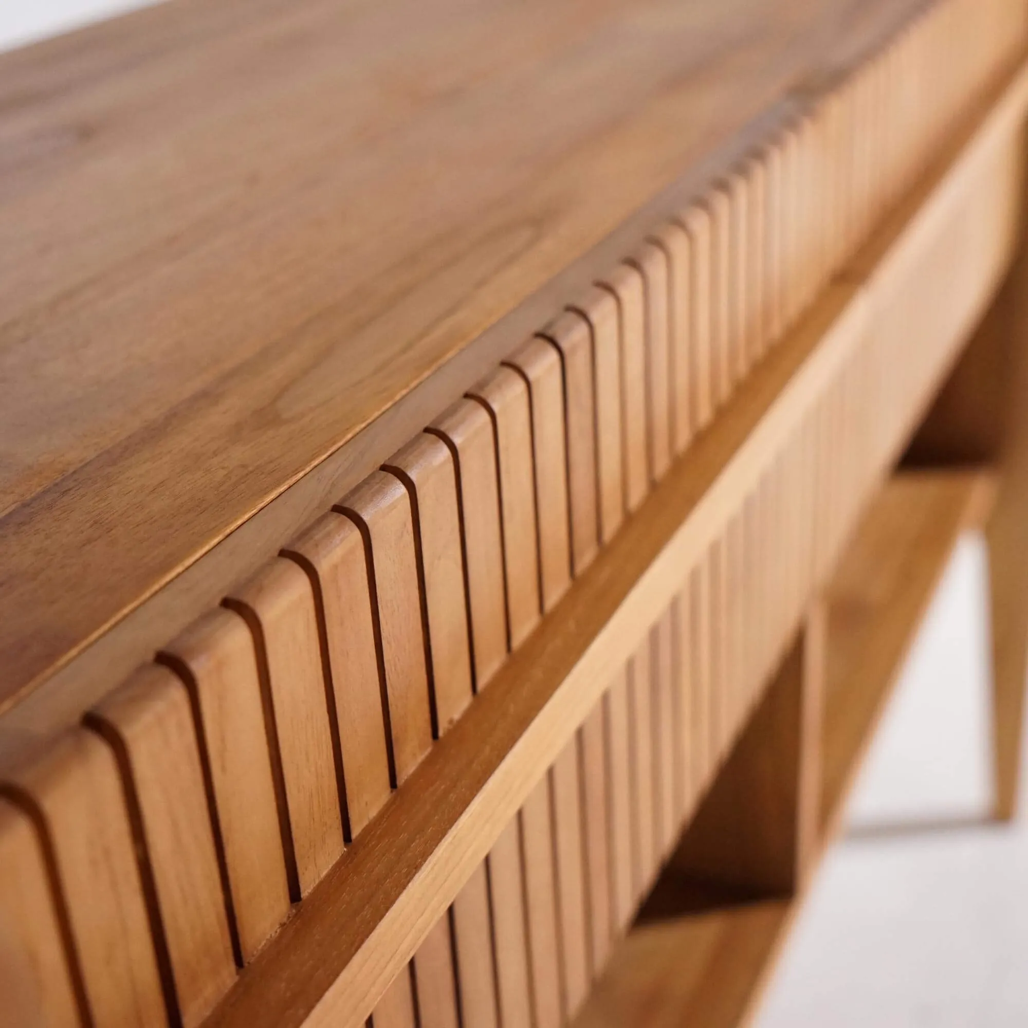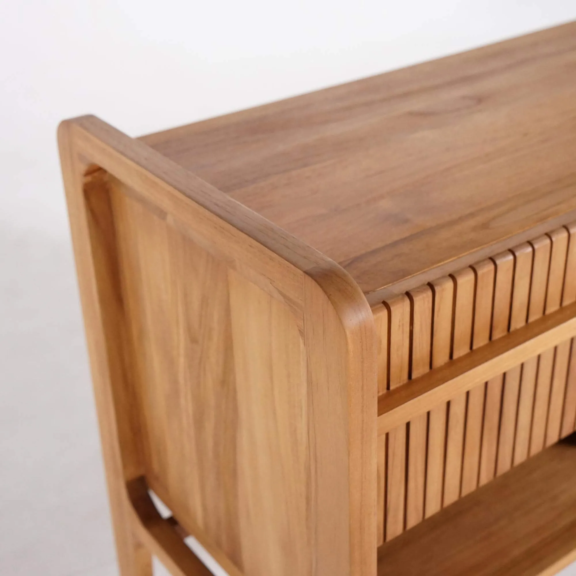 Nous avons imaginé le meuble de salle de bain bois teck massif double vasque Devika comme une pièce d’équilibre entre nature et modernité, où la pureté des lignes dialogue avec la chaleur du teck massif. Chaque courbe, chaque rainure, chaque détail de finition a été pensé pour créer une présence douce et affirmée à la fois — un meuble qui structure l’espace tout en apportant une sensation de calme et d’harmonie.